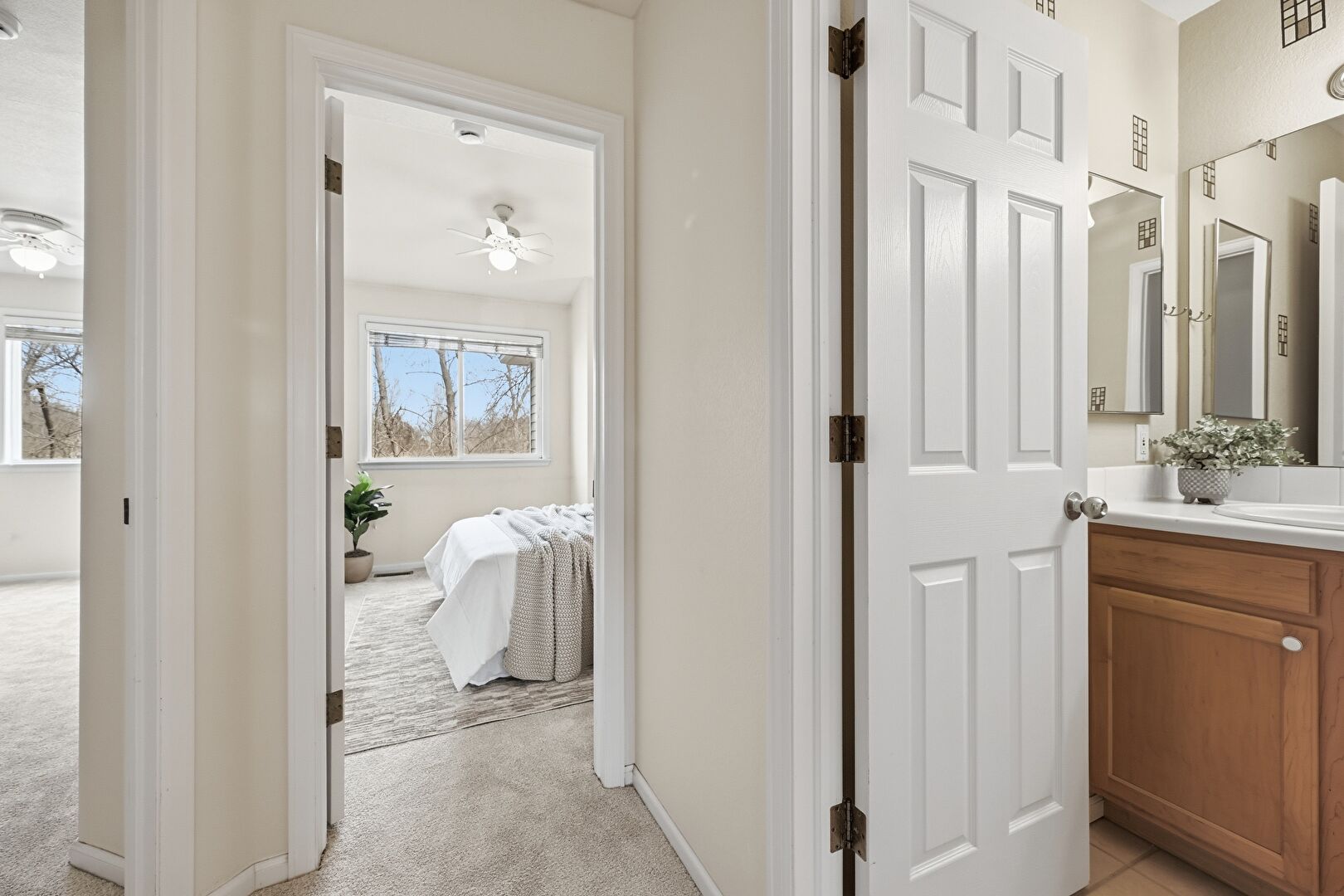 Baseboards Wall, Carpet, Ceiling Fan, Drywall, Ensuite Bathroom, Natural Light, Smoke Carbon Monoxide Detector, Vanity, Vent, Carpet, Smoke Carbon Monoxide Detector