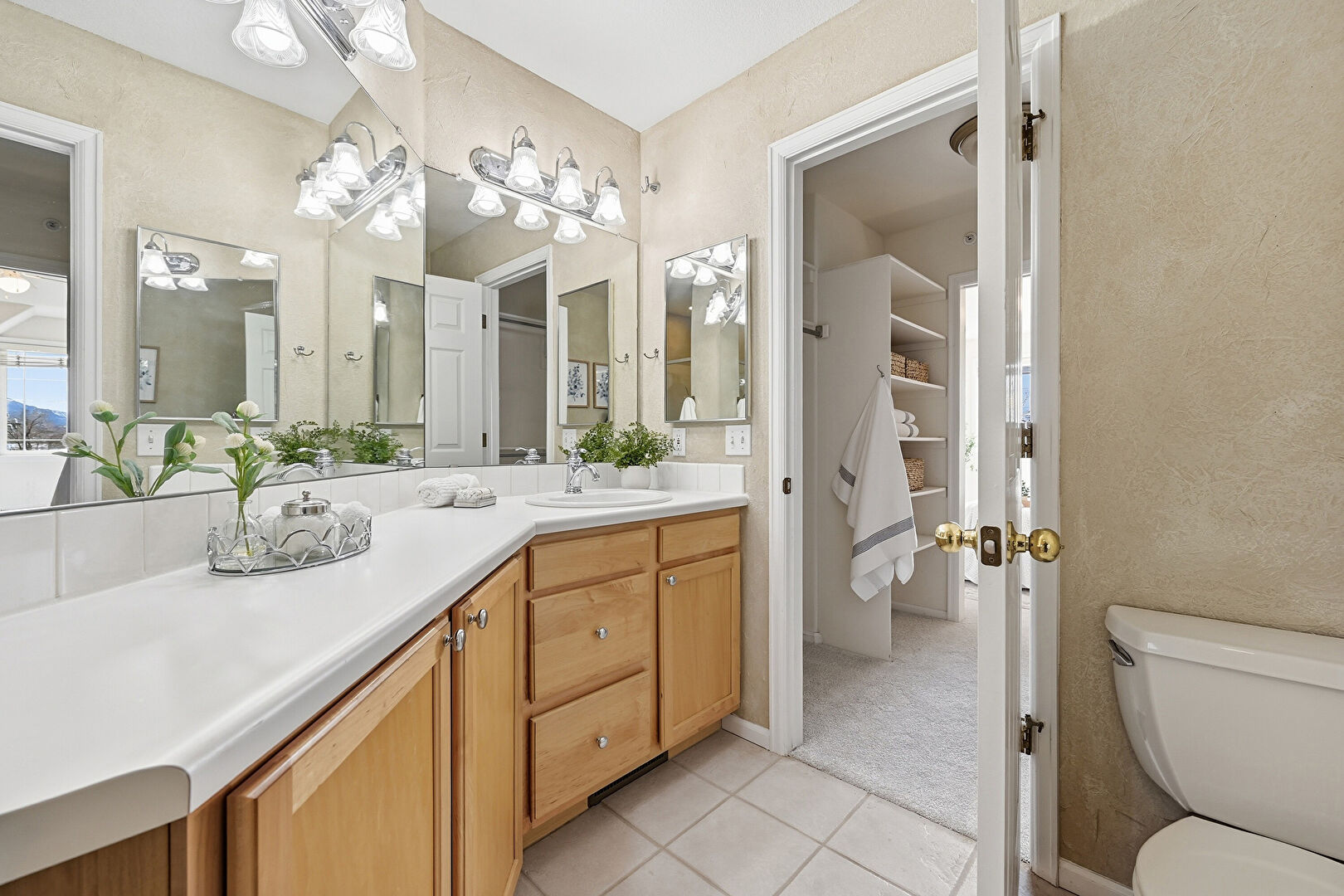 Baseboards Wall, Carpet, Closet, French Doors, Full Bathroom, Recessed Lighting, Textured Wall, Tile Floor, Vanity, Vent, Walk In Closet, Full Bathroom, Tile Floor