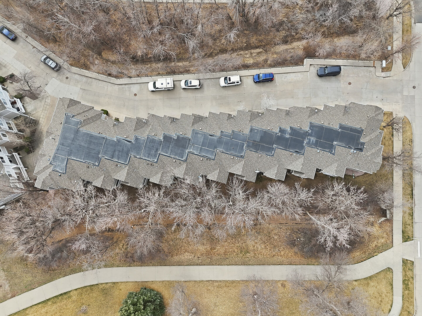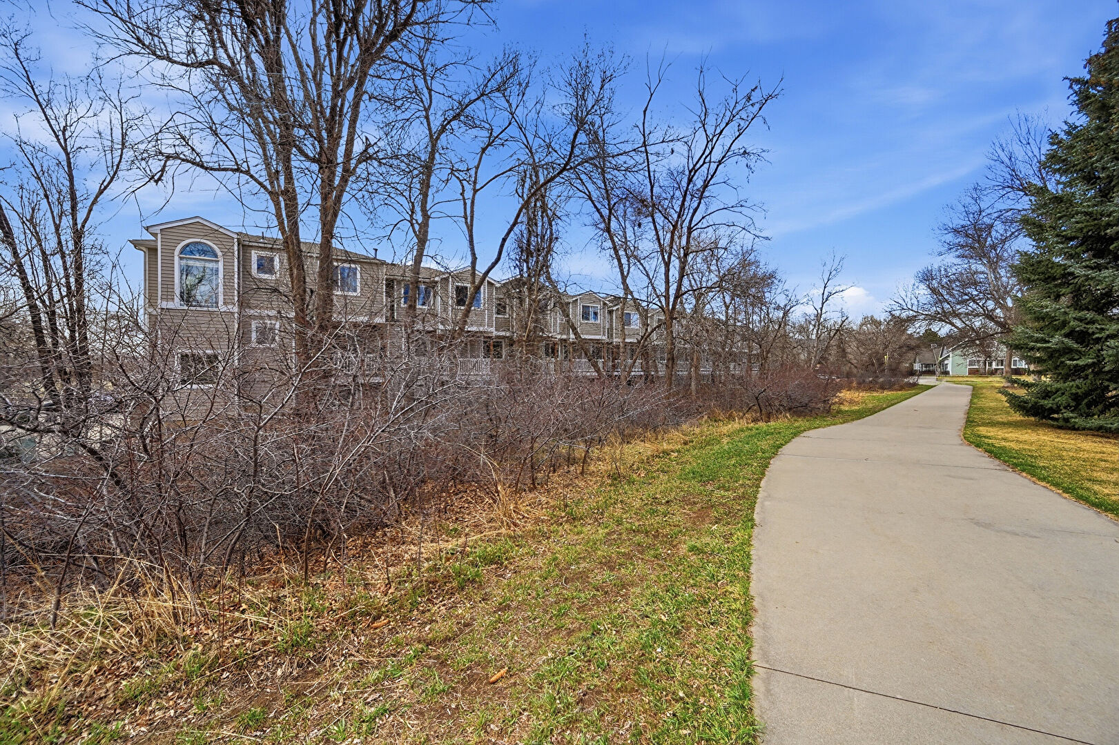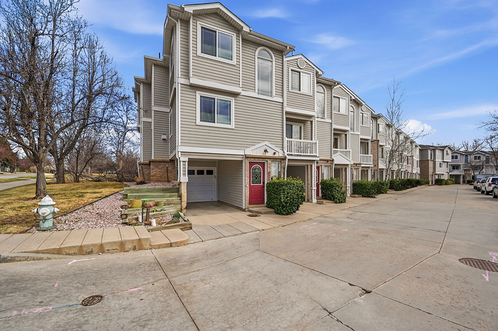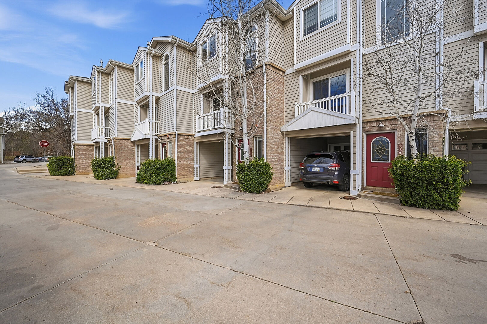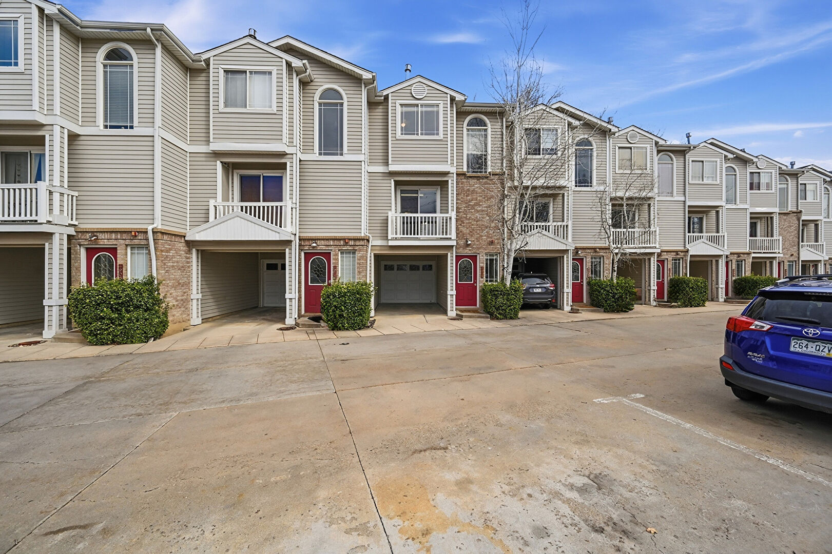 Apartment Complex View, Brick Siding, Built In Garage, Driveway, Gutters, Horizontal Siding, Residential View, Built In Garage, Downspout, Garage