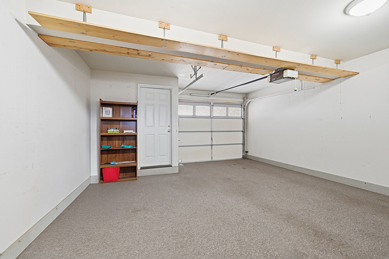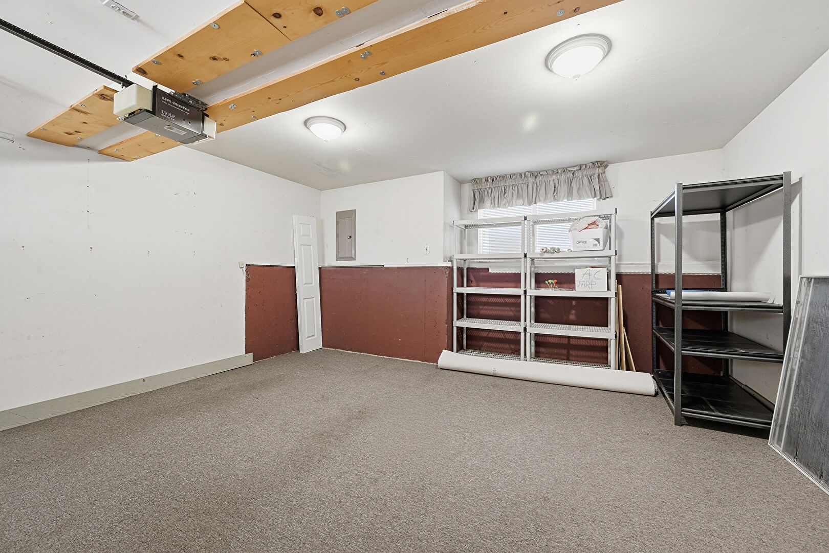 Baseboards Wall, Carpet, Drywall, Electric Panel, Garage, Garage Door Opener, Baseboards Wall, Natural Light