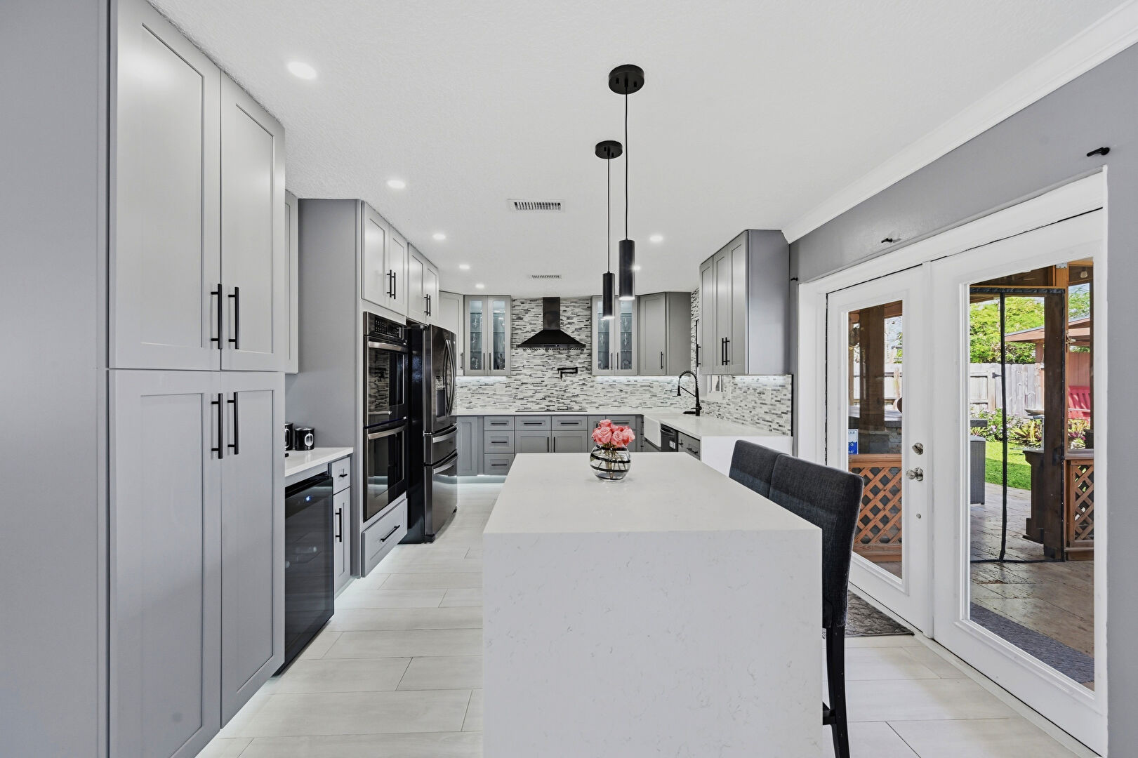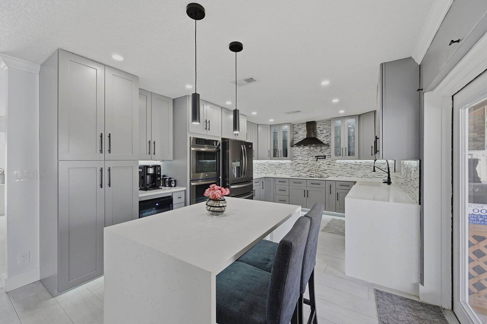 Baseboards Wall, Crown Molding, Double Oven, Drywall, French Doors, Glass Insert Cabinets, Gray Cabinets, Kitchen Bar, Kitchen Island, Natural Light, Opens To Living Area, Pendant Lighting, Pot Filler, Recessed Lighting, Shaker Cabinets, Stone Countertops, U Shaped Kitchen, Vent, Wine Cooler, Wood Finish Floor, Gray Cabinets, Kitchen Island, Recessed Lighting, Wine Cooler