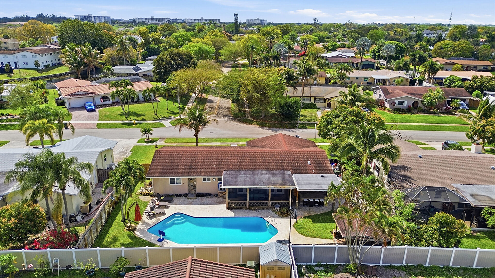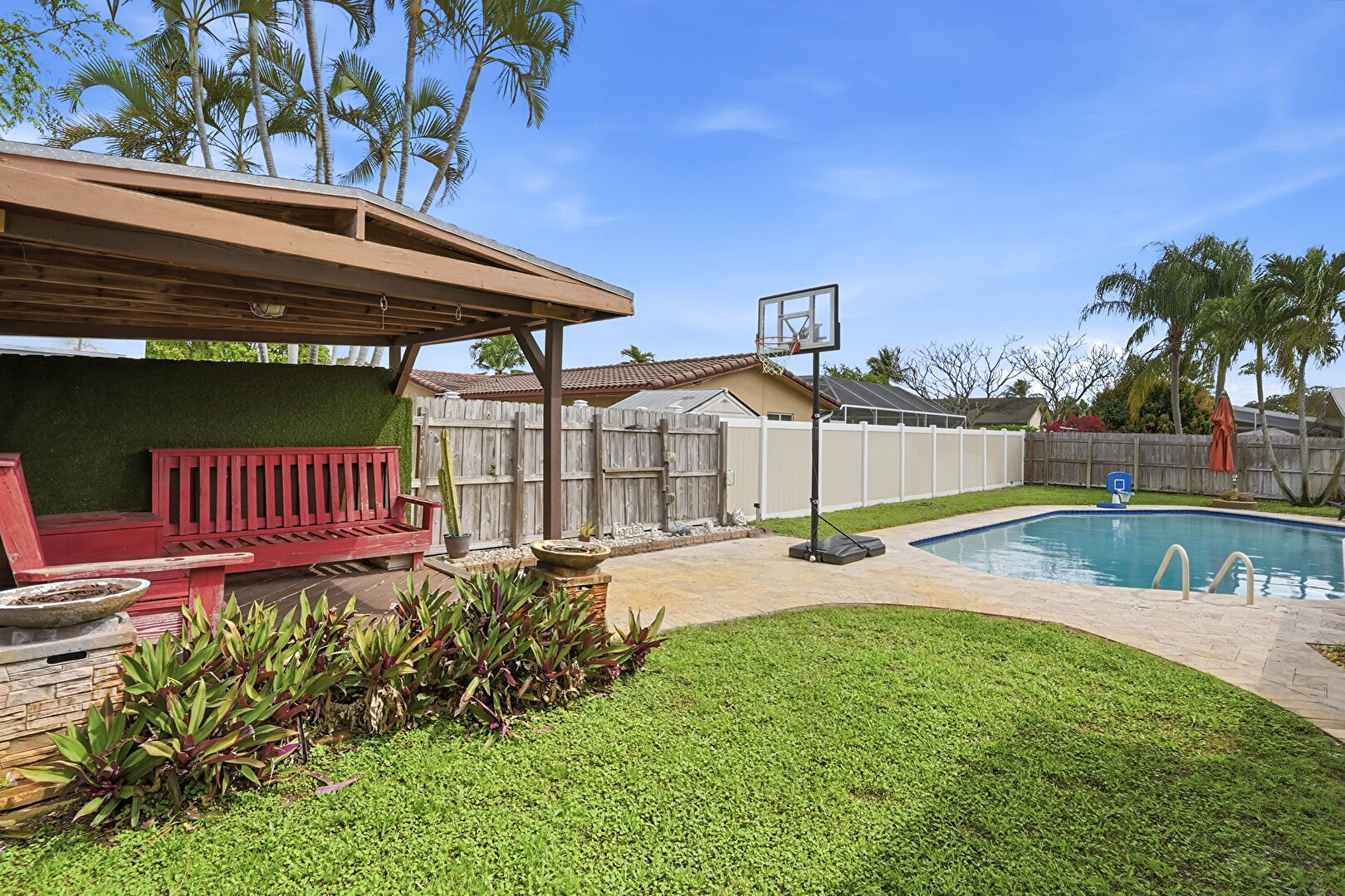 Downspout, Fence, Gutters, Lawn, Outdoor Bar, Patio, Pool, Pump, Satellite Dish, Stucco Siding, Sunroom, Fence, Handrail