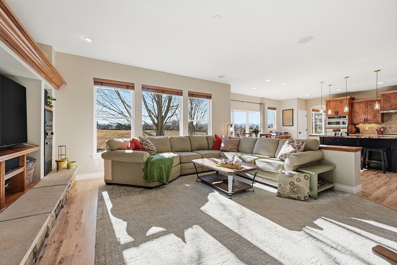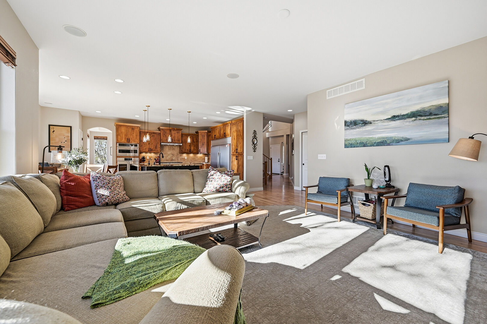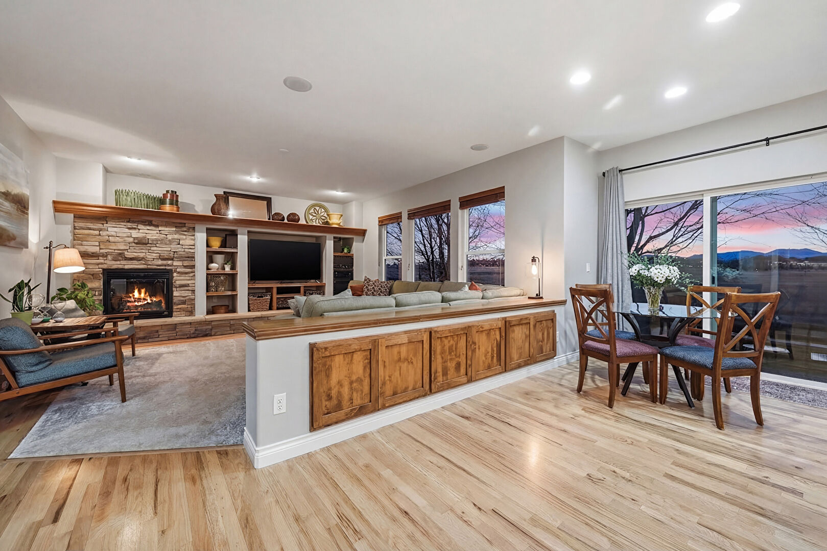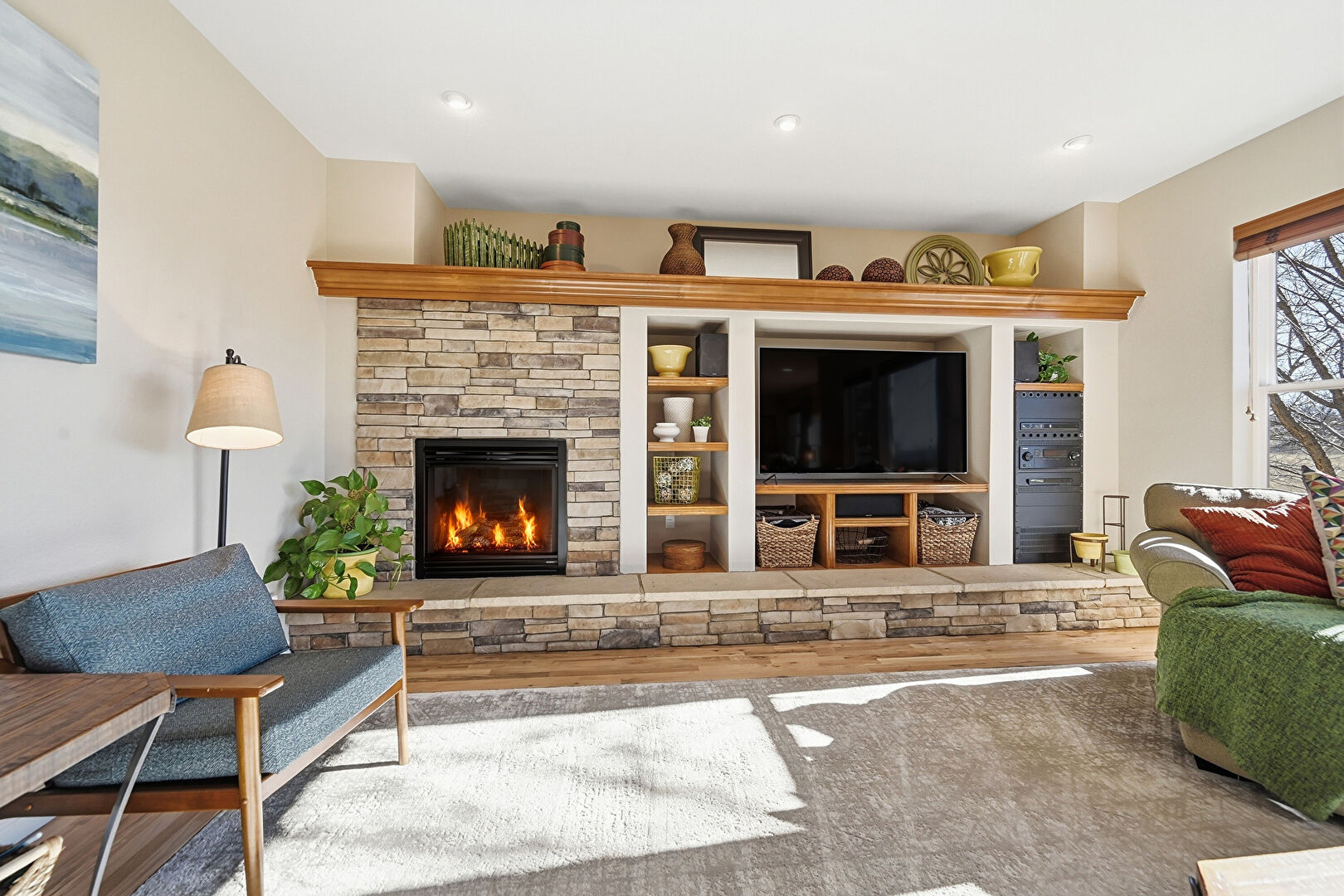 Arched Walkways, Baseboards Wall, Carpet, Double Oven, Drywall, Fireplace, L Shaped Kitchen, Natural Light, Recessed Lighting, Wood Finish Floor, Drywall, Natural Light, Recessed Lighting, Vent, Wood Finish Floor