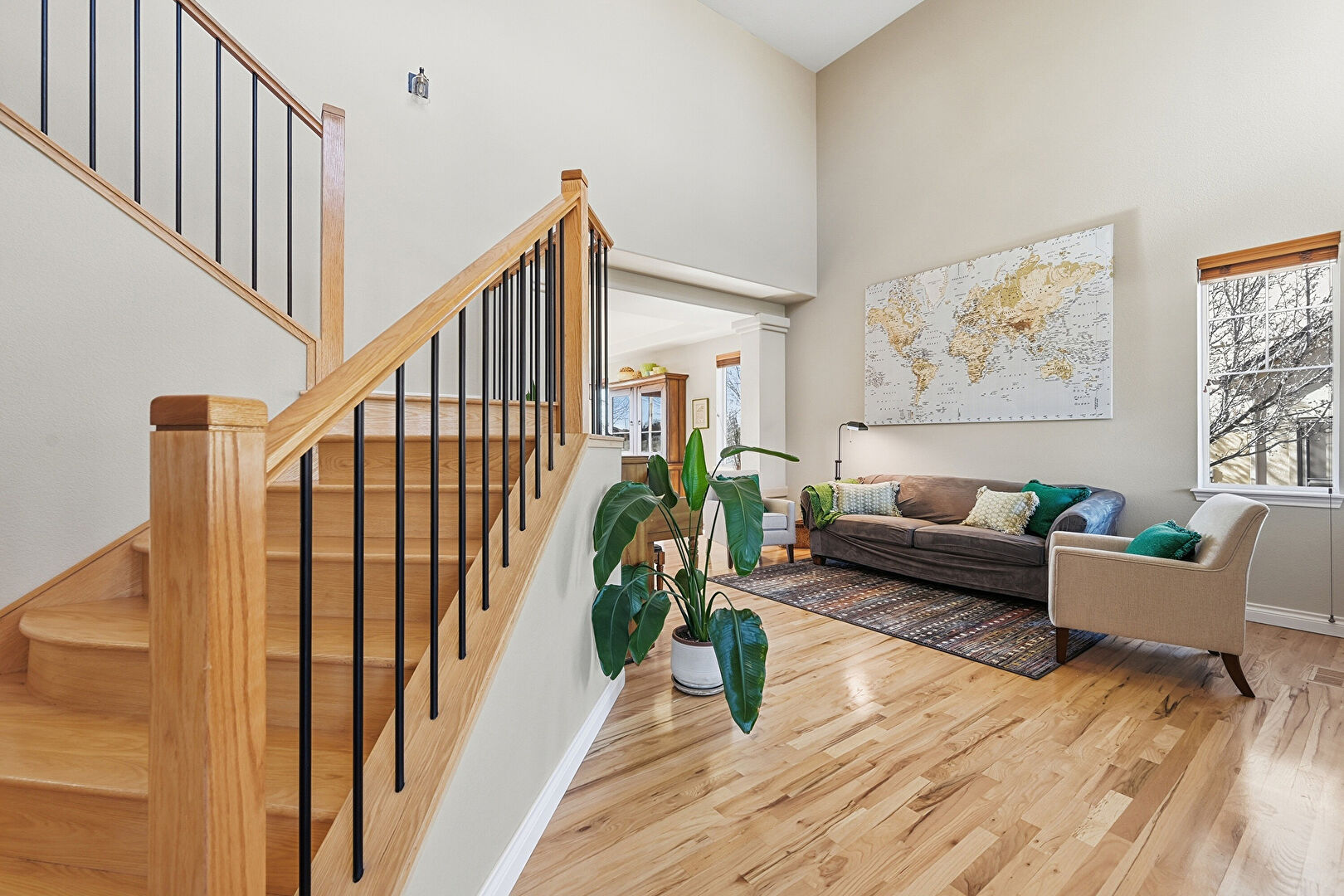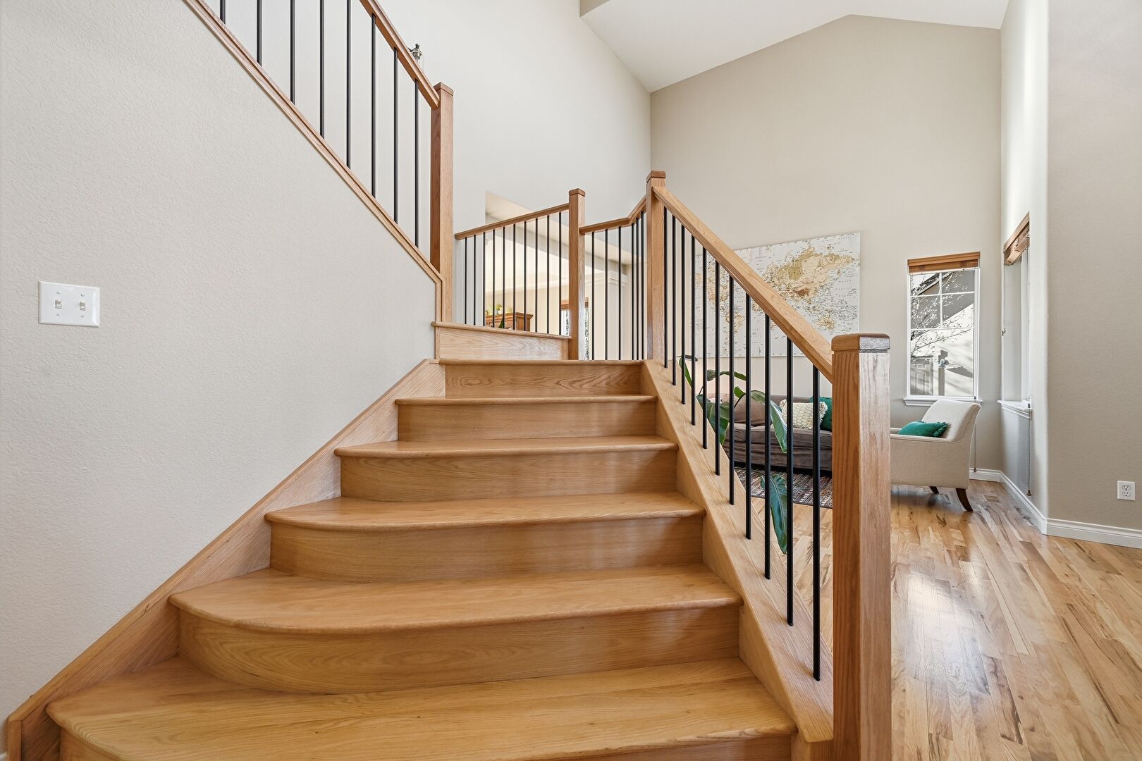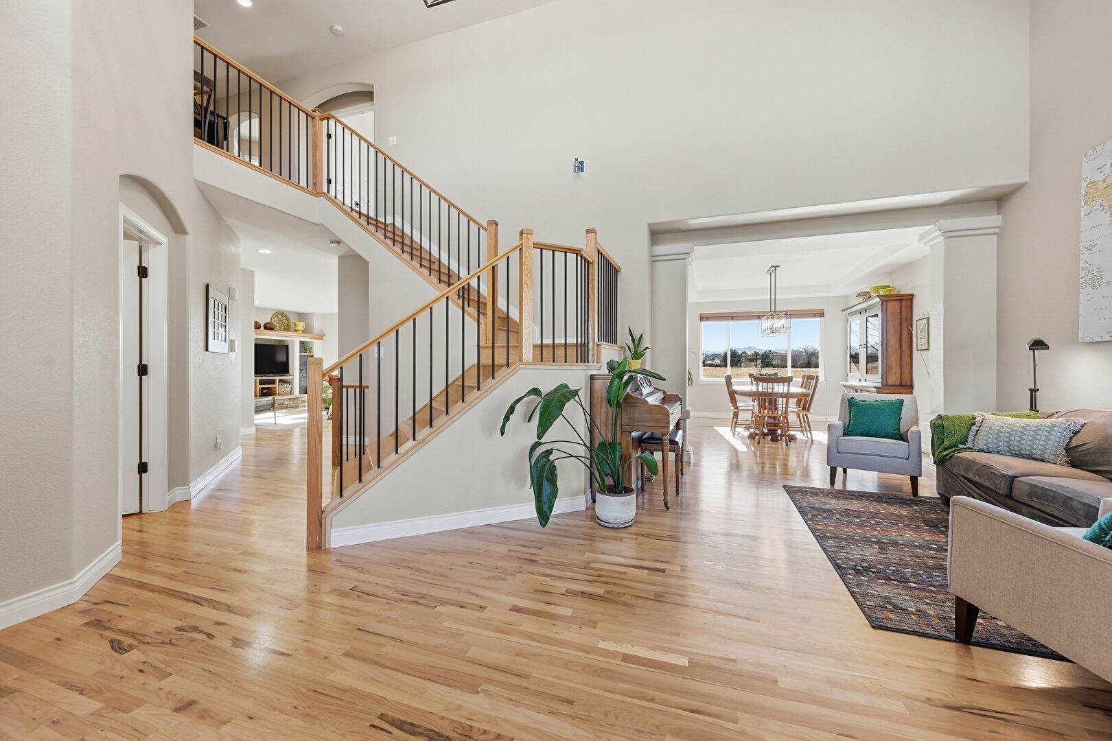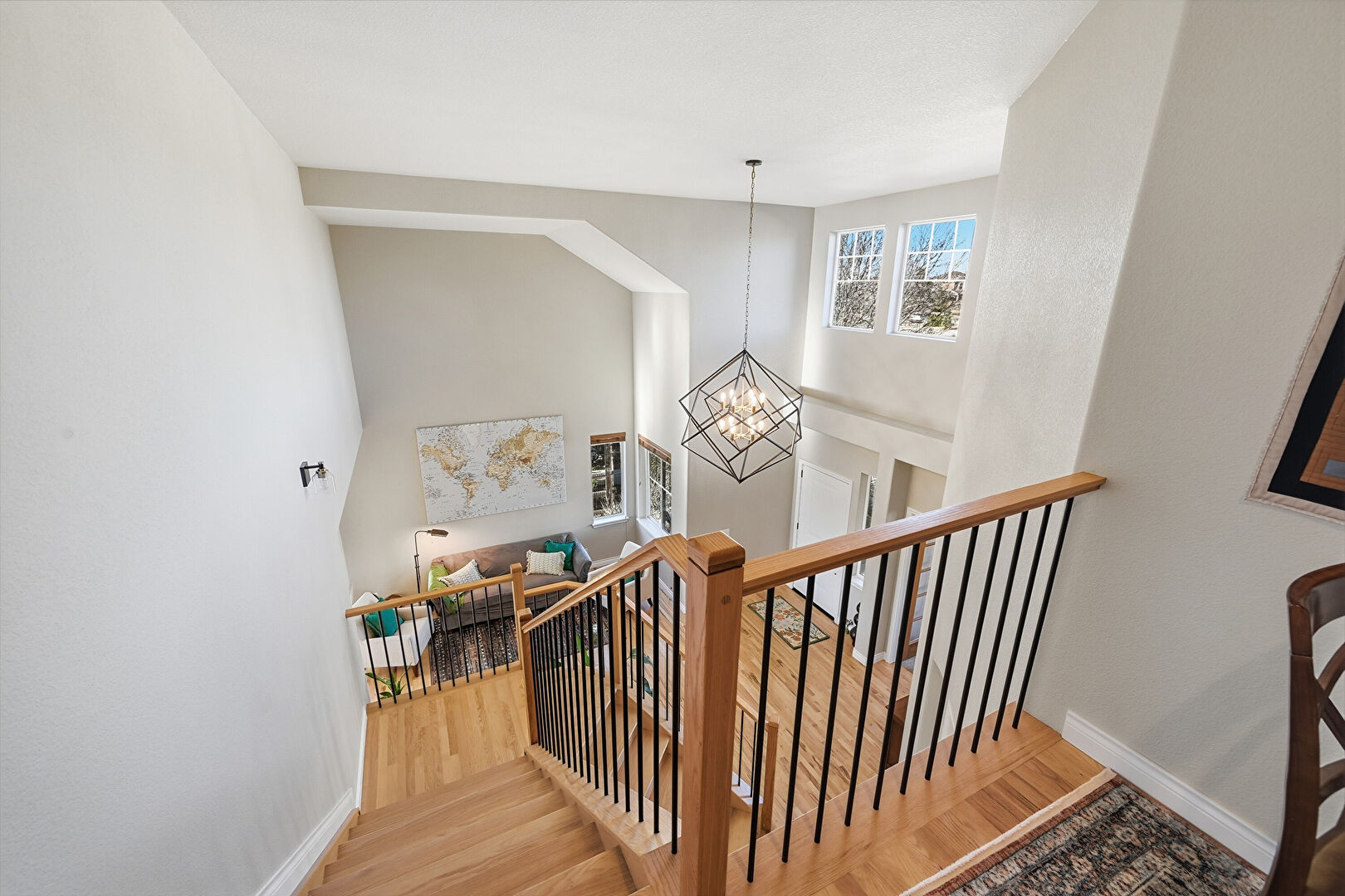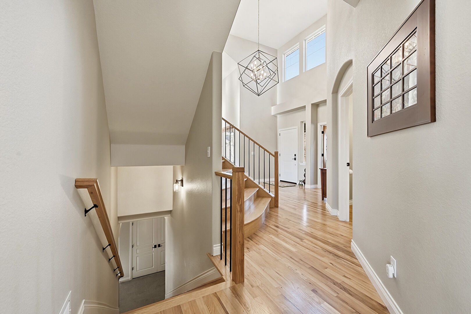 Arched Walkways, Baseboards Wall, Drywall, High Ceiling, Natural Light, Notable Chandelier, Recessed Lighting, Stairs, Vent, Wood Finish Floor, Drywall, Stairs, Wood Finish Floor
