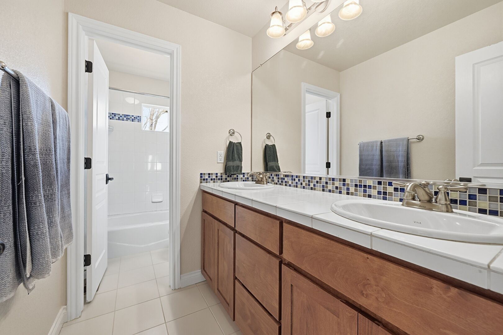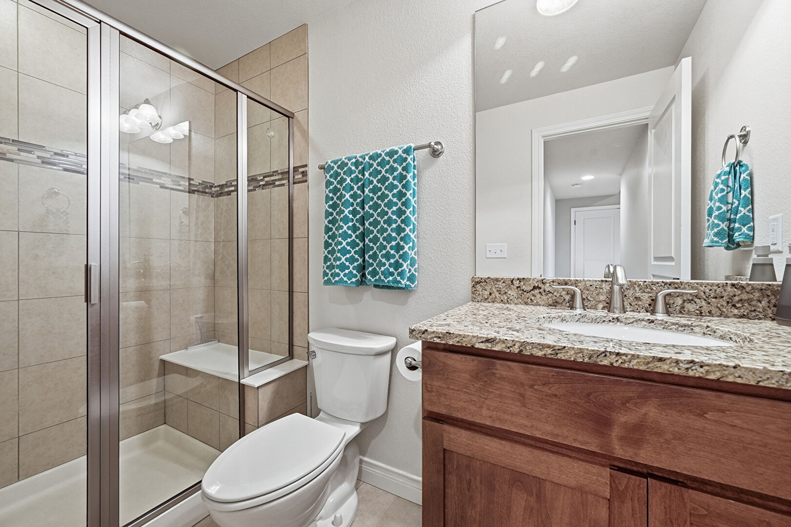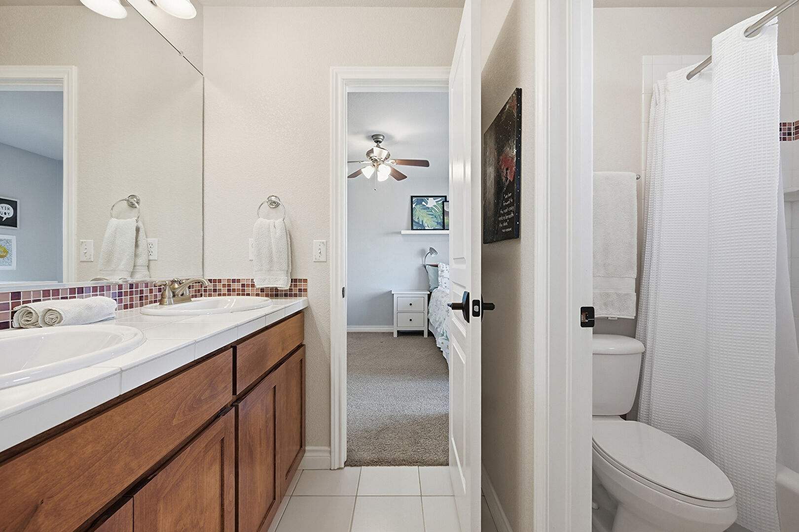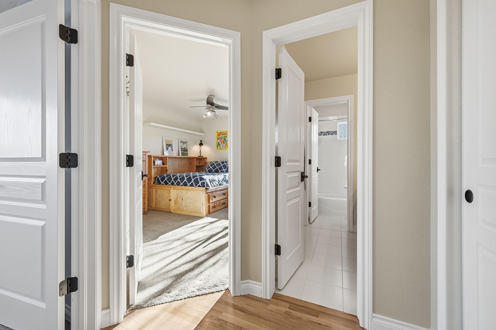 Baseboards Wall, Carpet, Ceiling Fan, Combined Bath Shower, Double Vanity, Drywall, Full Bathroom, Half Bathroom, Natural Light, Notable Chandelier, Textured Wall, Tile Floor, Vanity, Wood Finish Floor, Baseboards Wall, Combined Bath Shower, Ensuite Bathroom, Textured Wall