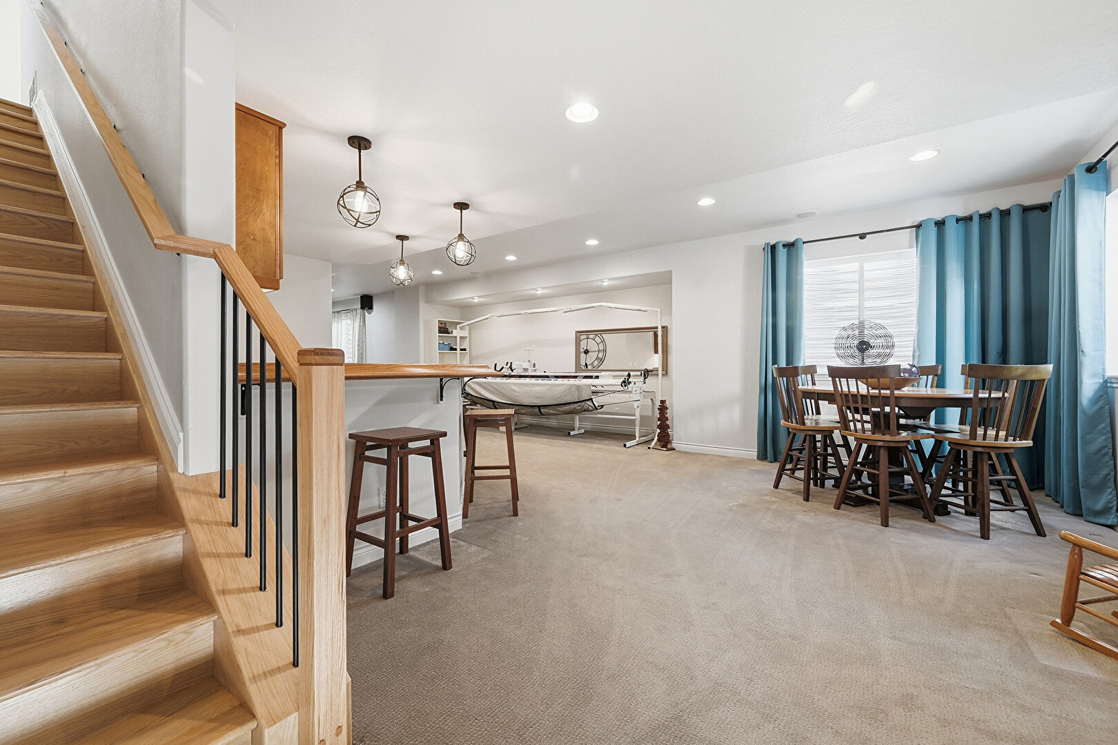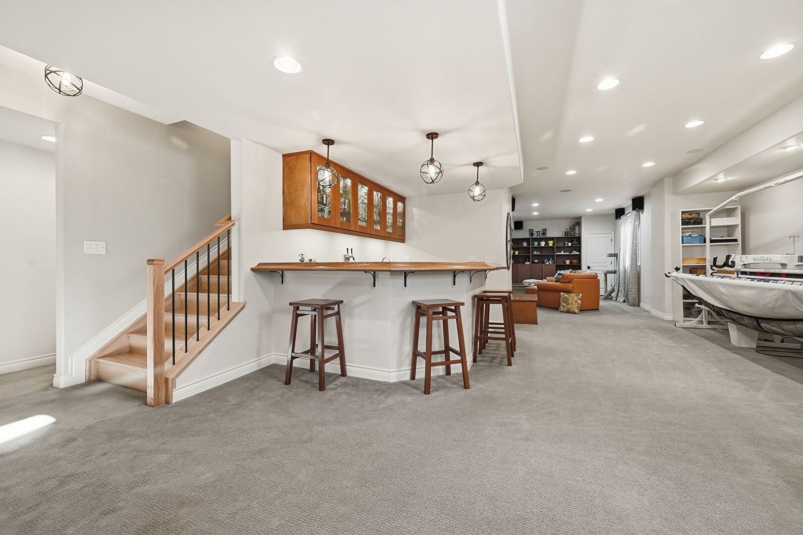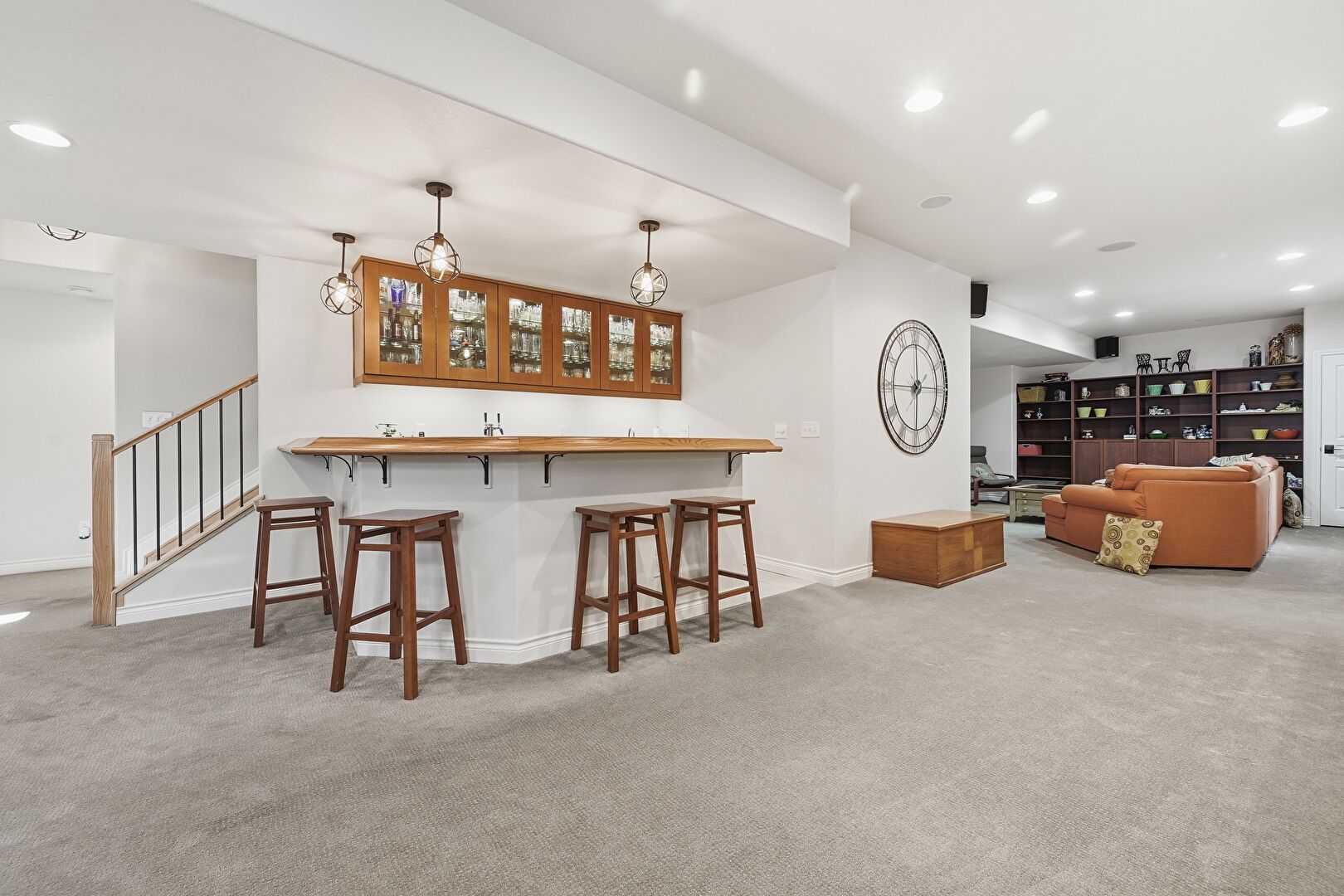 Baseboards Wall, Basement, Butcher Block Countertops, Carpet, Drywall, Glass Insert Cabinets, Indoor Bar, Medium Brown Cabinets, Pendant Lighting, Recessed Lighting, Stairs, Baseboards Wall, Basement, Natural Light