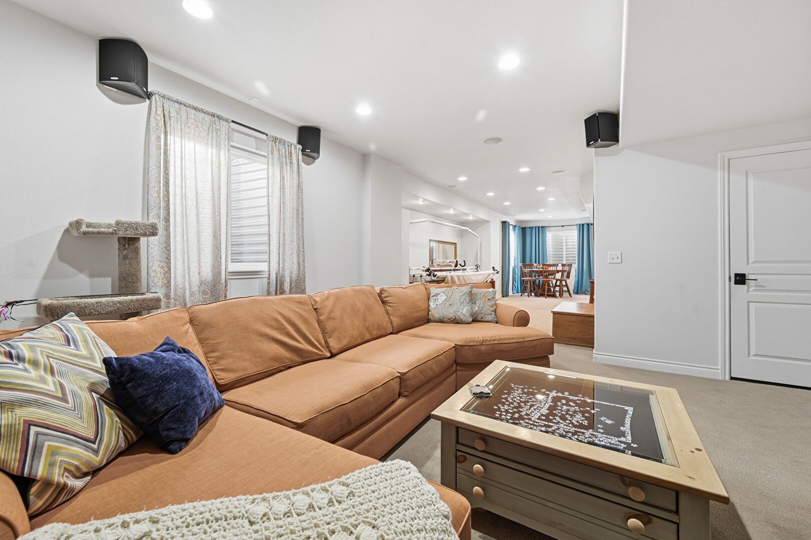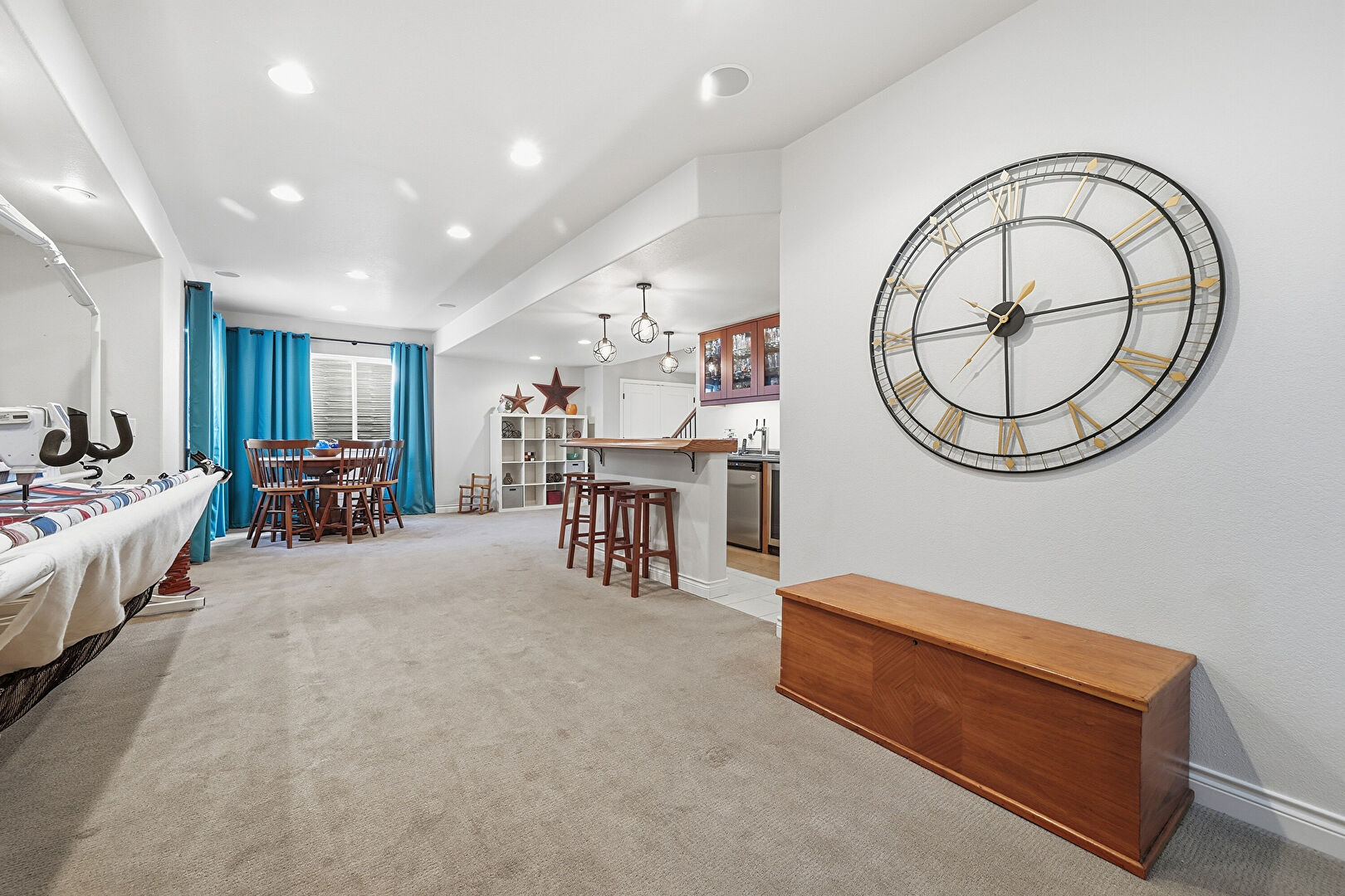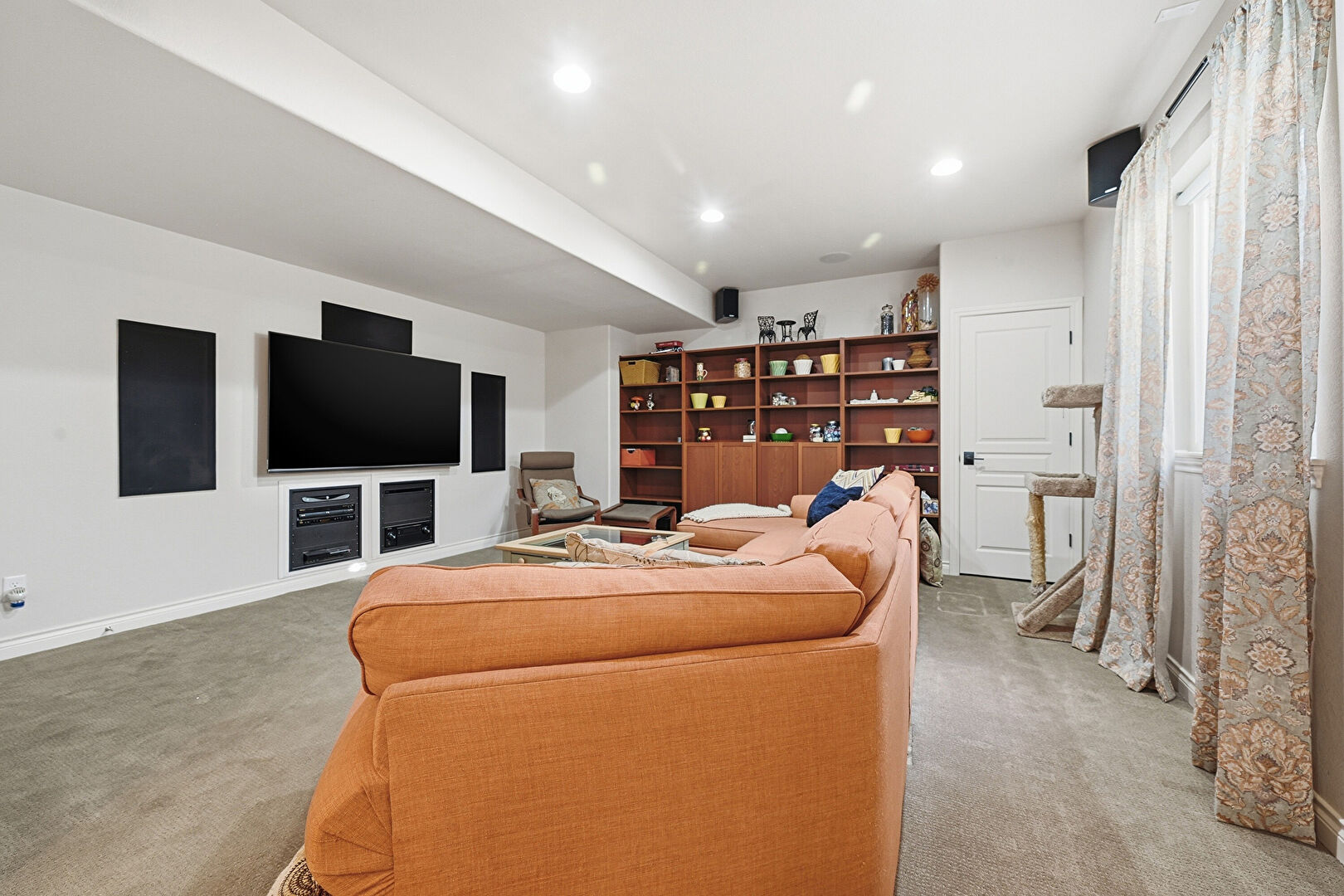 Basement, Carpet, Drywall, Natural Light, Recessed Lighting, Baseboards Wall