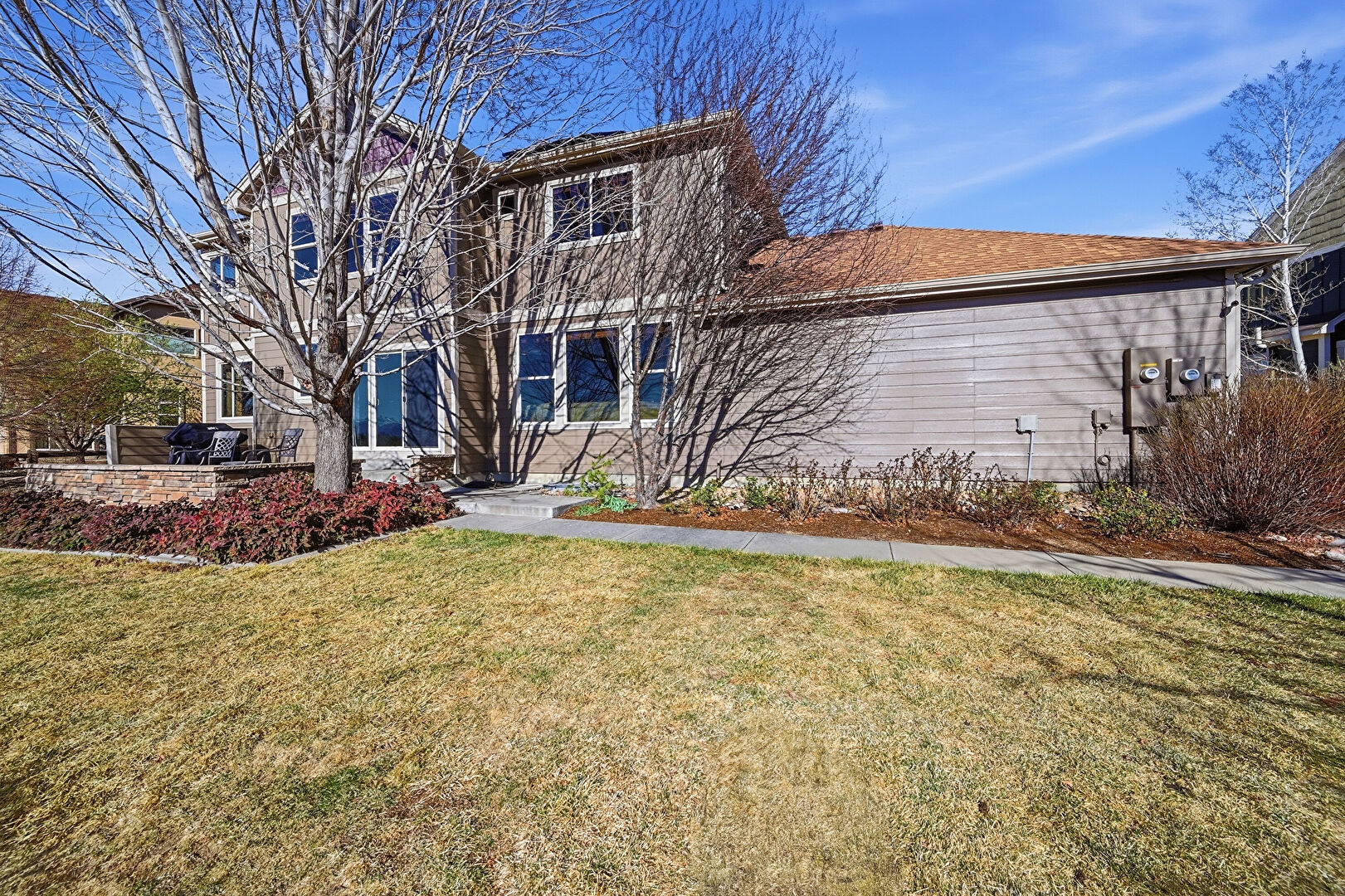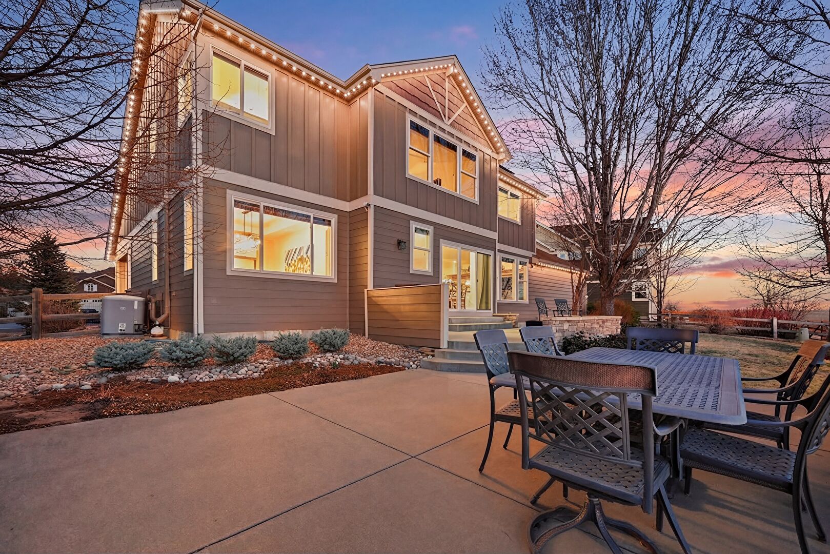 Central Ac, Chimney, Concrete Foundation, Downspout, Electric Meter, Fence, Gutters, Horizontal Siding, Lawn, Outdoor Dining Area, Patio, Shake Shingle Siding, Vertical Siding, Wood Siding, Board Batten Siding, Gutters, Stoop