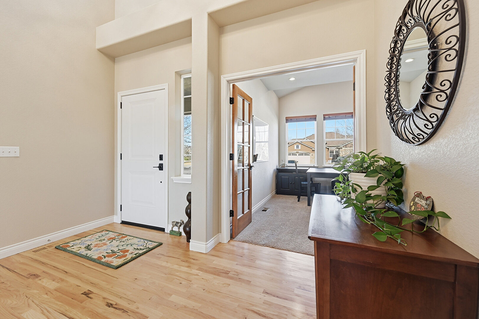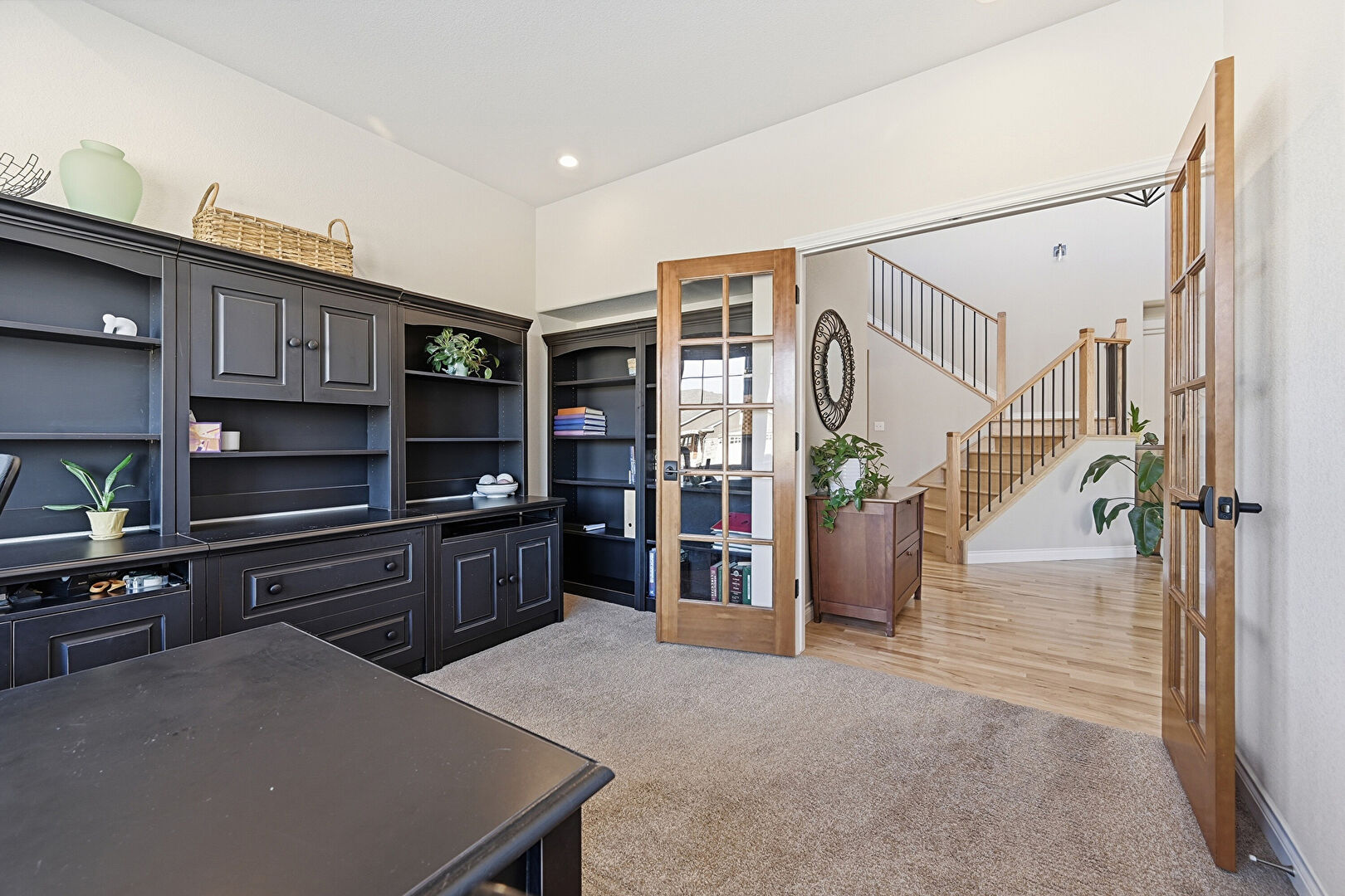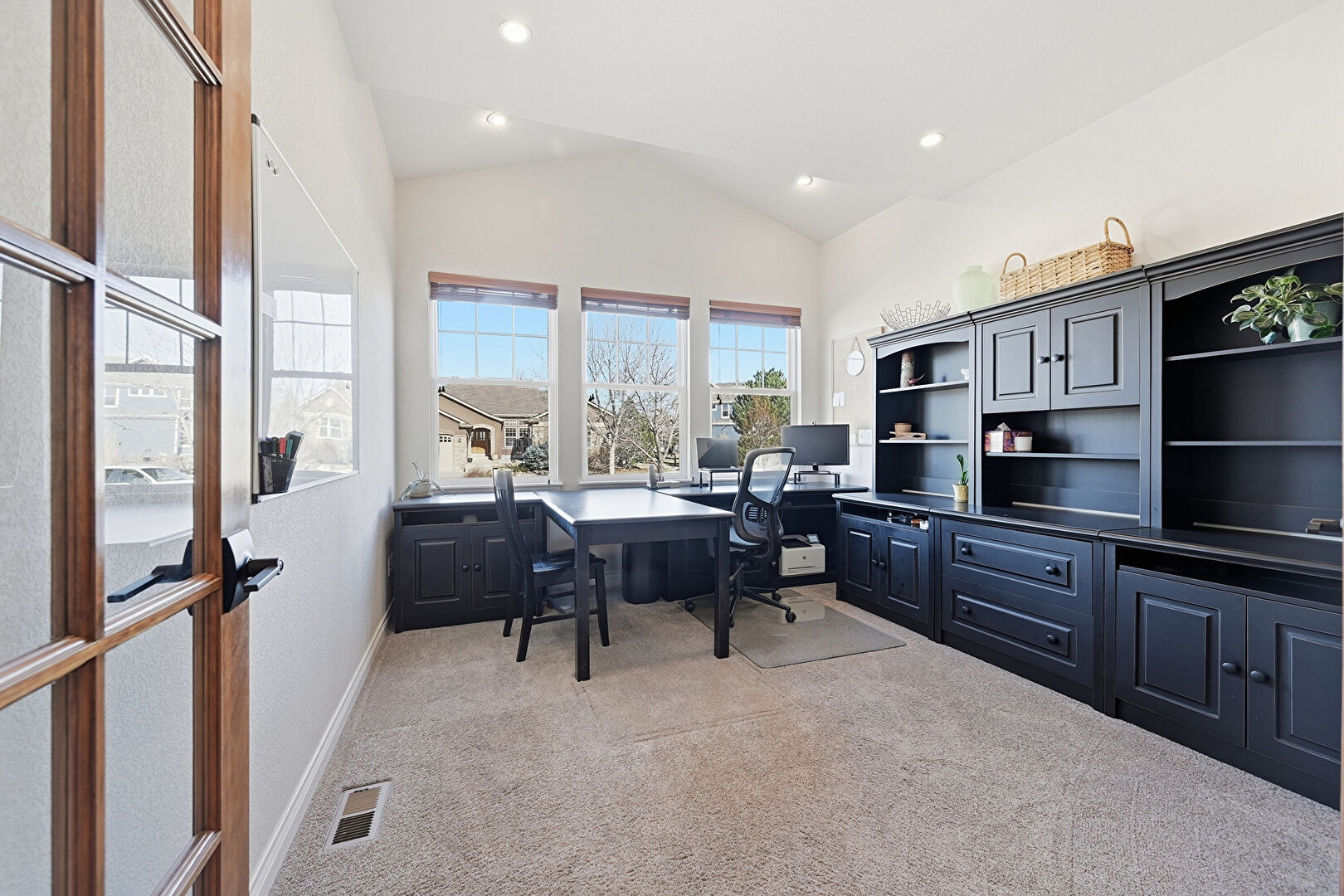 Baseboards Wall, Carpet, Drywall, French Doors, Natural Light, Office Area, Recessed Lighting, Vaulted Ceiling, Vent, Baseboards Wall, Carpet