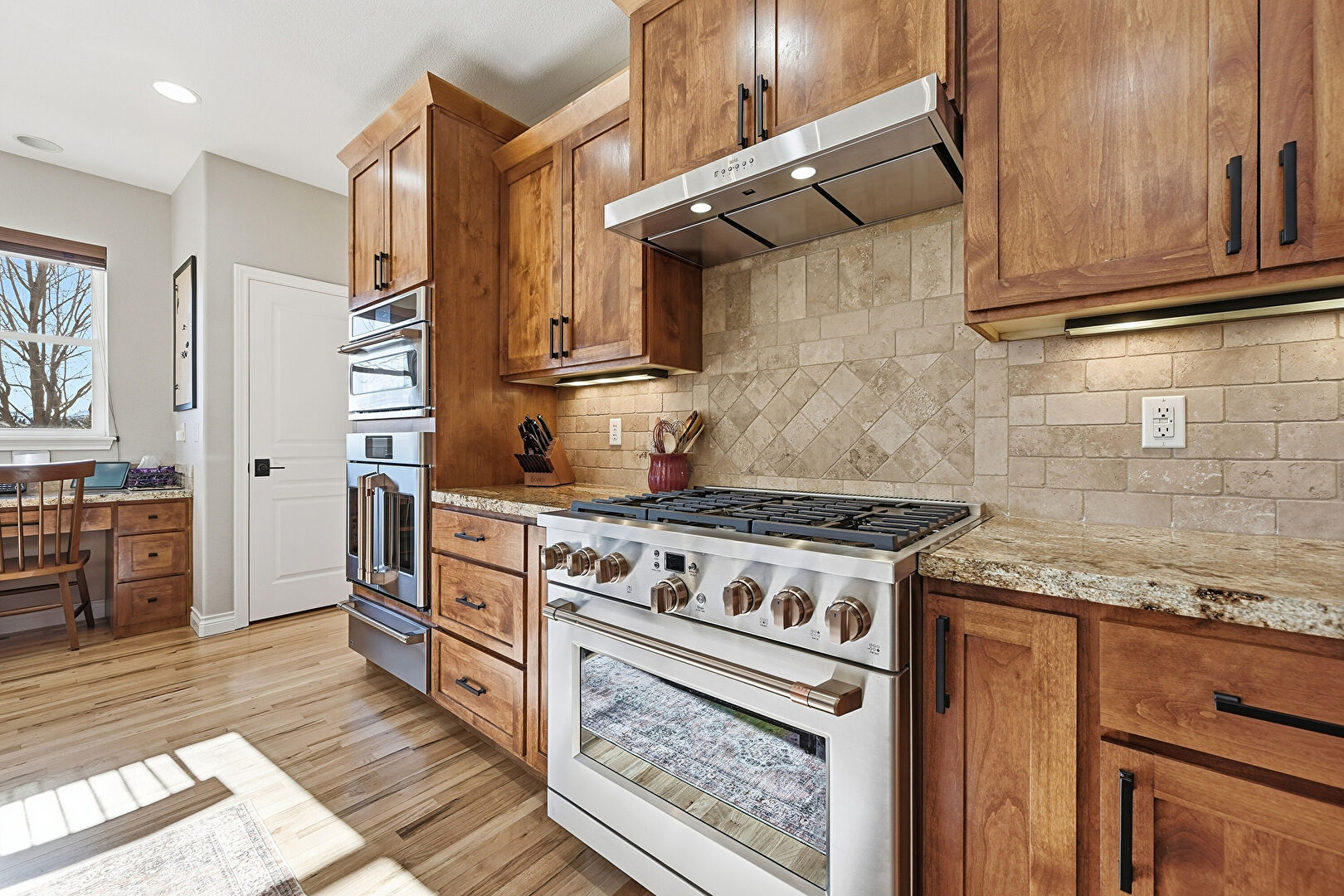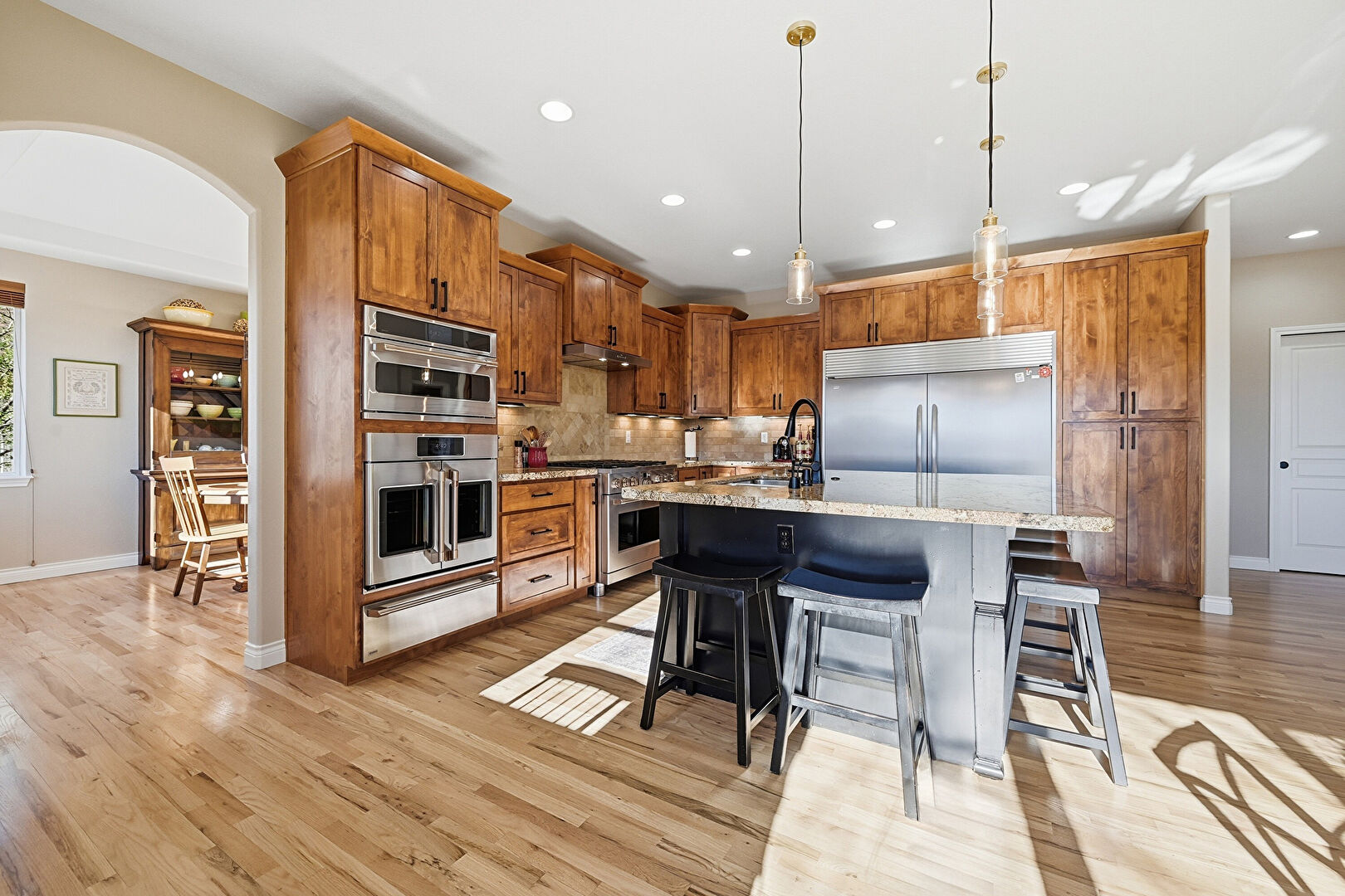 Arched Walkways, Baseboards Wall, Double Oven, Drywall, Natural Light, Recessed Lighting, Warming Drawer, Wood Finish Floor, Drywall, Vent