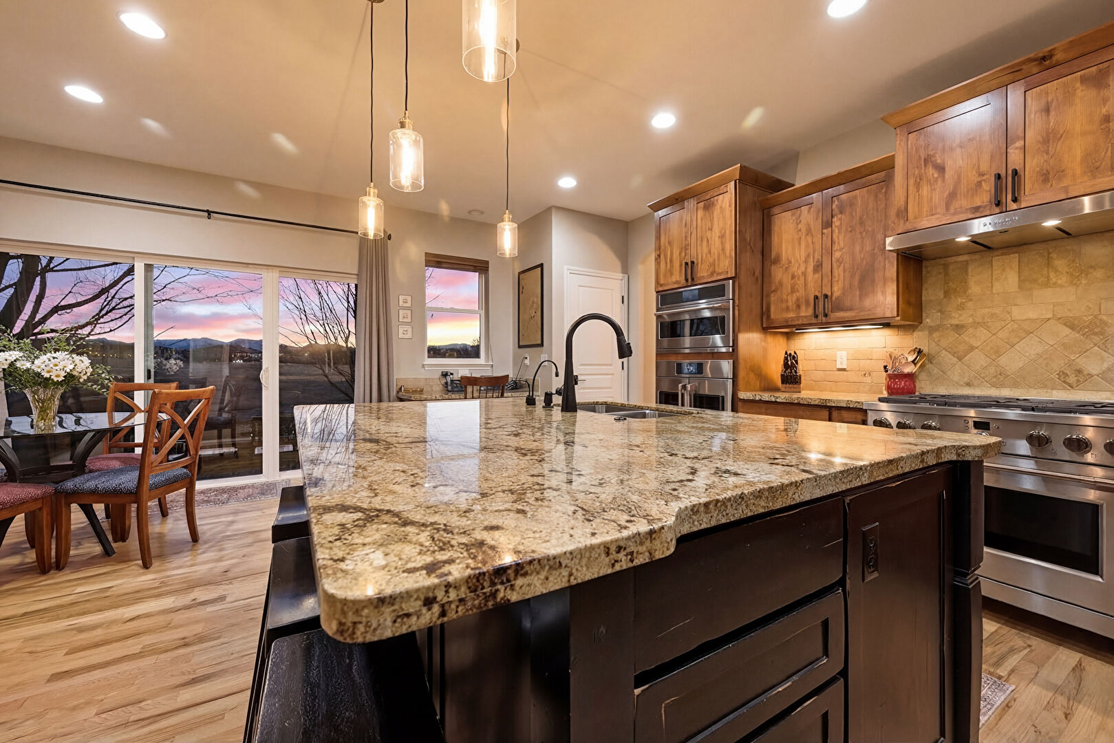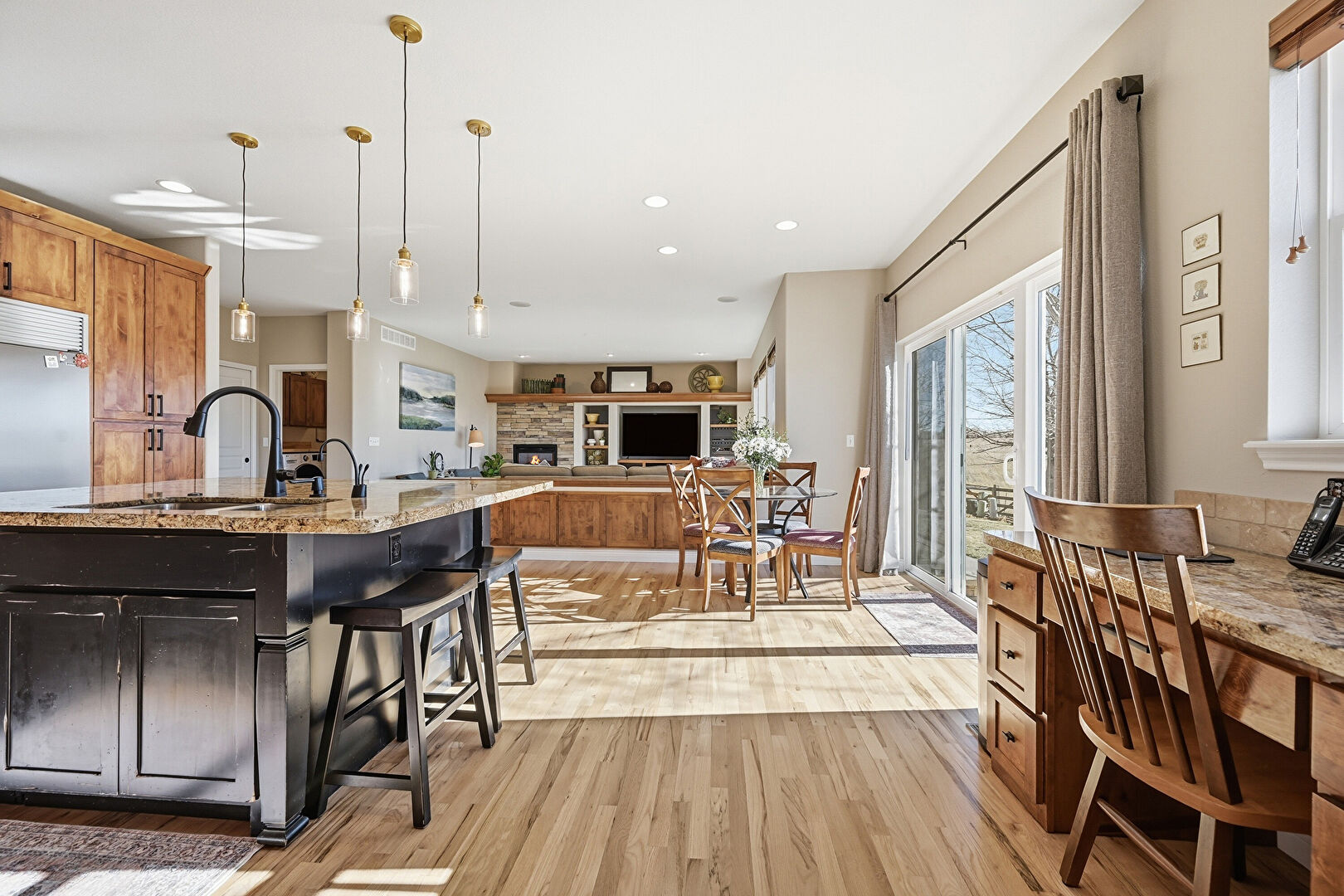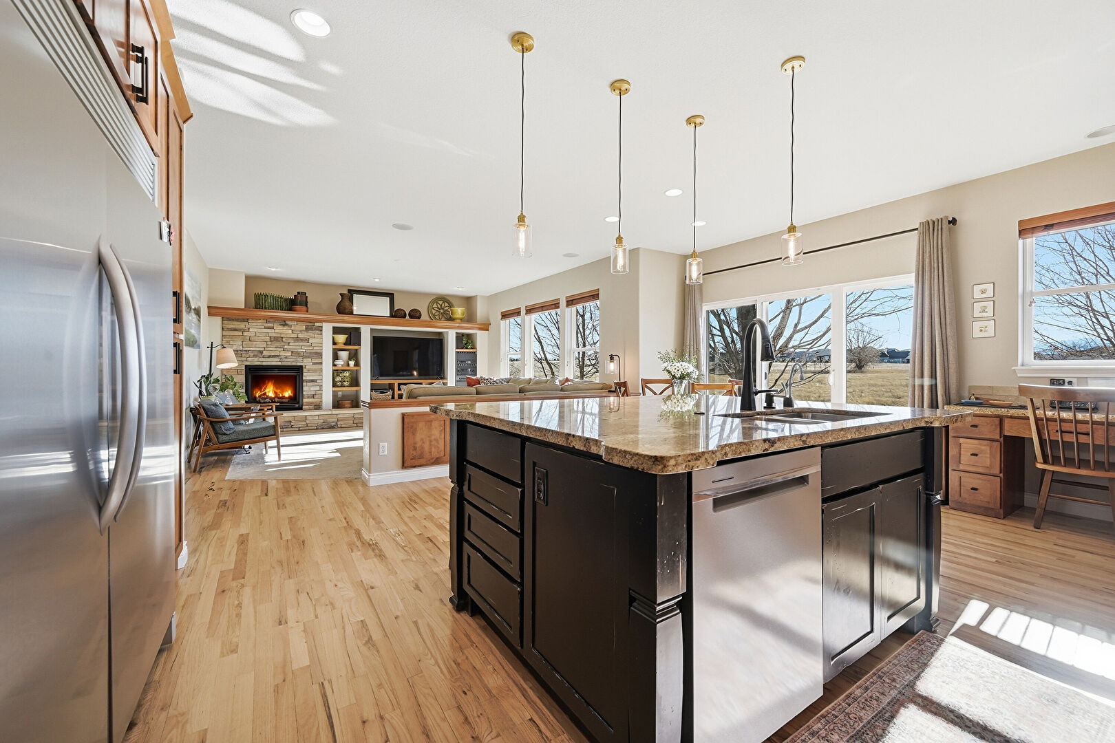 Baseboards Wall, Black Cabinets, Butcher Block Countertops, Crown Molding Cabinets, Dark Brown Cabinets, Double Oven, Drywall, Fireplace, Kitchen Bar, Kitchen Island, L Shaped Kitchen, Medium Brown Cabinets, Natural Light, Office Area, Opens To Living Area, Pendant Lighting, Recessed Lighting, Shaker Cabinets, Stone Countertops, Vent, Warming Drawer, Wood Finish Floor, Arched Walkways, Double Oven, Fireplace, Kitchen Bar, Medium Brown Cabinets, Natural Light, Pendant Lighting, Wood Finish Floor