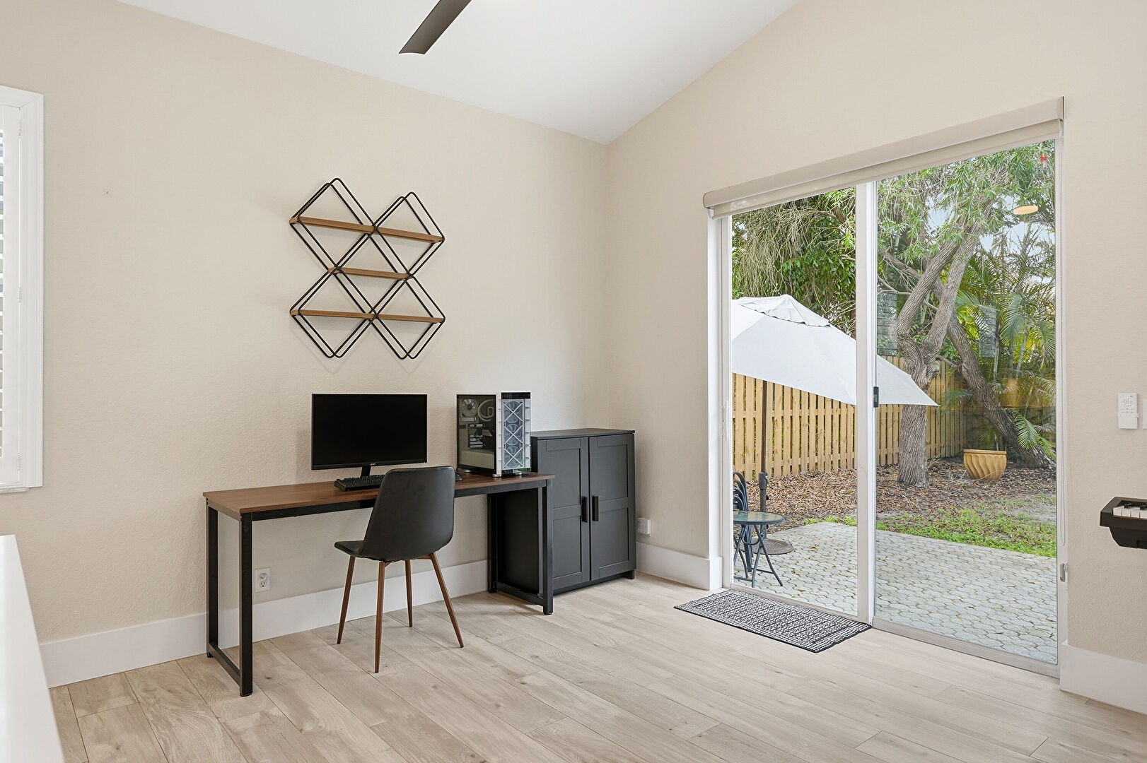 Arched Walkways, Baseboards Wall, Ceiling Fan, Drywall, Ensuite Bathroom, Natural Light, Office Area, Vaulted Ceiling, Vent, Wood Finish Floor, Ceiling Fan, Closet, Natural Light, Vaulted Ceiling