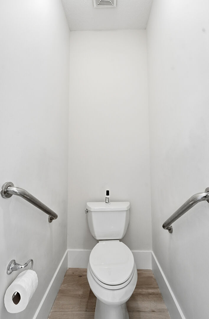 Baseboards Wall, Drywall, Full Bathroom, Natural Light, Vent, Water Closet, Wood Finish Floor, Drywall, Vanity
