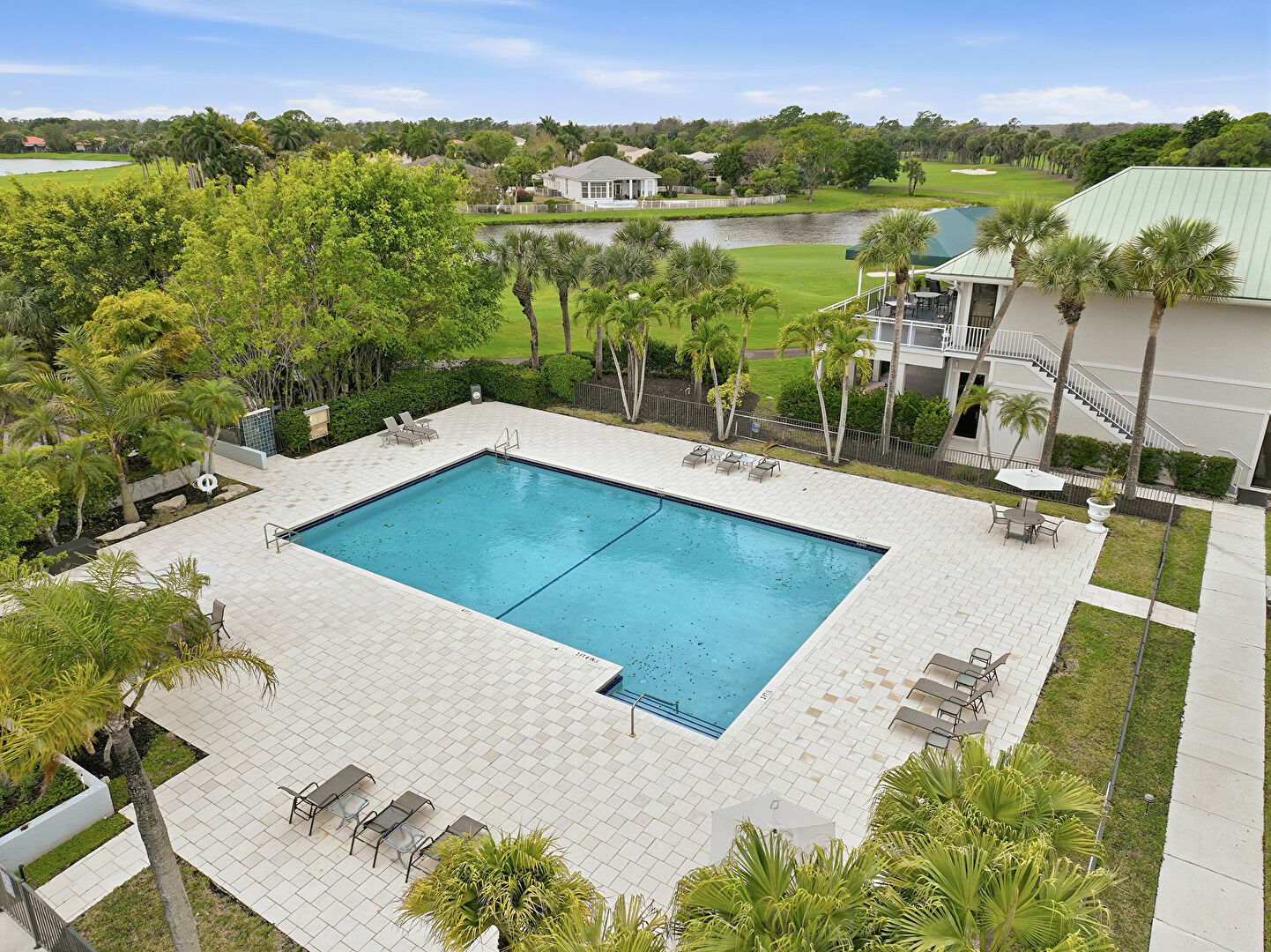Balcony, Fence, Golf Course View, Handrail, Lawn, Pool, Stairs, Water View, Woods View, Patio
