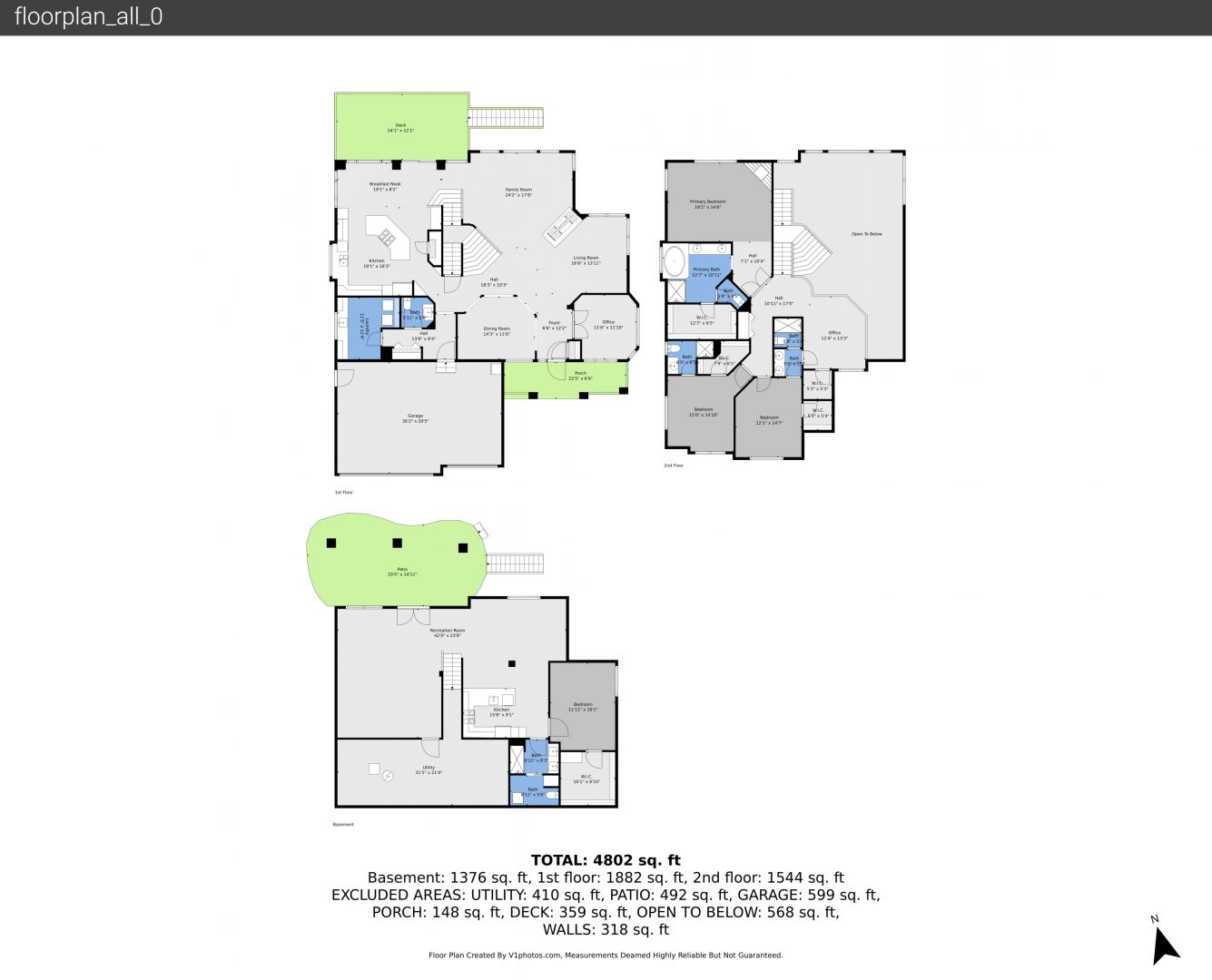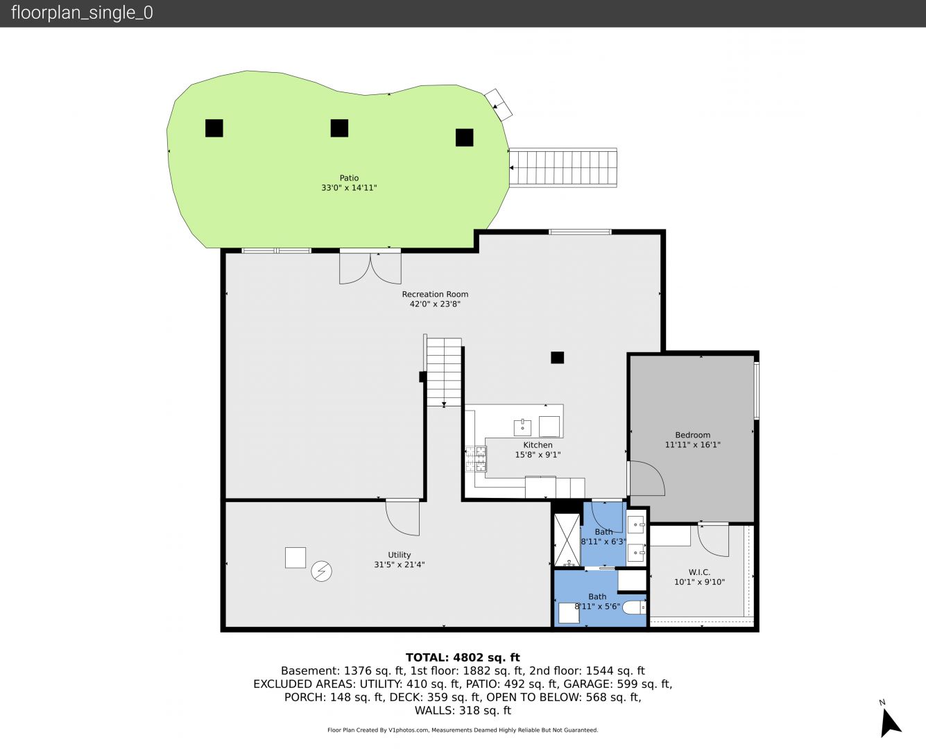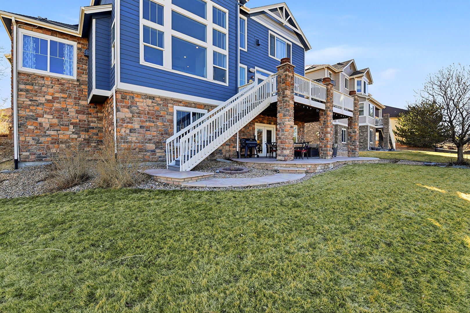Basement Walk Out, Deck, Downspout, French Doors, Grill, Gutters, Horizontal Siding, Lawn, Patio, Stairs, Stone Siding, Concrete Foundation
