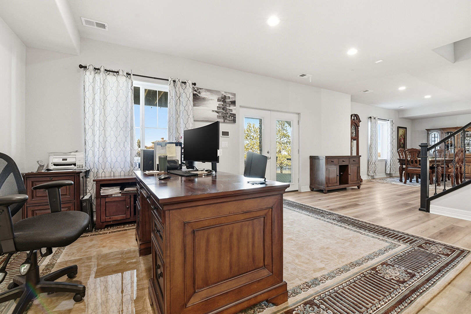 Baseboards Wall, Drywall, French Doors, Natural Light, Office Area, Recessed Lighting, Tray Ceiling, Vent, Wood Finish Floor, Office Area, Vent