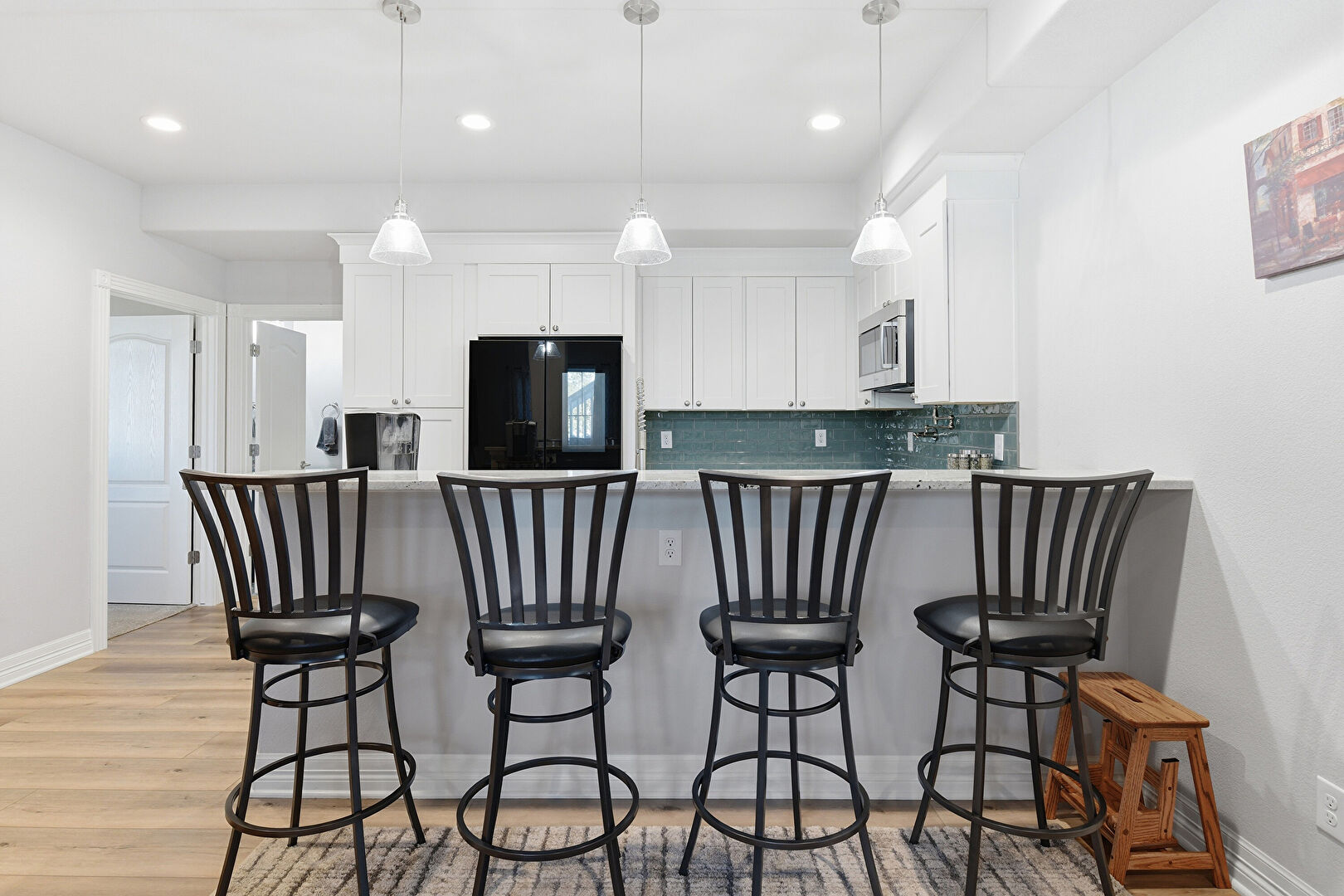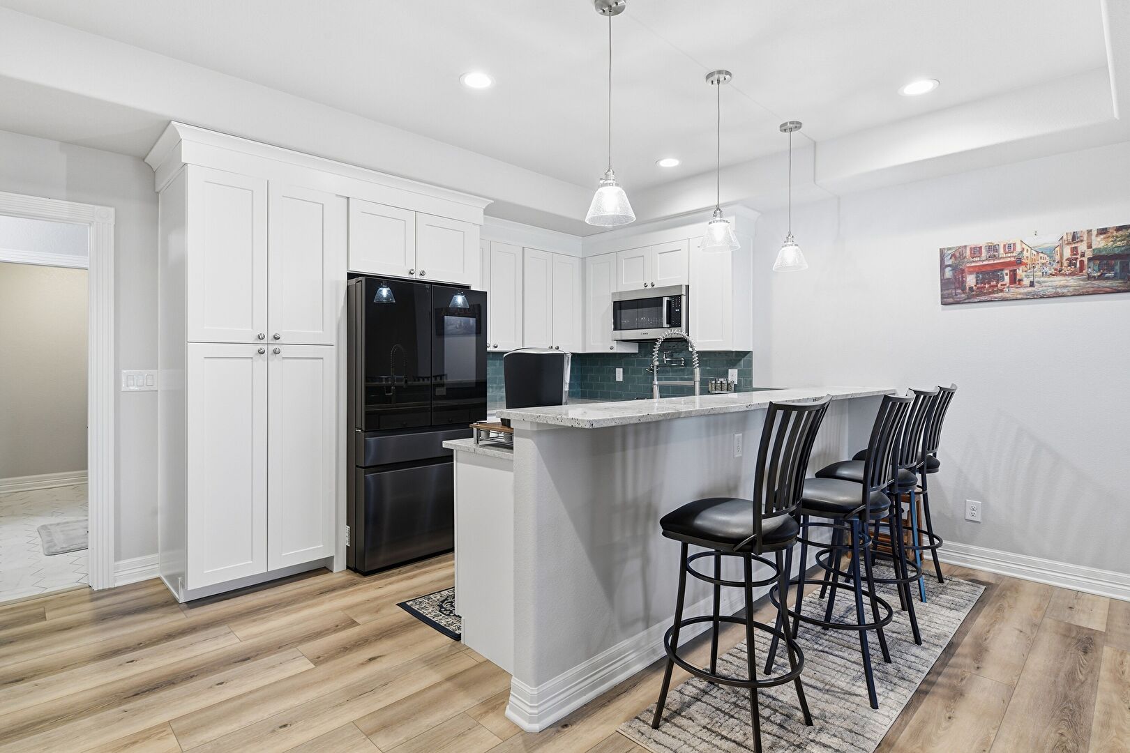 Baseboards Wall, Crown Molding Cabinets, Drywall, Kitchen Bar, Kitchen Peninsula, Pendant Lighting, Pot Filler, Recessed Lighting, Shaker Cabinets, Stone Countertops, U Shaped Kitchen, Wood Finish Floor, Recessed Lighting, Shaker Cabinets