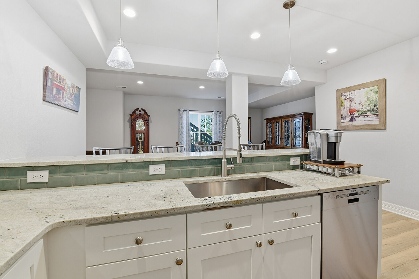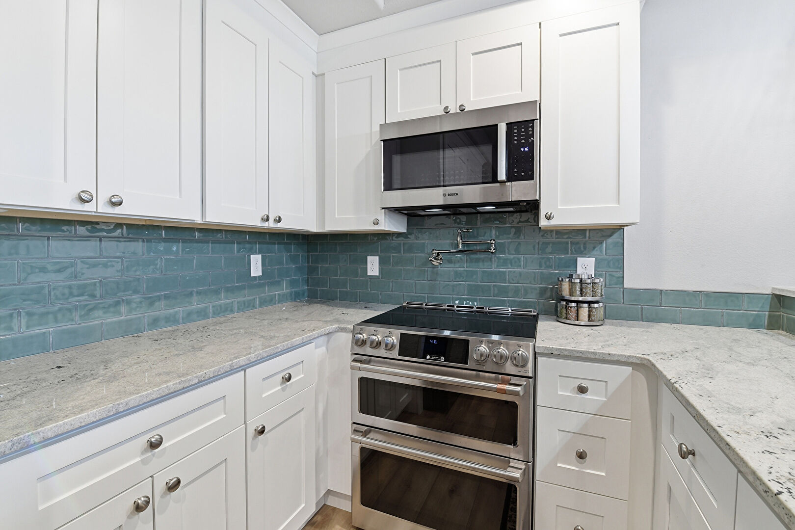 Baseboards Wall, Crown Molding Cabinets, Drywall, Kitchen Peninsula, Natural Light, Pendant Lighting, Pot Filler, Recessed Lighting, Shaker Cabinets, Stone Countertops, Tray Ceiling, Wood Finish Floor, Crown Molding Cabinets, Pot Filler, Recessed Lighting