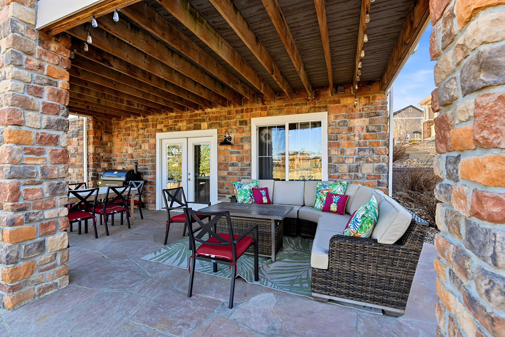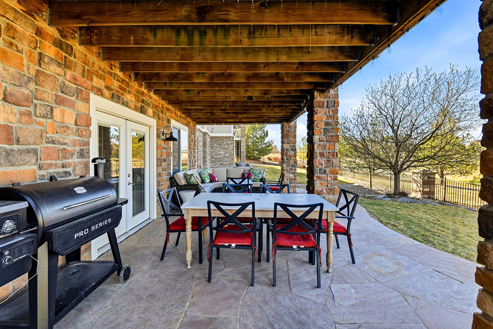 French Doors, Grill, Lawn, Outdoor Dining Area, Outdoor Living Space, Patio, Residential View, Fence, French Doors