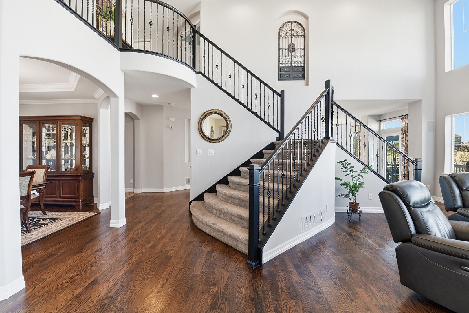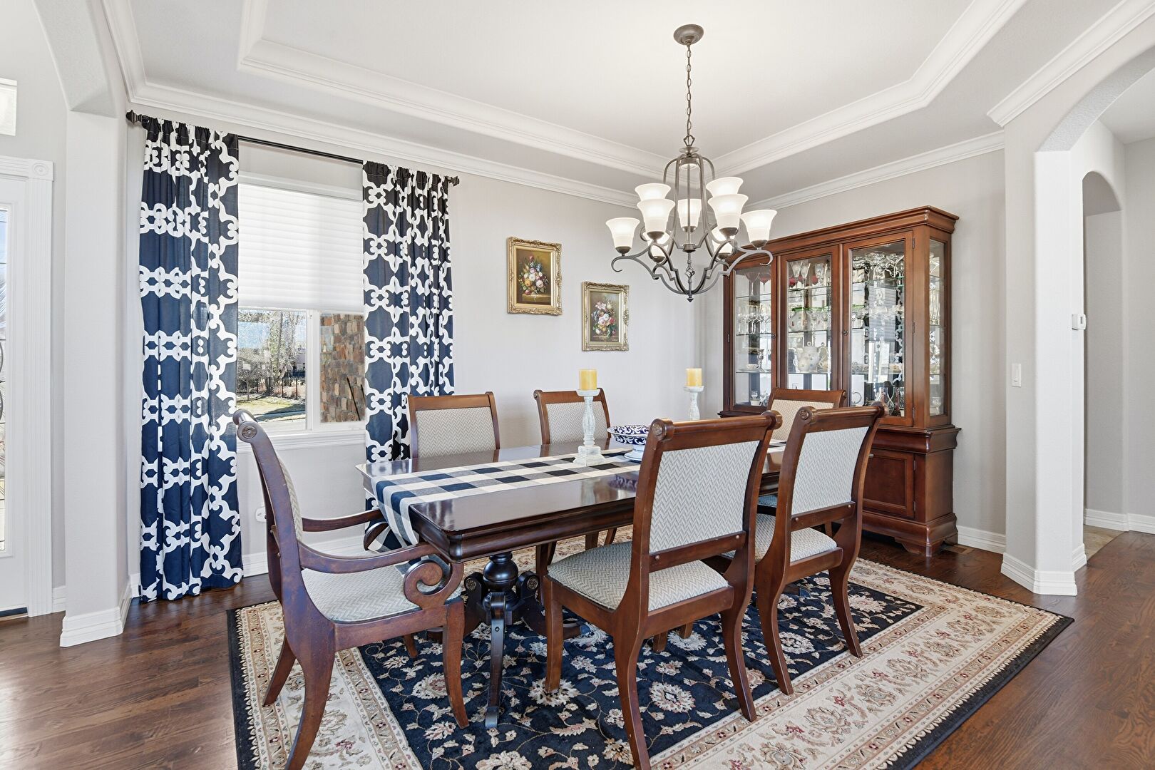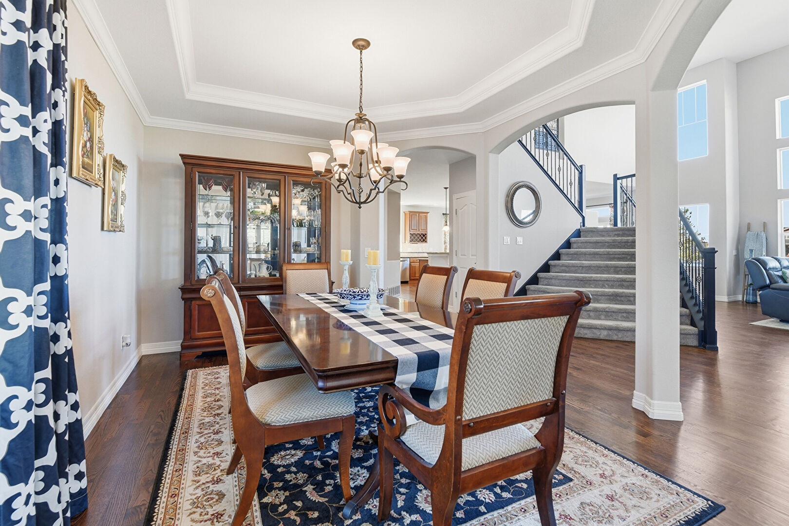 Arched Walkways, Baseboards Wall, Crown Molding, Drywall, Natural Light, Notable Chandelier, Tray Ceiling, Wood Finish Floor, Arched Walkways, Stairs