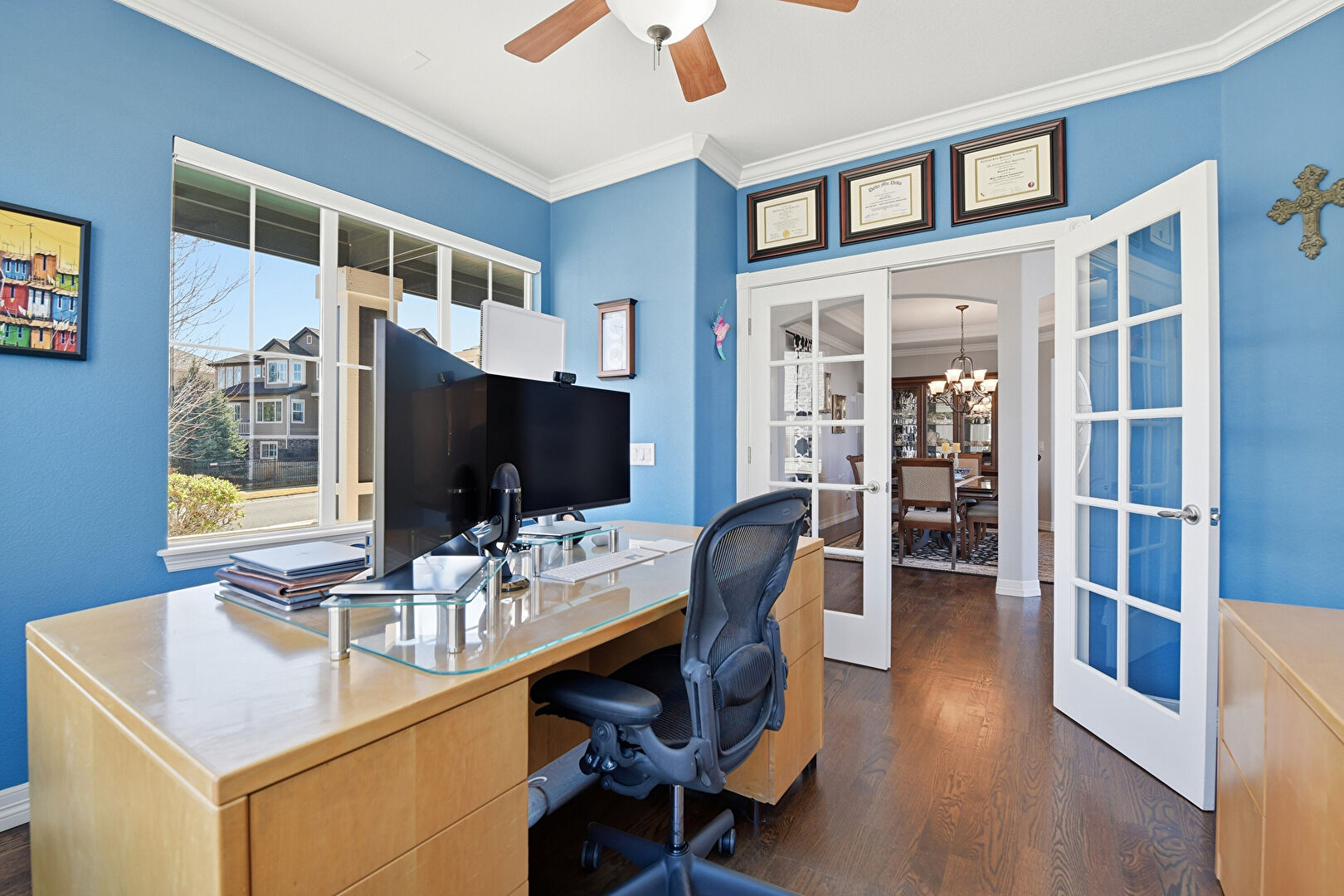 Arched Walkways, Baseboards Wall, Ceiling Fan, Crown Molding, Drywall, French Doors, Natural Light, Notable Chandelier, Office Area, Recessed Lighting, Vent, Wood Finish Floor, High Ceiling, Office Area, Wood Finish Floor