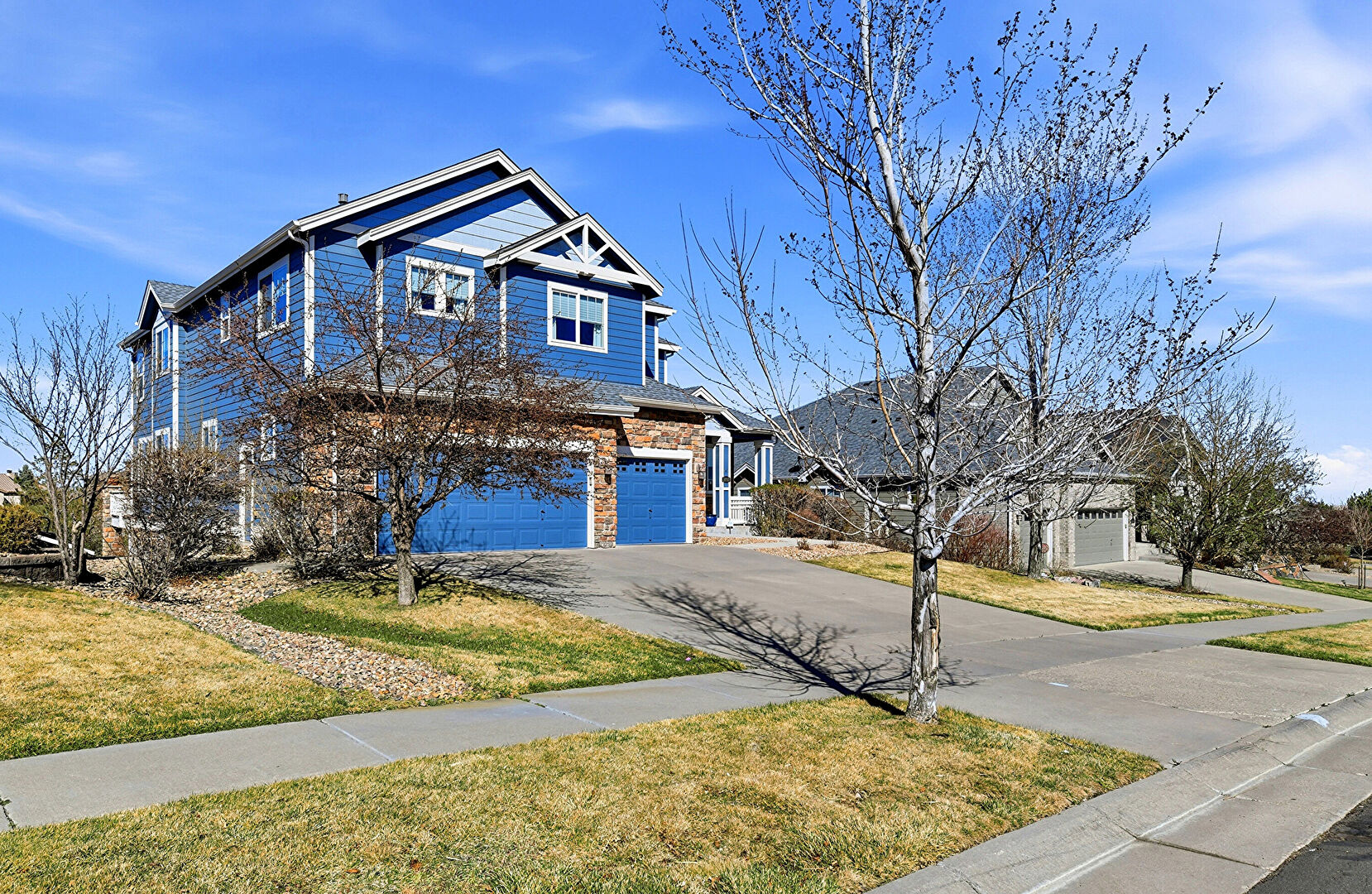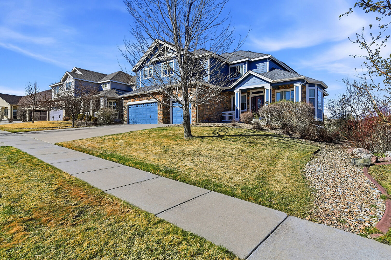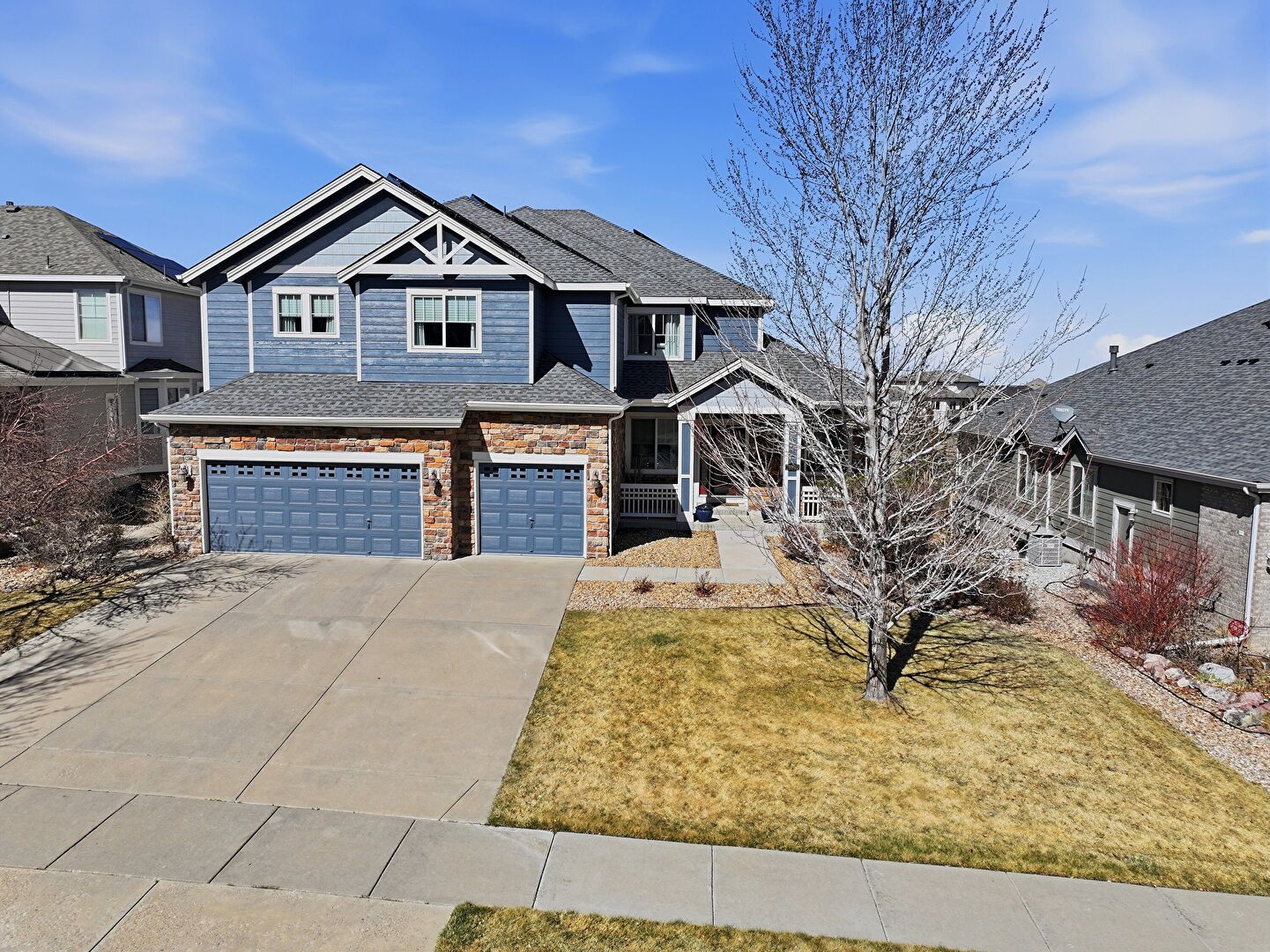 Built In Garage, Downspout, Driveway, Gutters, Horizontal Siding, Lawn, Porch, Residential View, Stone Siding, Built In Garage, Stone Siding