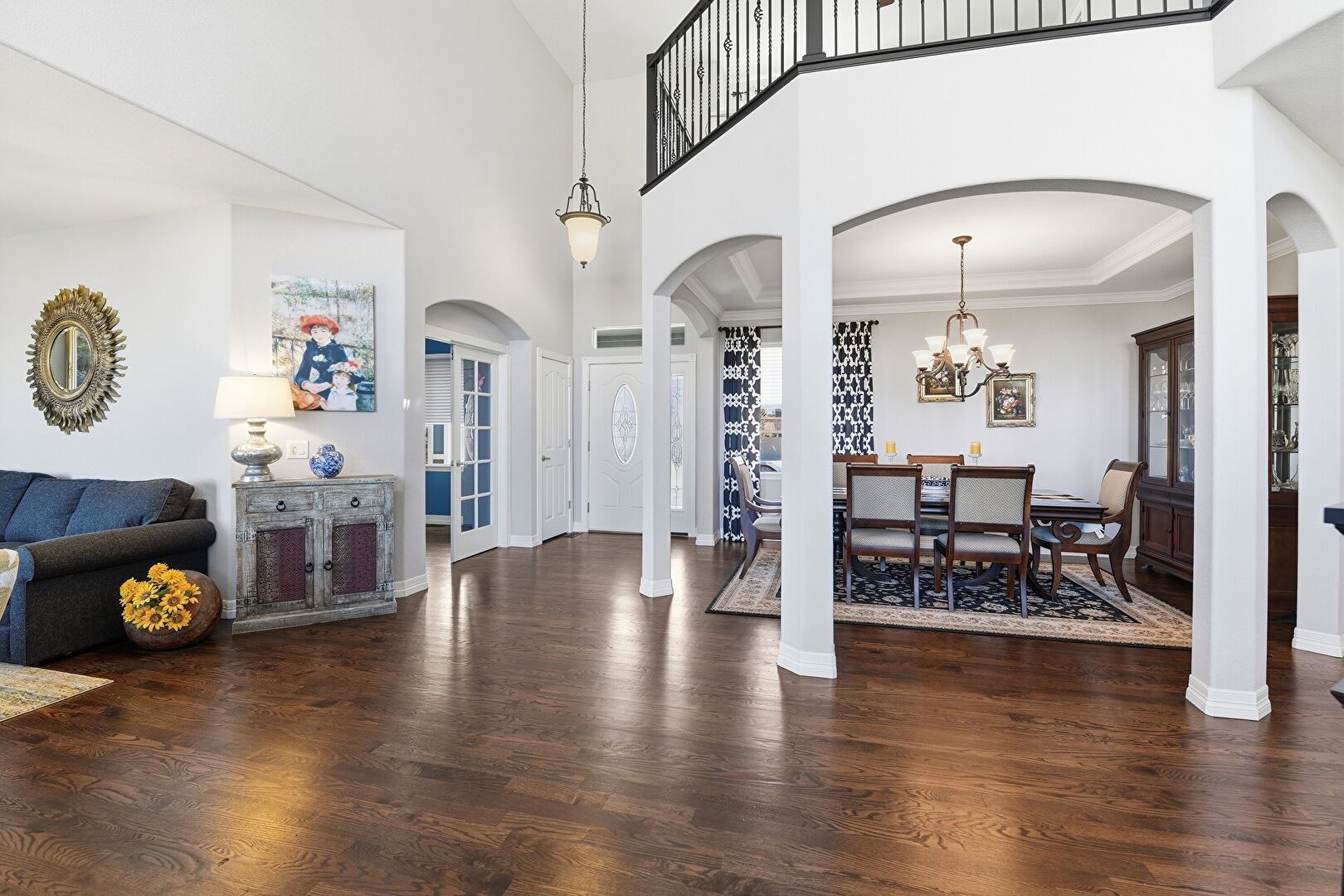 Arched Walkways, Baseboards Wall, Crown Molding, Drywall, Notable Chandelier, Wood Finish Floor, High Ceiling