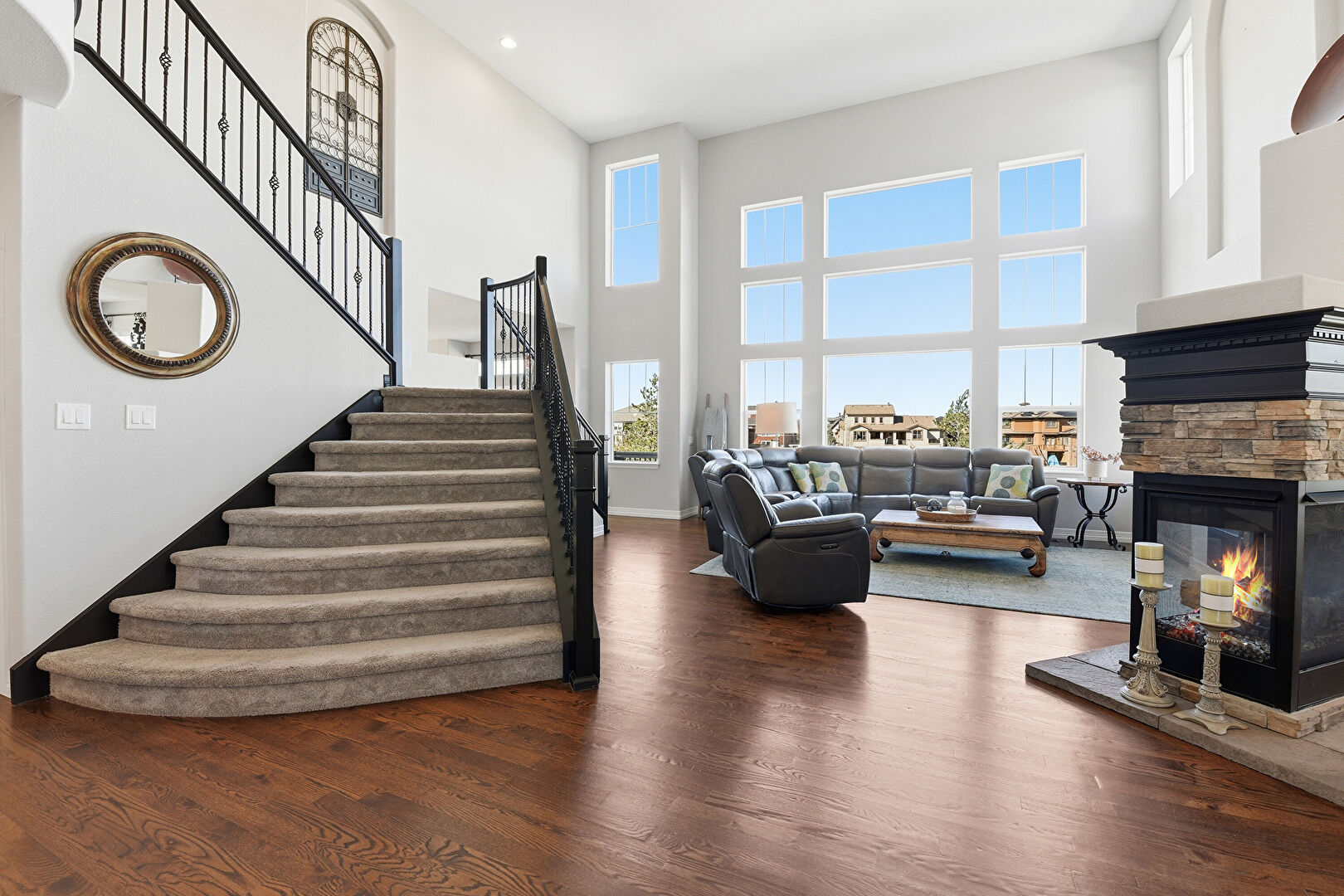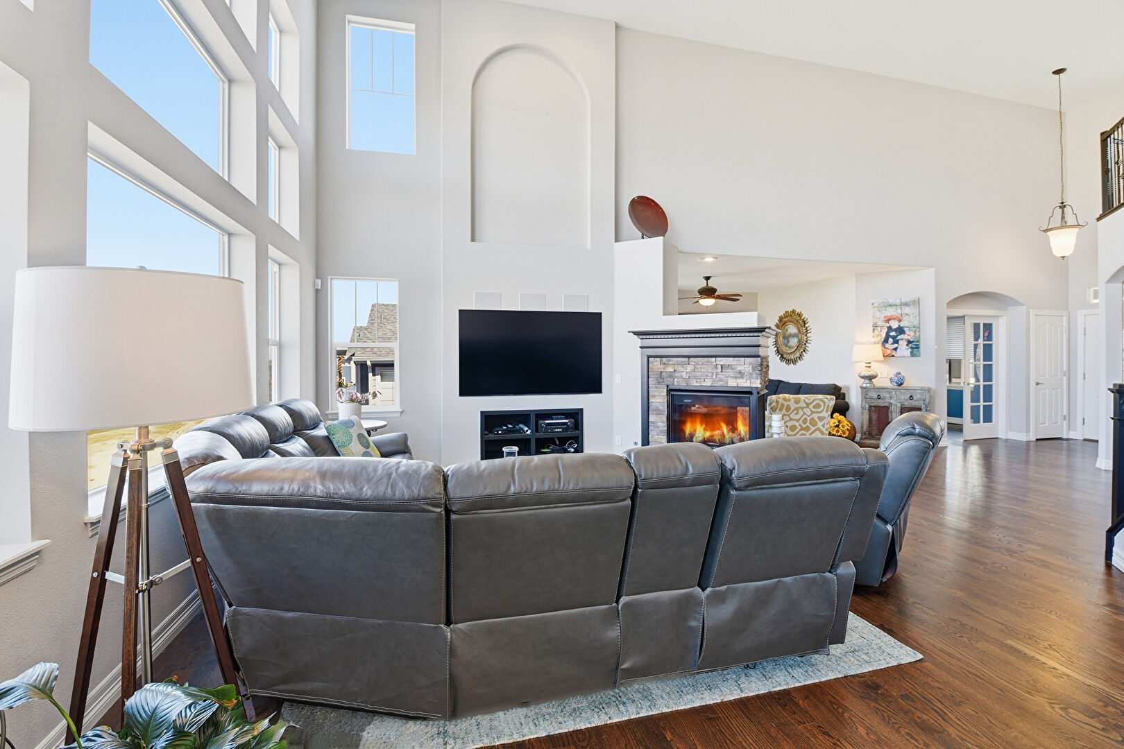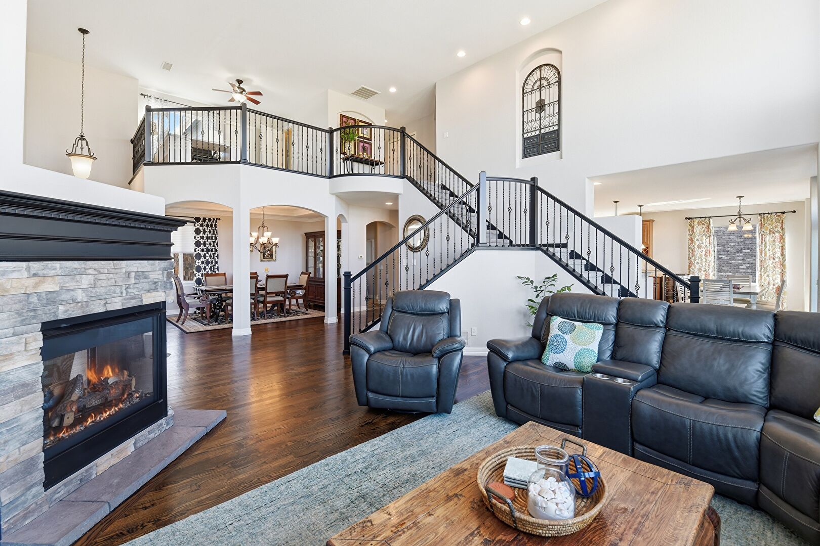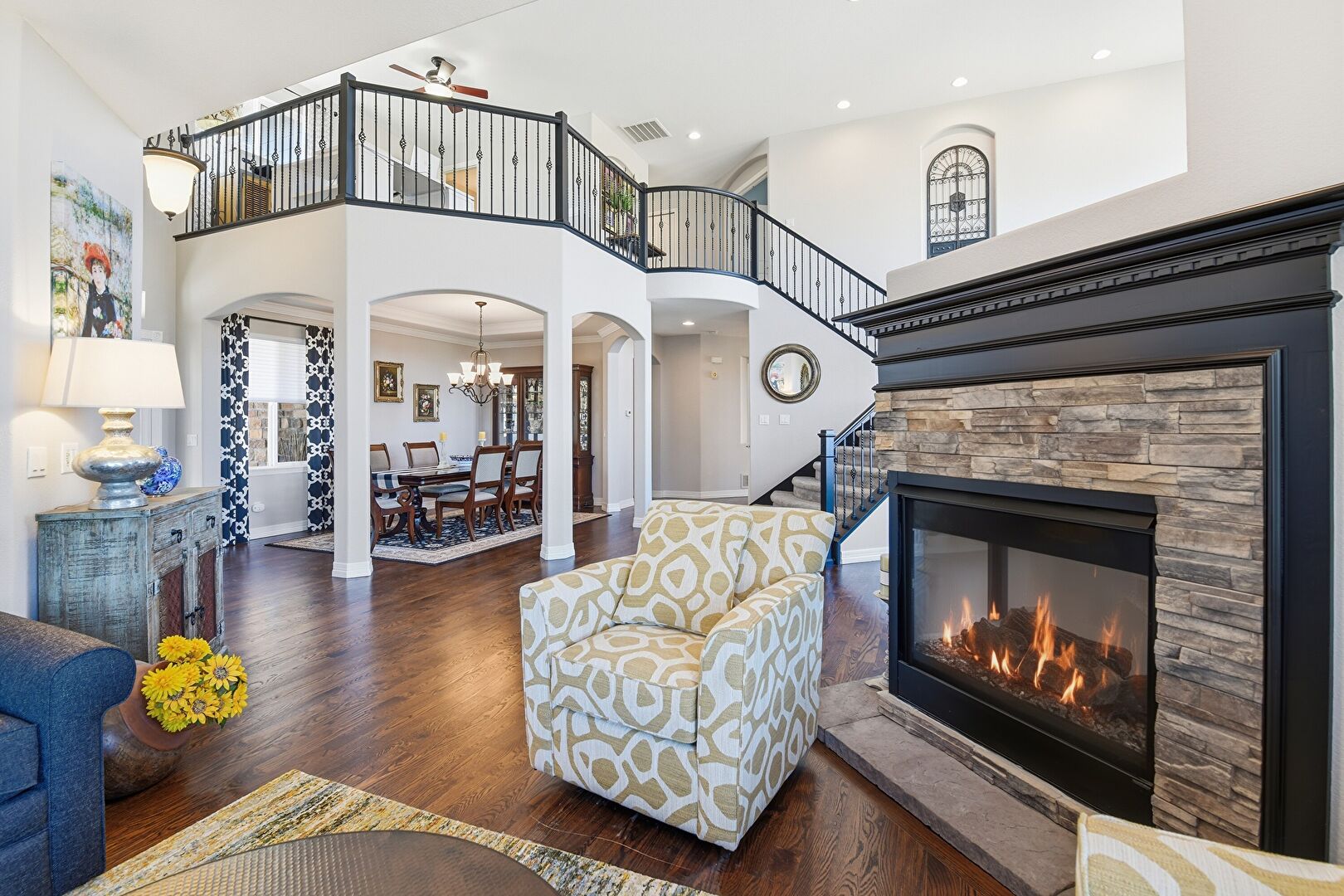 Arched Walkways, Baseboards Wall, Ceiling Fan, Drywall, Fireplace, High Ceiling, Natural Light, Notable Chandelier, Recessed Lighting, Stairs, Vent, Wood Finish Floor, Ceiling Fan, Drywall, Vent, Wood Finish Floor