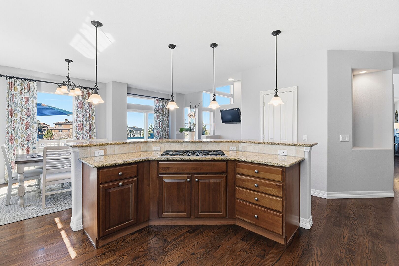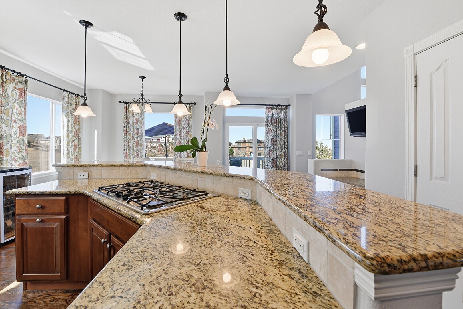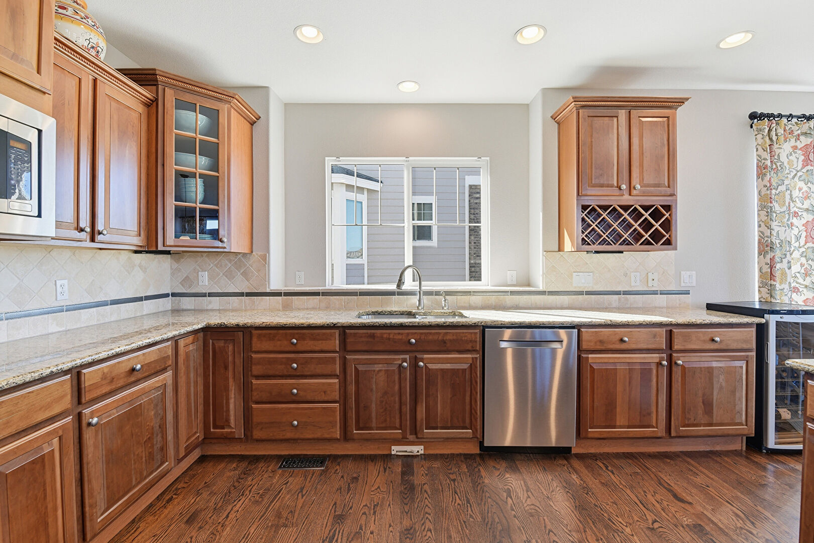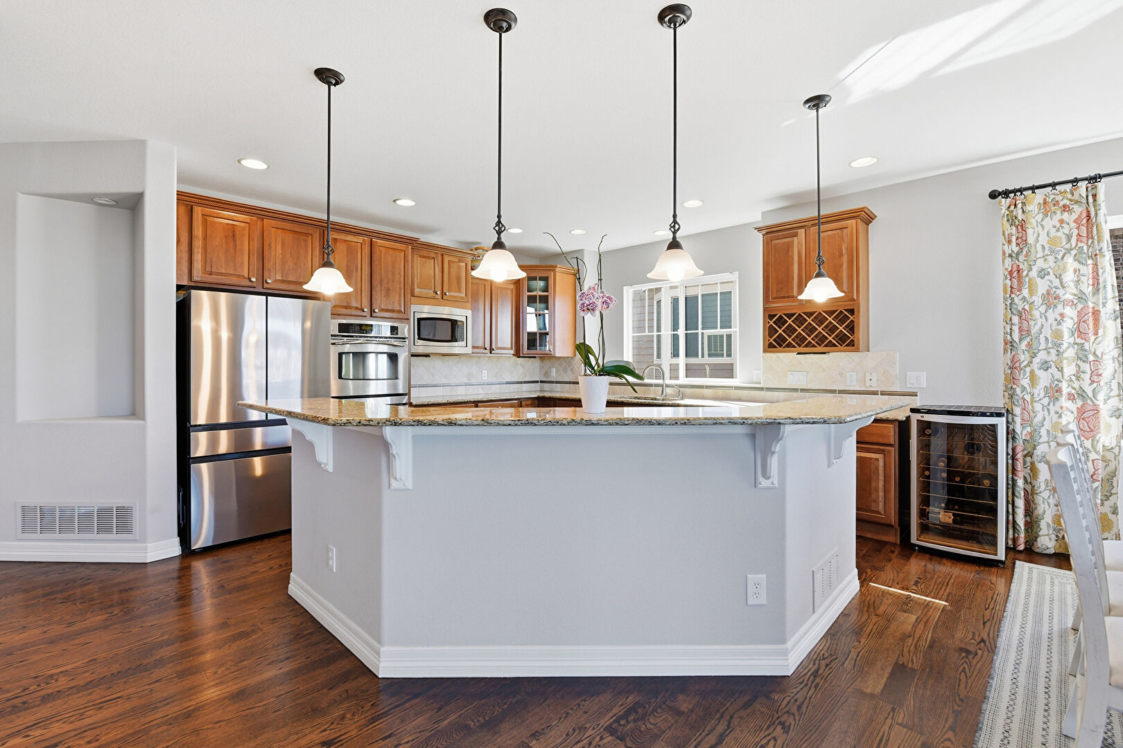 Arched Walkways, Baseboards Wall, Crown Molding Cabinets, Dark Brown Cabinets, Double Oven, Drywall, Glass Insert Cabinets, Kitchen Island, L Shaped Kitchen, Medium Brown Cabinets, Natural Light, Pendant Lighting, Raised Cabinets, Recessed Lighting, Stone Countertops, Vent, Wine Cooler, Wood Finish Floor, Baseboards Wall, Drywall, Kitchen Bar, Raised Cabinets, Vent