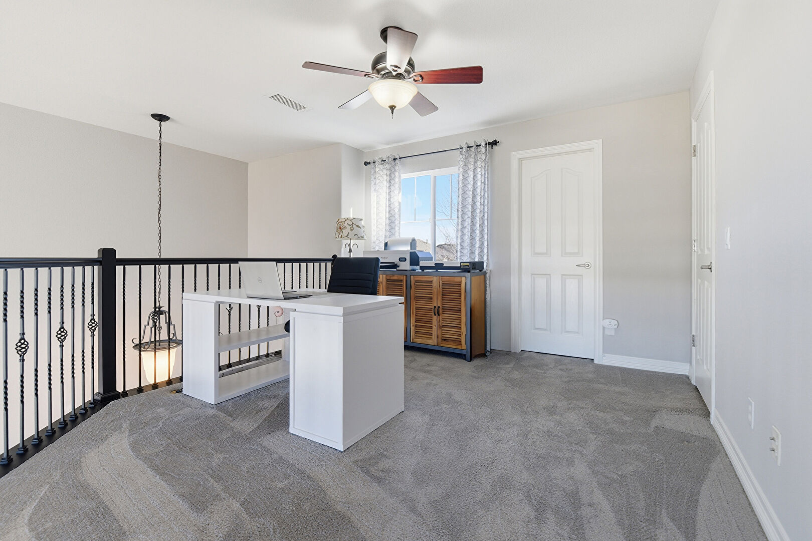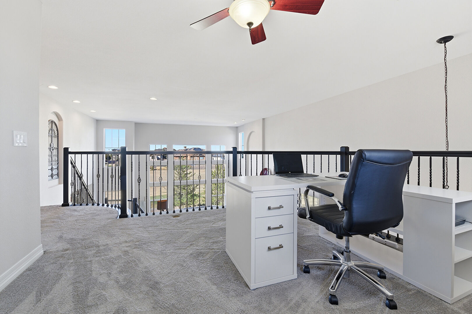 Baseboards Wall, Carpet, Ceiling Fan, Drywall, Natural Light, Office Area, Recessed Lighting, Vent, Carpet, Ceiling Fan