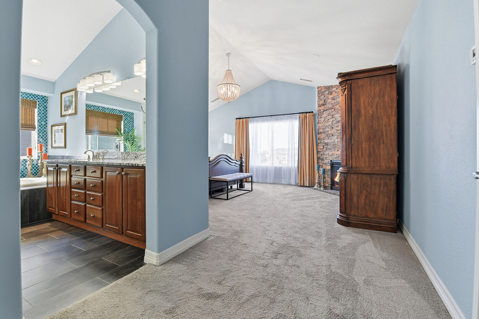 Baseboards Wall, Carpet, Cathedral Ceiling, Double Vanity, Drywall, Fireplace, Full Bathroom, High Ceiling, Natural Light, Notable Chandelier, Stone Wall, Vaulted Ceiling, Vent, Wood Finish Floor, Cathedral Ceiling, Drywall, Notable Chandelier, Vaulted Ceiling