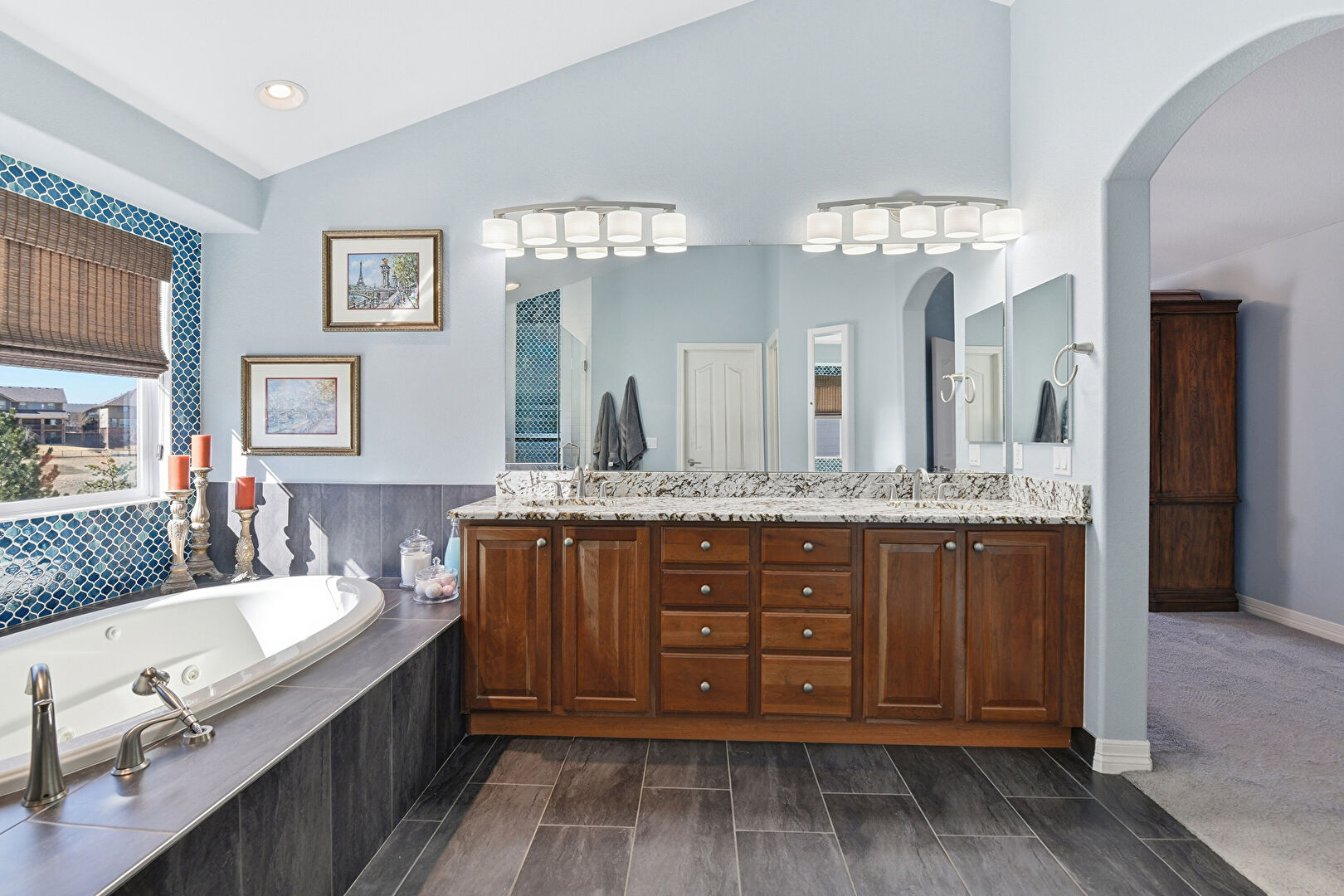Baseboards Wall, Double Vanity, Full Bathroom, Natural Light, Recessed Lighting, Tile Floor, Vanity, Vaulted Ceiling, Wood Finish Floor, Drywall
