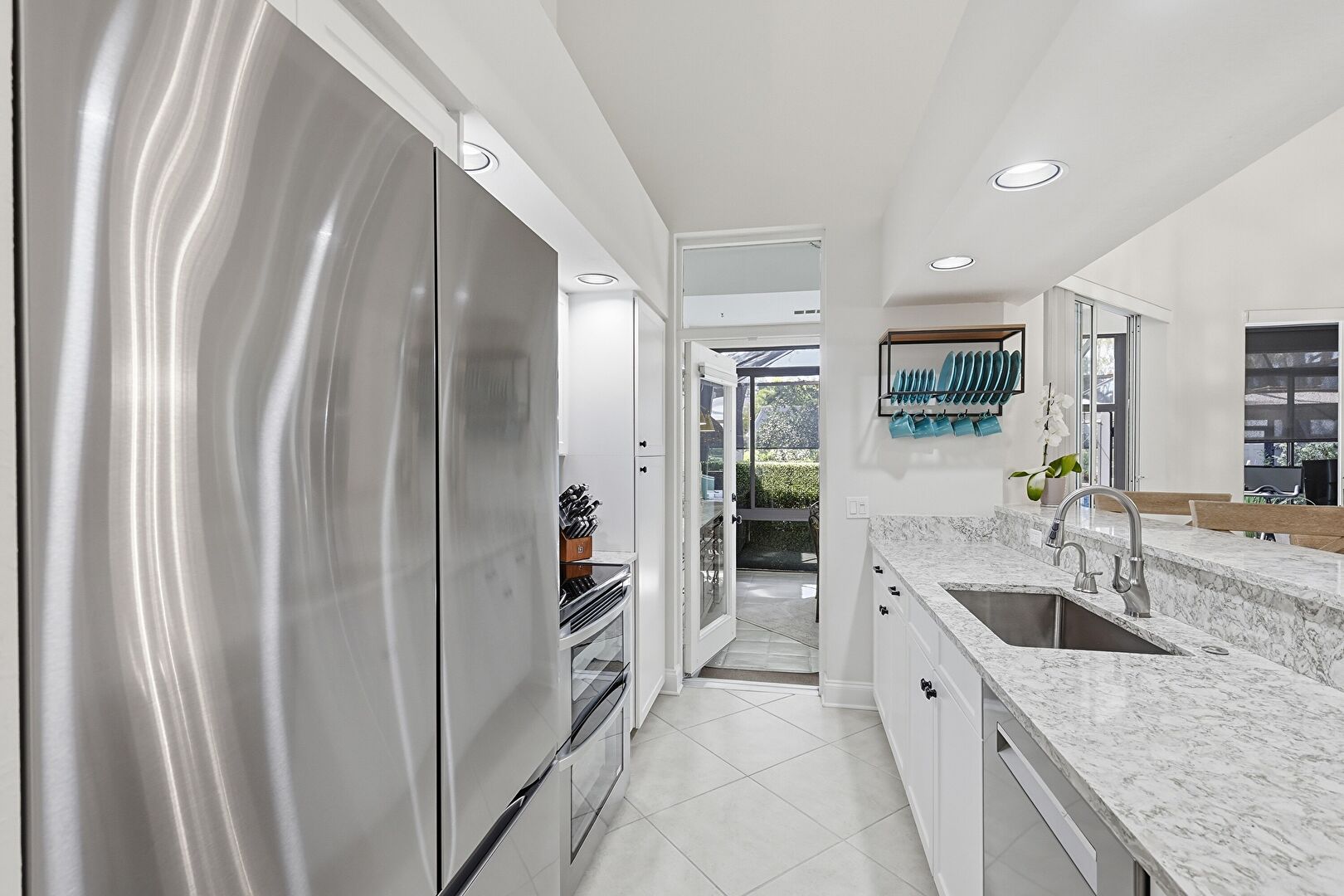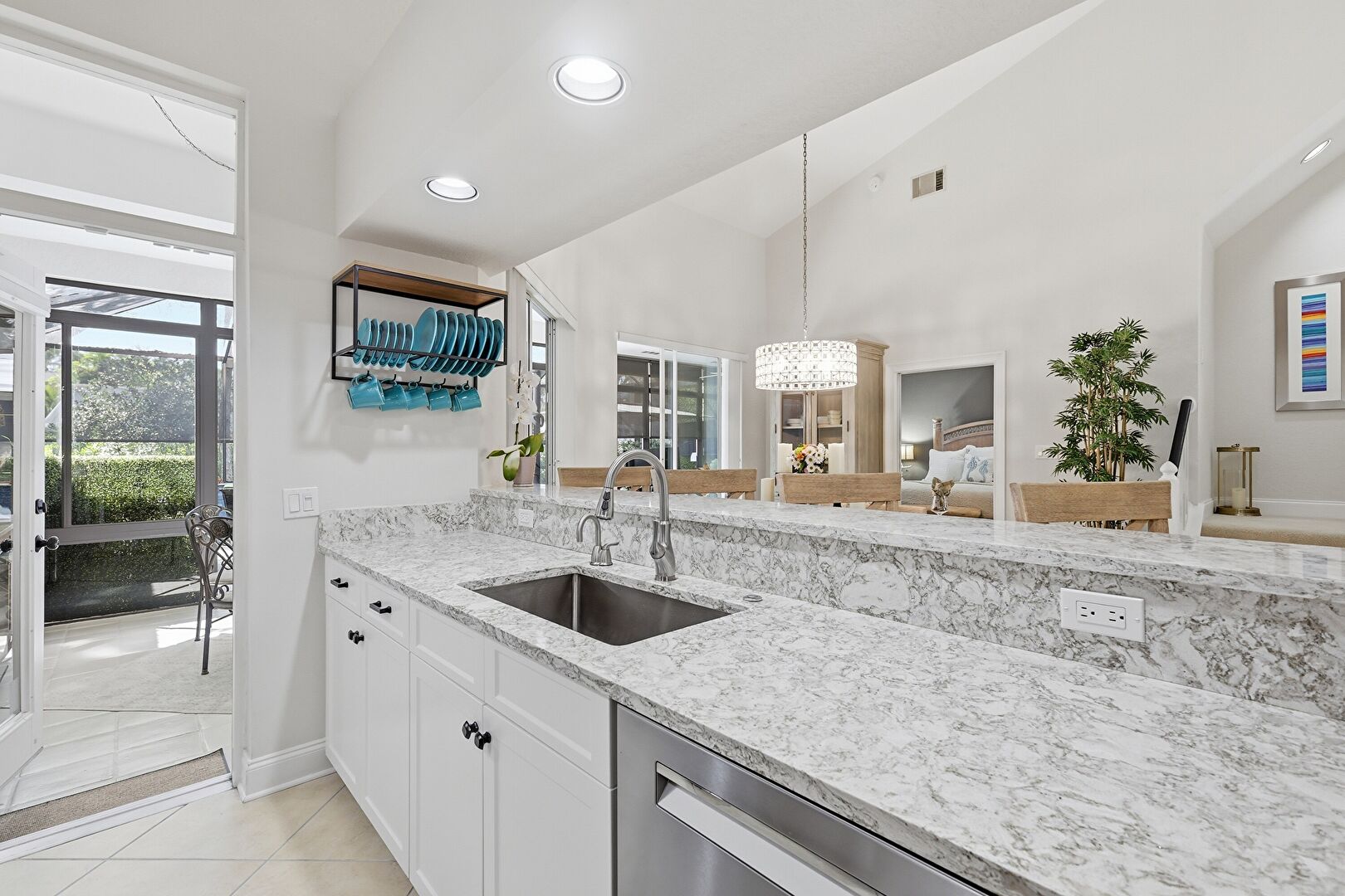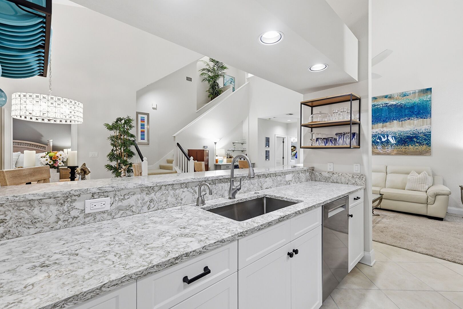 Baseboards Wall, Drywall, Galley Kitchen, High Ceiling, Kitchen Bar, Kitchen Peninsula, Natural Light, Notable Chandelier, Open Shelves, Pass Through Window, Pendant Lighting, Recessed Lighting, Shaker Cabinets, Stone Countertops, Tile Floor, Vaulted Ceiling, Vent, Baseboards Wall, Kitchen Peninsula, Opens To Living Area, Stone Countertops