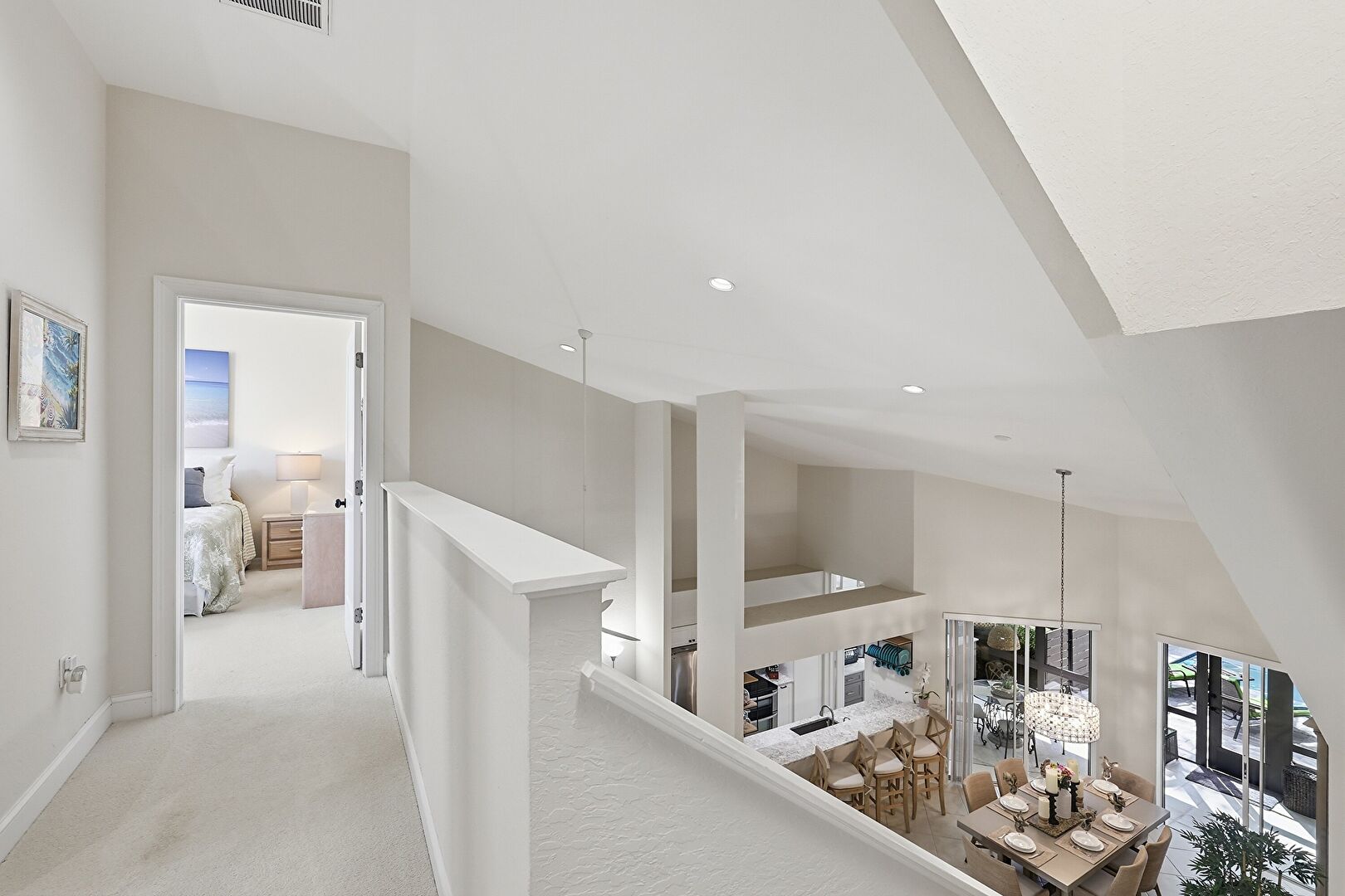 Baseboards Wall, Carpet, Crown Molding, Drywall, Loft, Natural Light, Notable Chandelier, Recessed Lighting, Upstairs Landing, Vaulted Ceiling, Vent, Drywall, High Ceiling