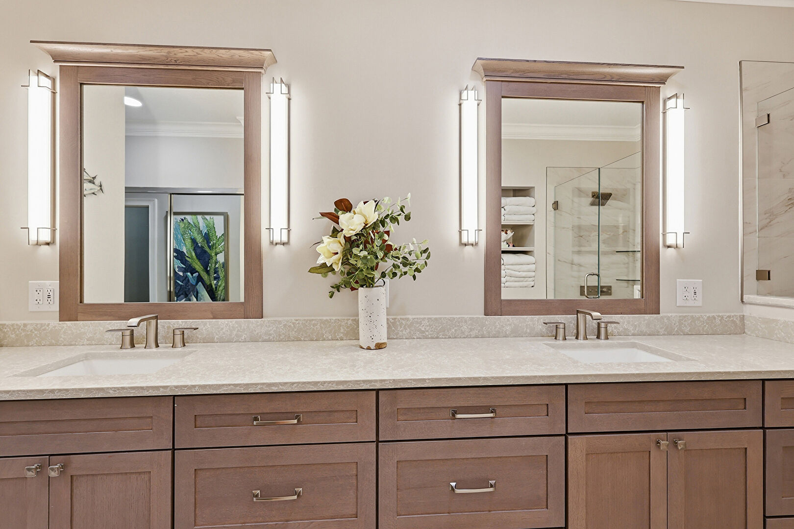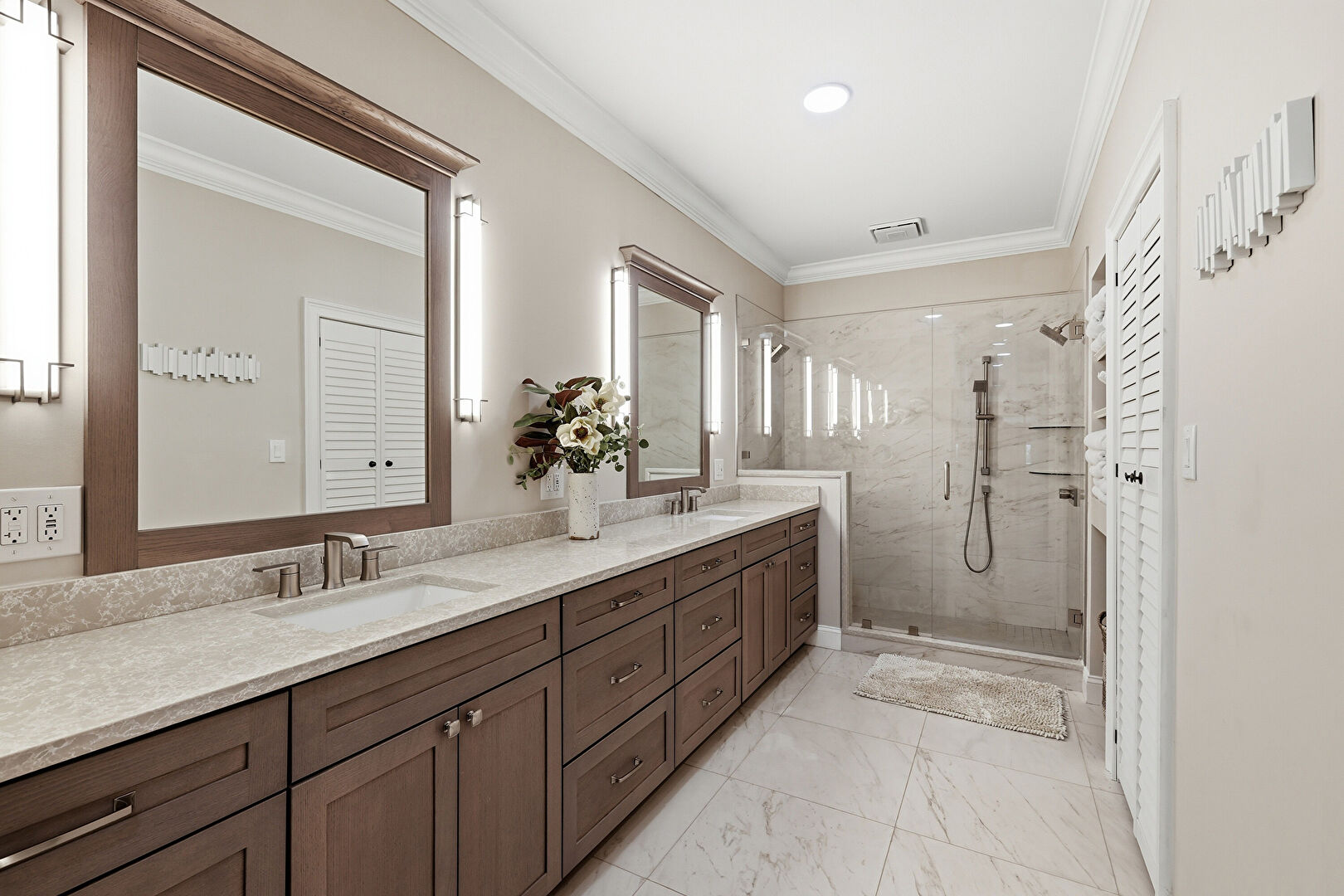 Baseboards Wall, Closet, Combined Bath Shower, Crown Molding, Double Vanity, Drywall, Full Bathroom, Marble Finish Floor, Natural Light, Recessed Lighting, Tile Floor, Two Single Vanities, Vanity, Vent, Walk In Closet, Wood Wall, Carpet, Crown Molding, Full Bathroom, Recessed Lighting, Two Single Vanities, Vanity