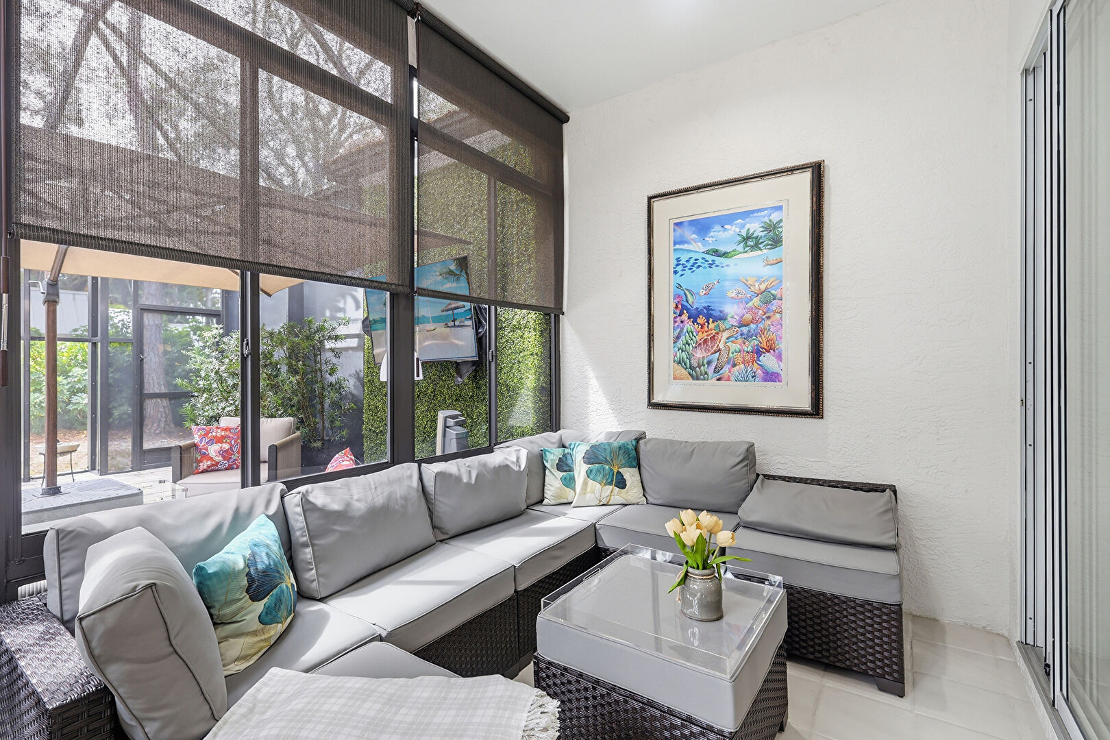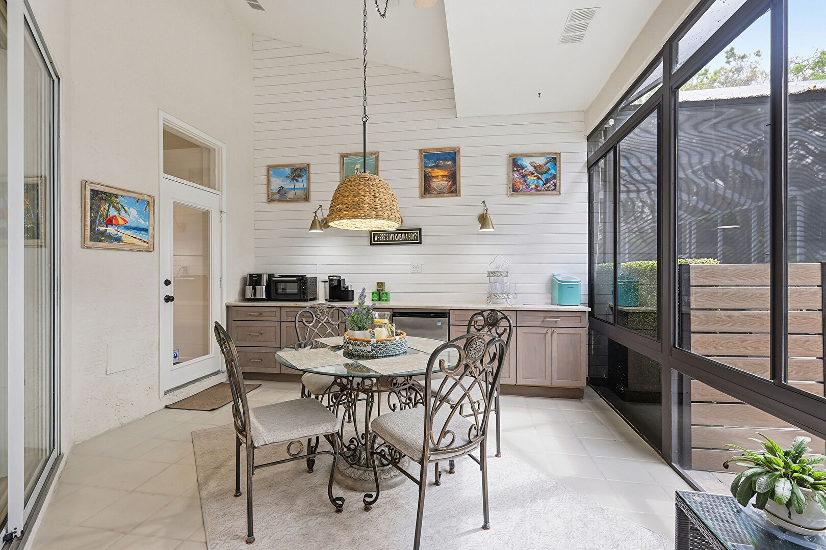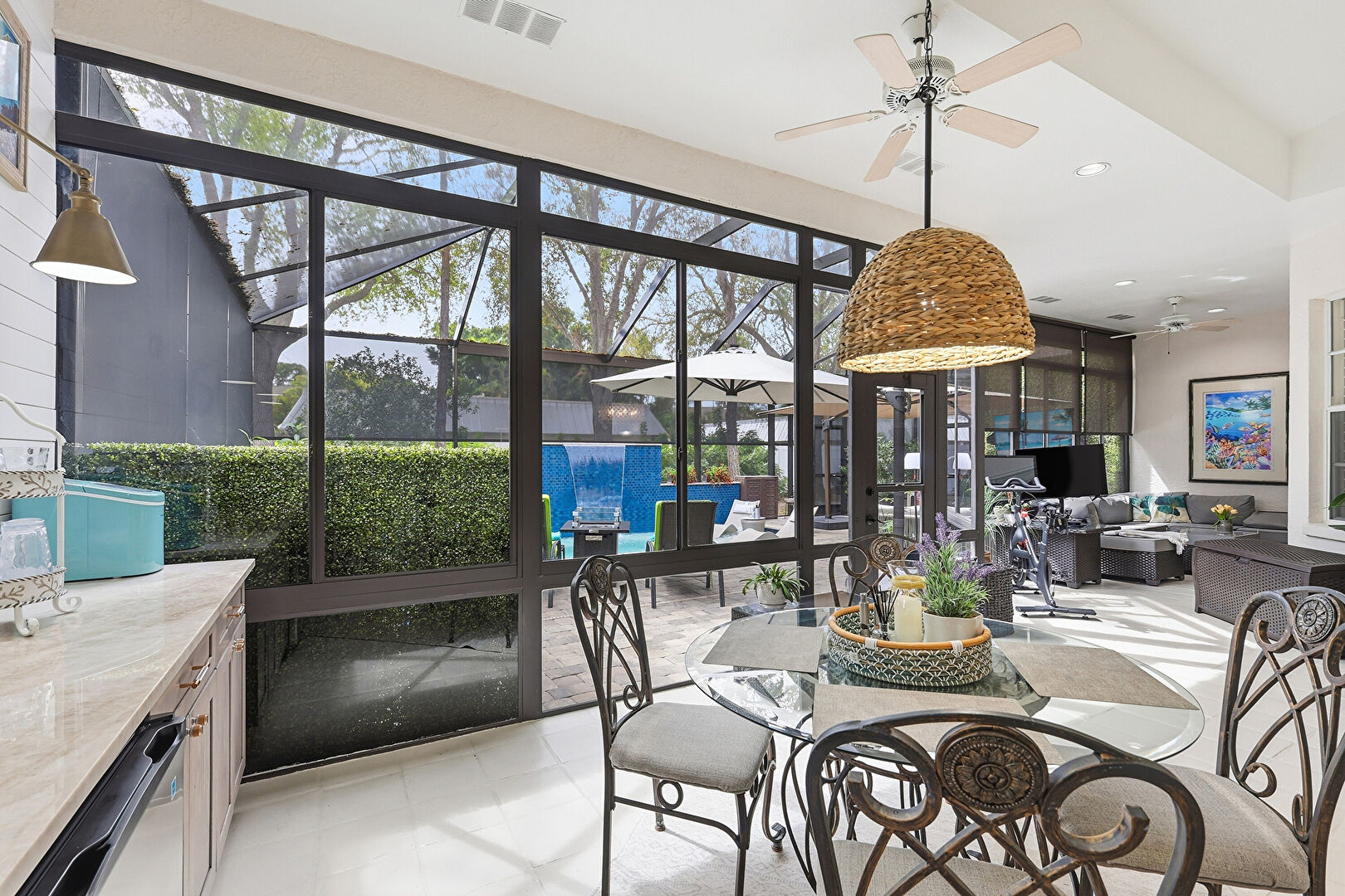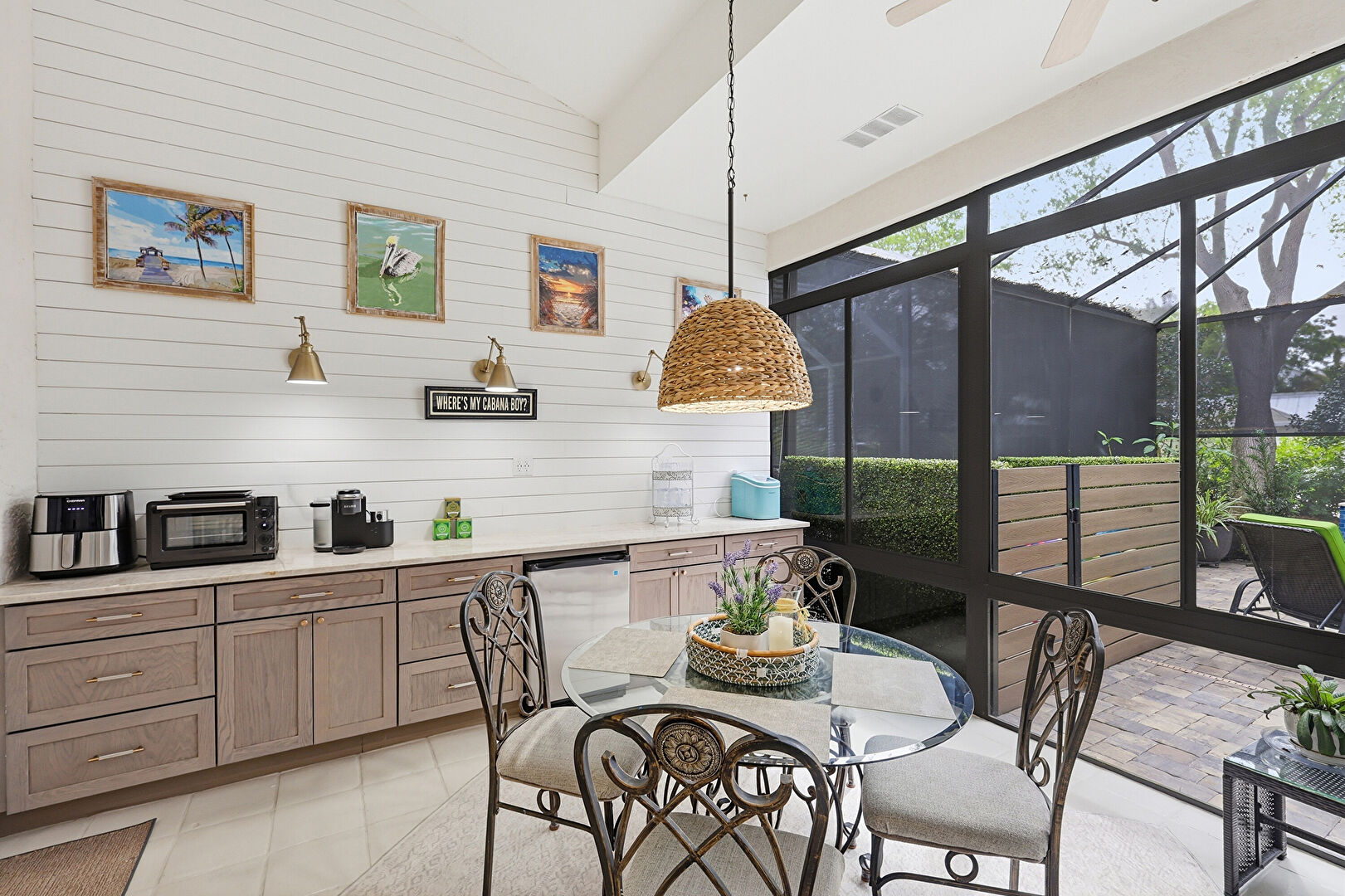 Ceiling Fan, Drywall, Floor Ceiling Windows, Gray Cabinets, Lanai, Natural Light, Outdoor Dining Area, Outdoor Kitchen, Outdoor Living Space, Patio, Shaker Cabinets, Stone Countertops, Sunroom, Textured Wall, Tile Floor, Toaster, Vent, Lanai, Patio, Tile Floor, Vent, Wood Wall