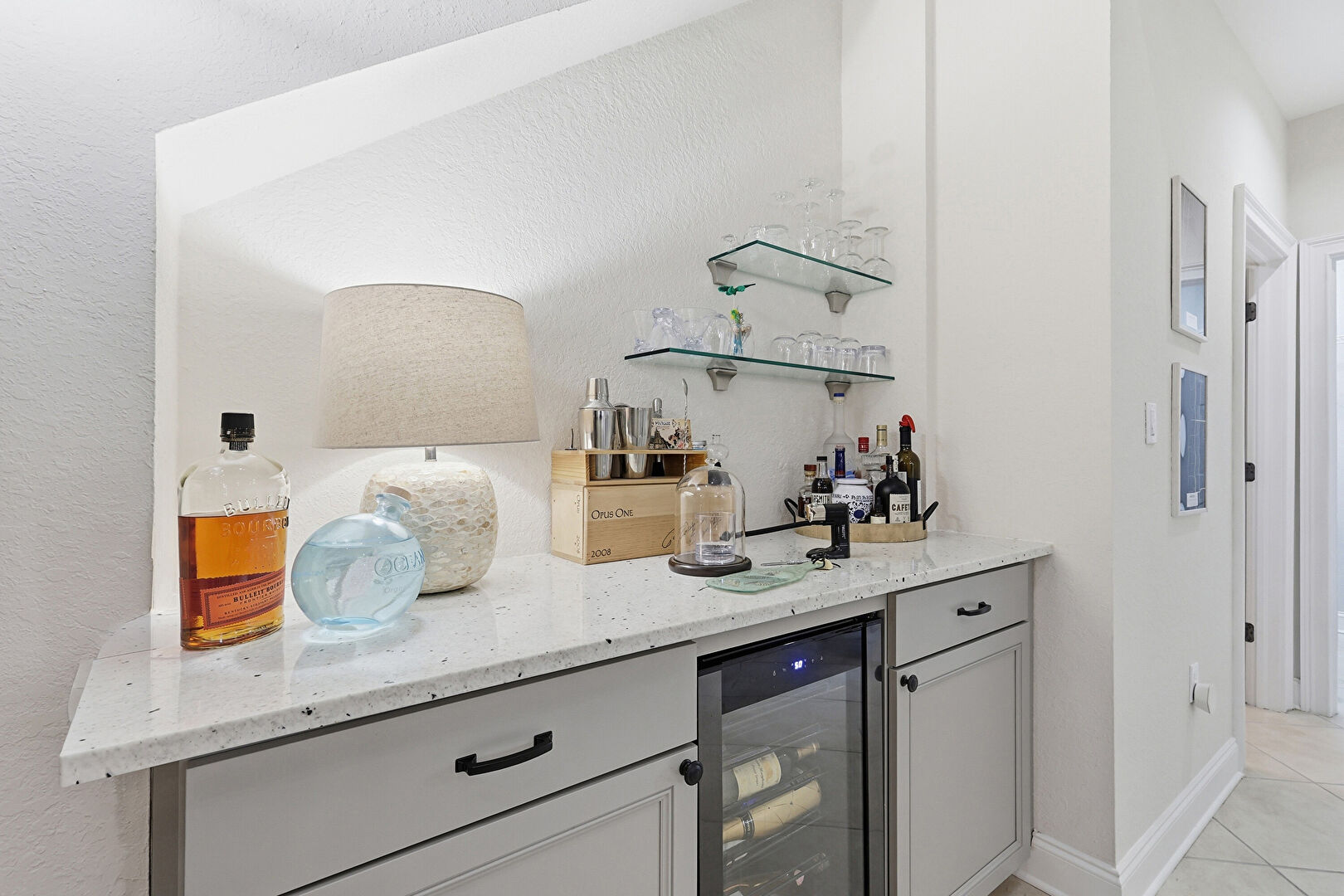 Baseboards Wall, Drywall, Gray Cabinets, High Ceiling, Indoor Bar, Natural Light, Notable Chandelier, Open Shelves, Pendant Lighting, Recessed Lighting, Shaker Cabinets, Stairs, Stone Countertops, Textured Wall, Tile Floor, Vaulted Ceiling, Vent, Wine Cooler, Baseboards Wall, Stone Countertops, Wine Cooler