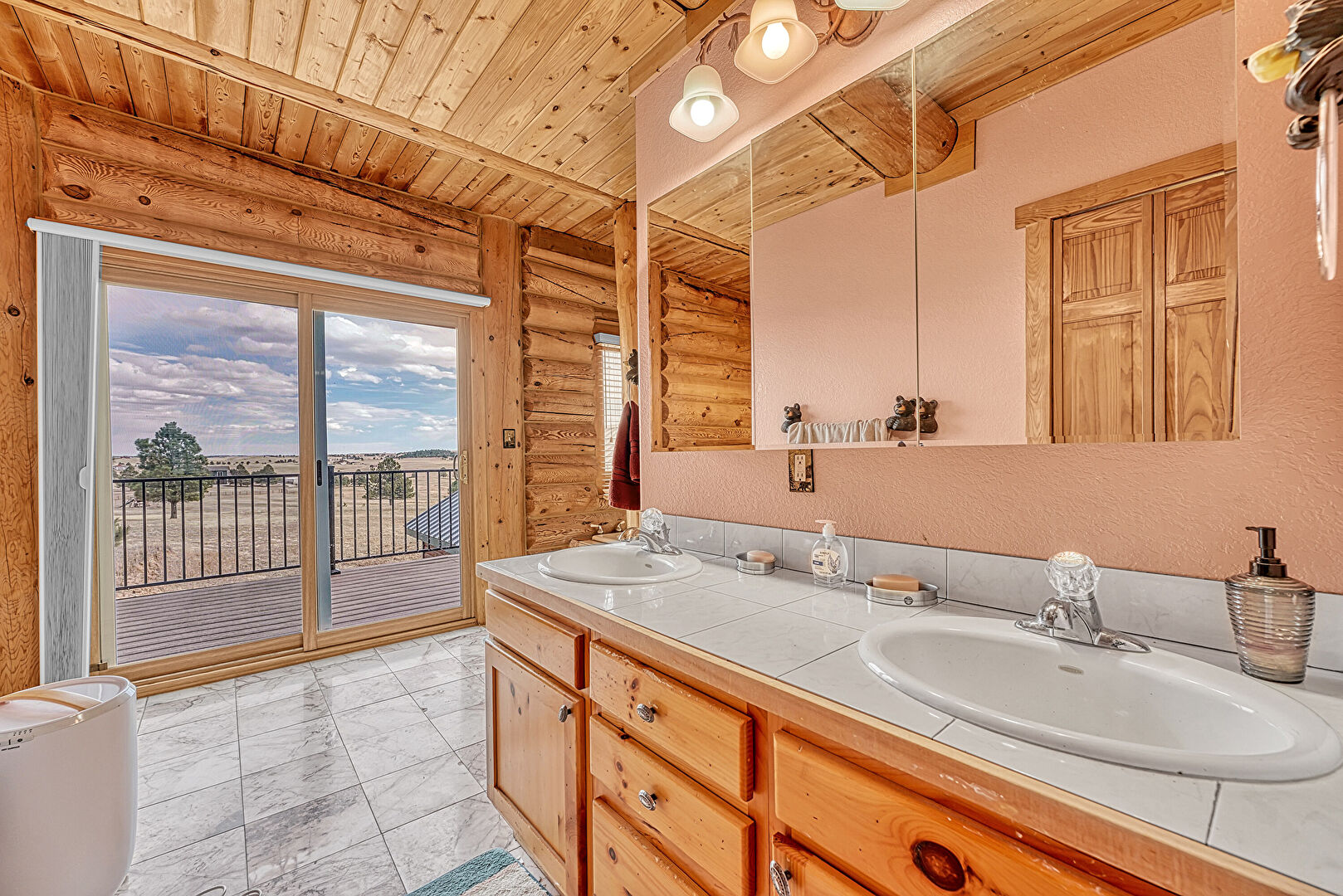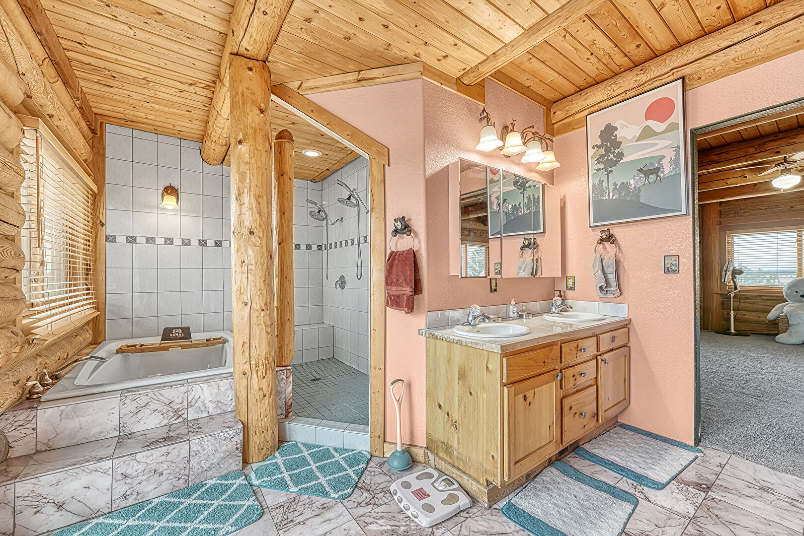 Beamed Ceiling, Ceiling Fan, Double Vanity, Ensuite Bathroom, Full Bathroom, Log Wall, Marble Finish Floor, Natural Light, Textured Wall, Wood Ceiling, Carpet, Full Bathroom