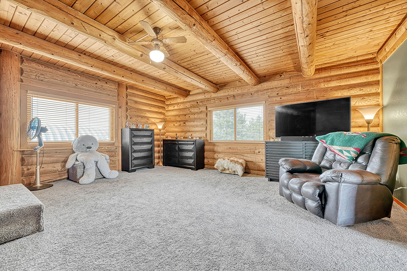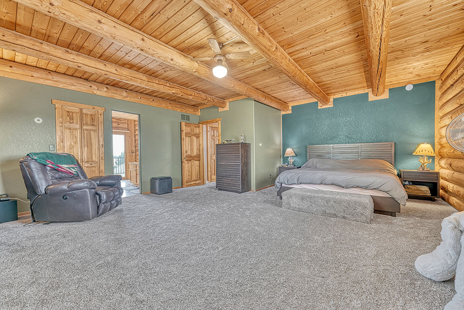 Access To Exterior, Baseboards Wall, Beamed Ceiling, Carpet, Ceiling Fan, Log Wall, Natural Light, Textured Wall, Vent, Wood Ceiling, Beamed Ceiling, Log Wall, Vent