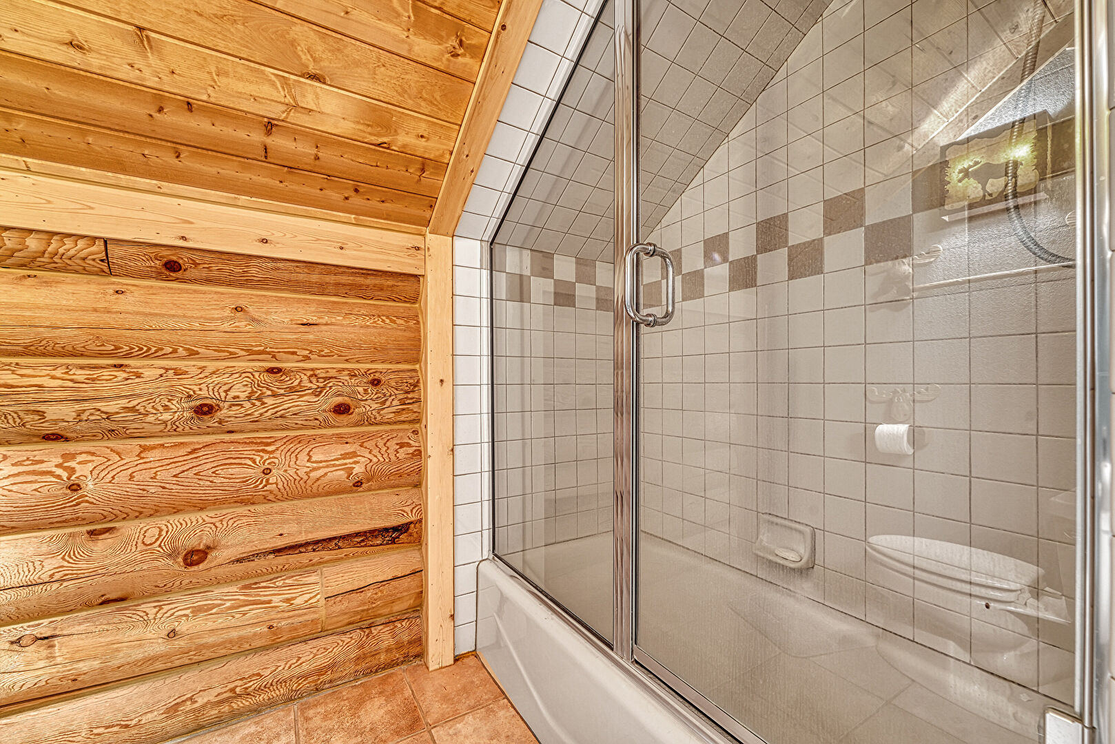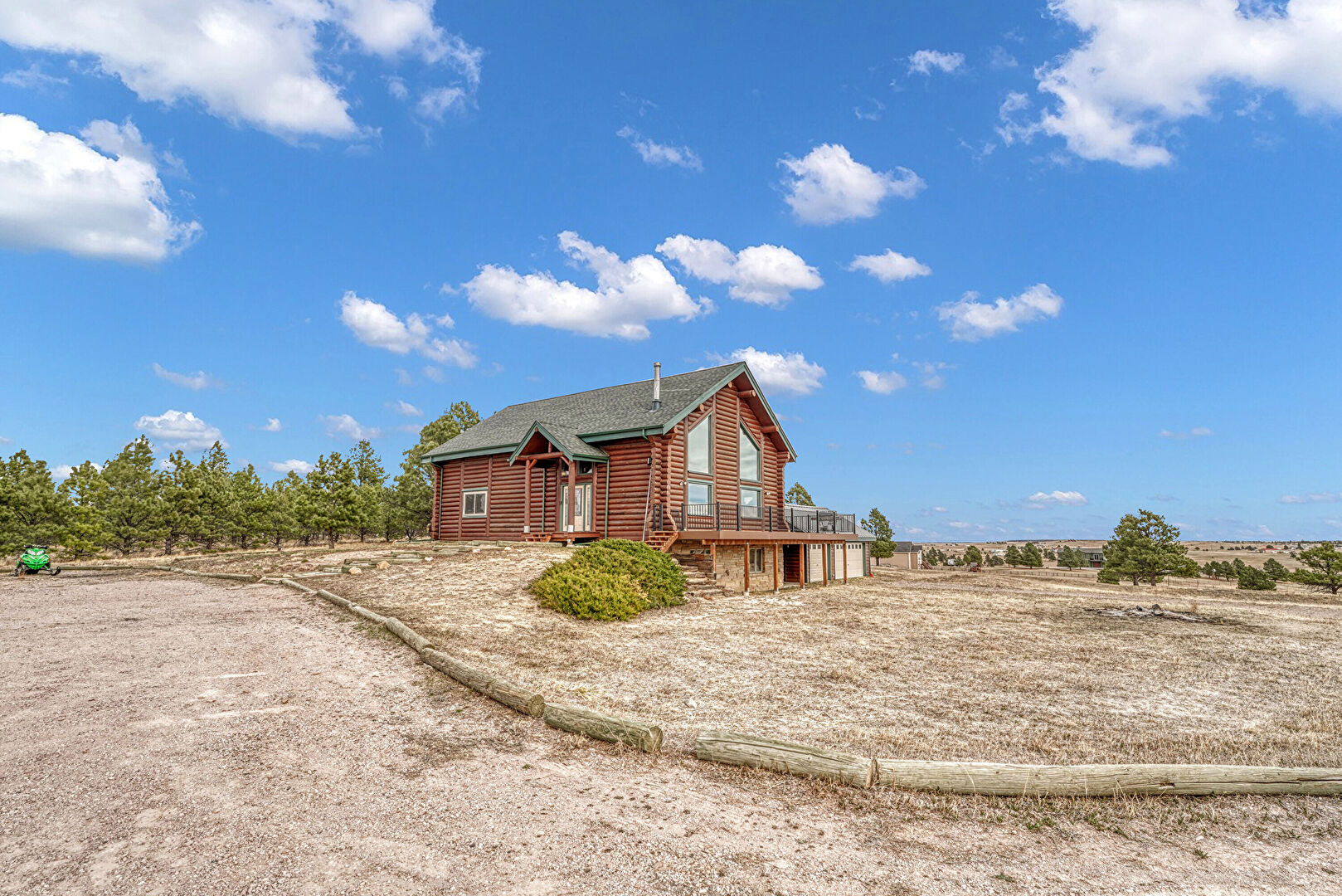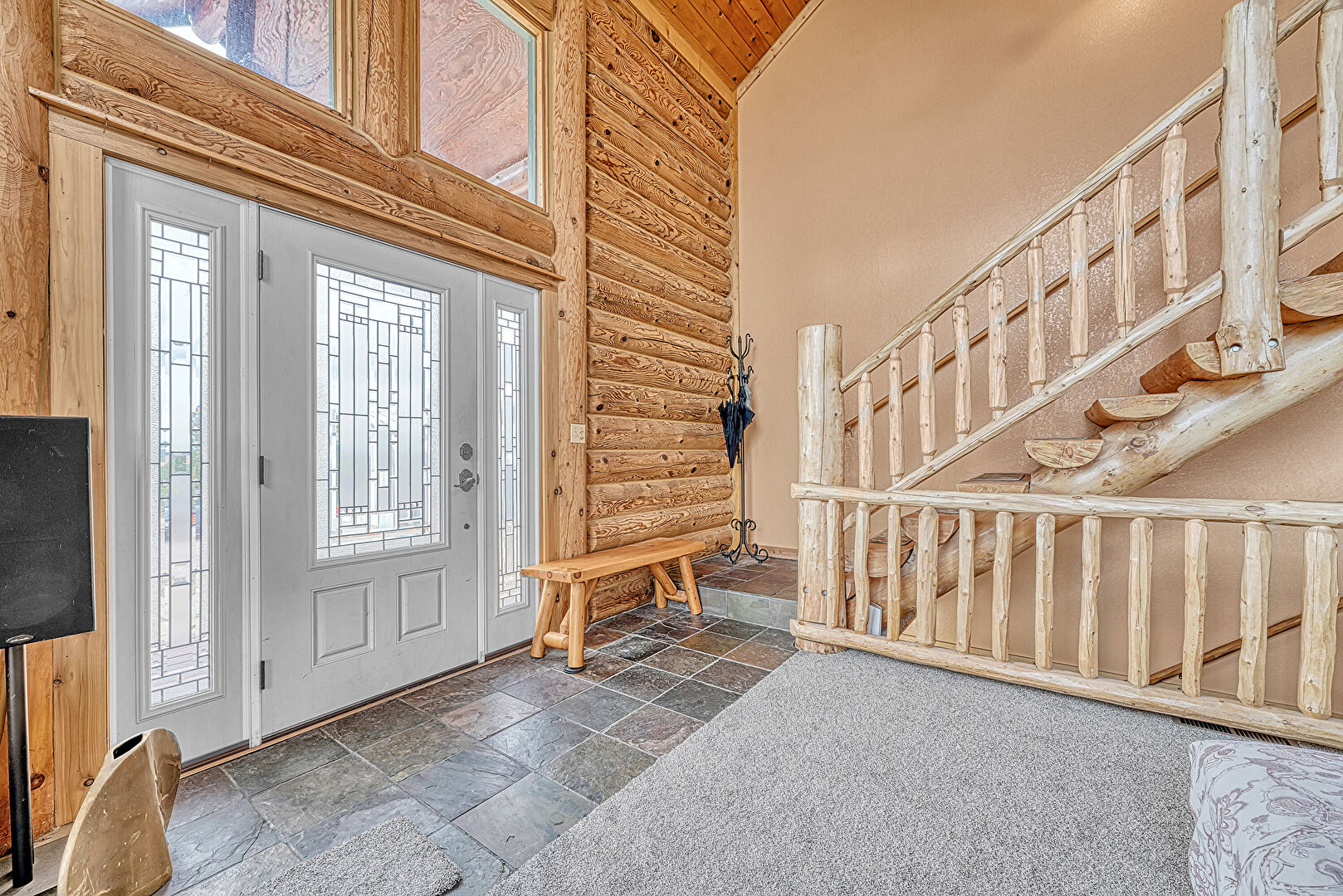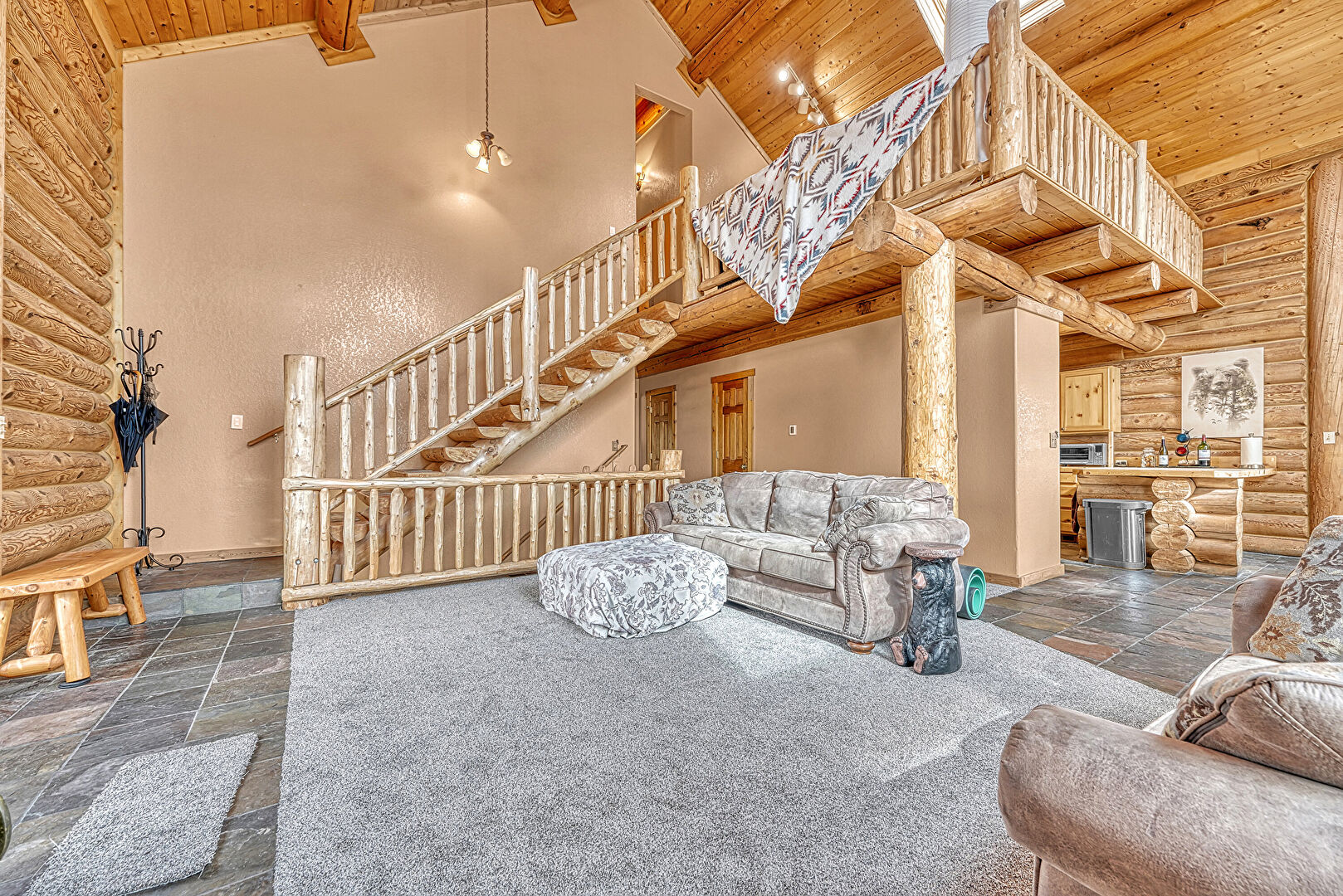 High Ceiling, Log Wall, Stone Finish Floor, Natural Light