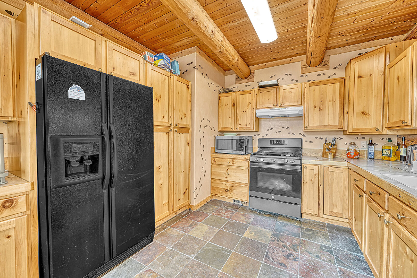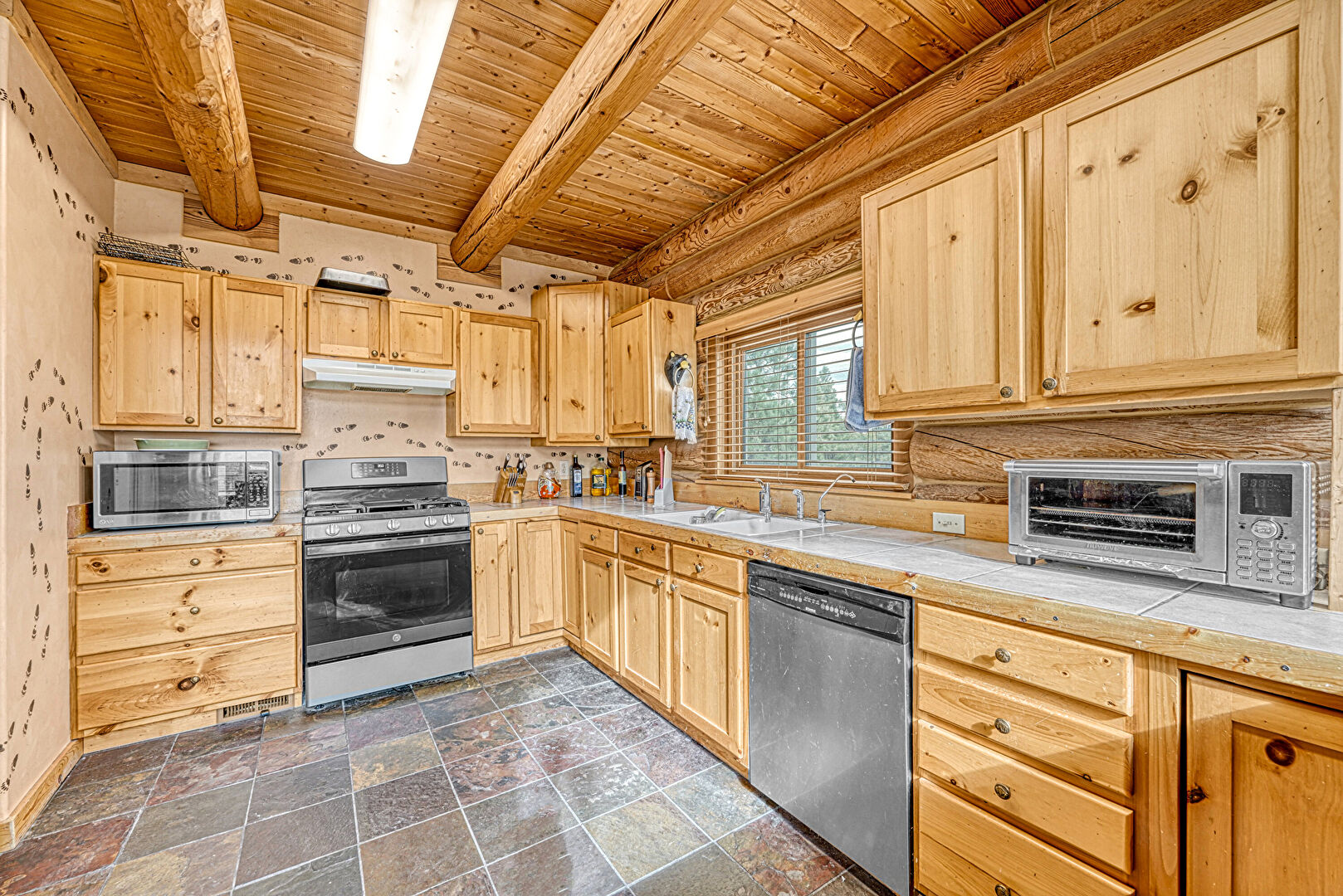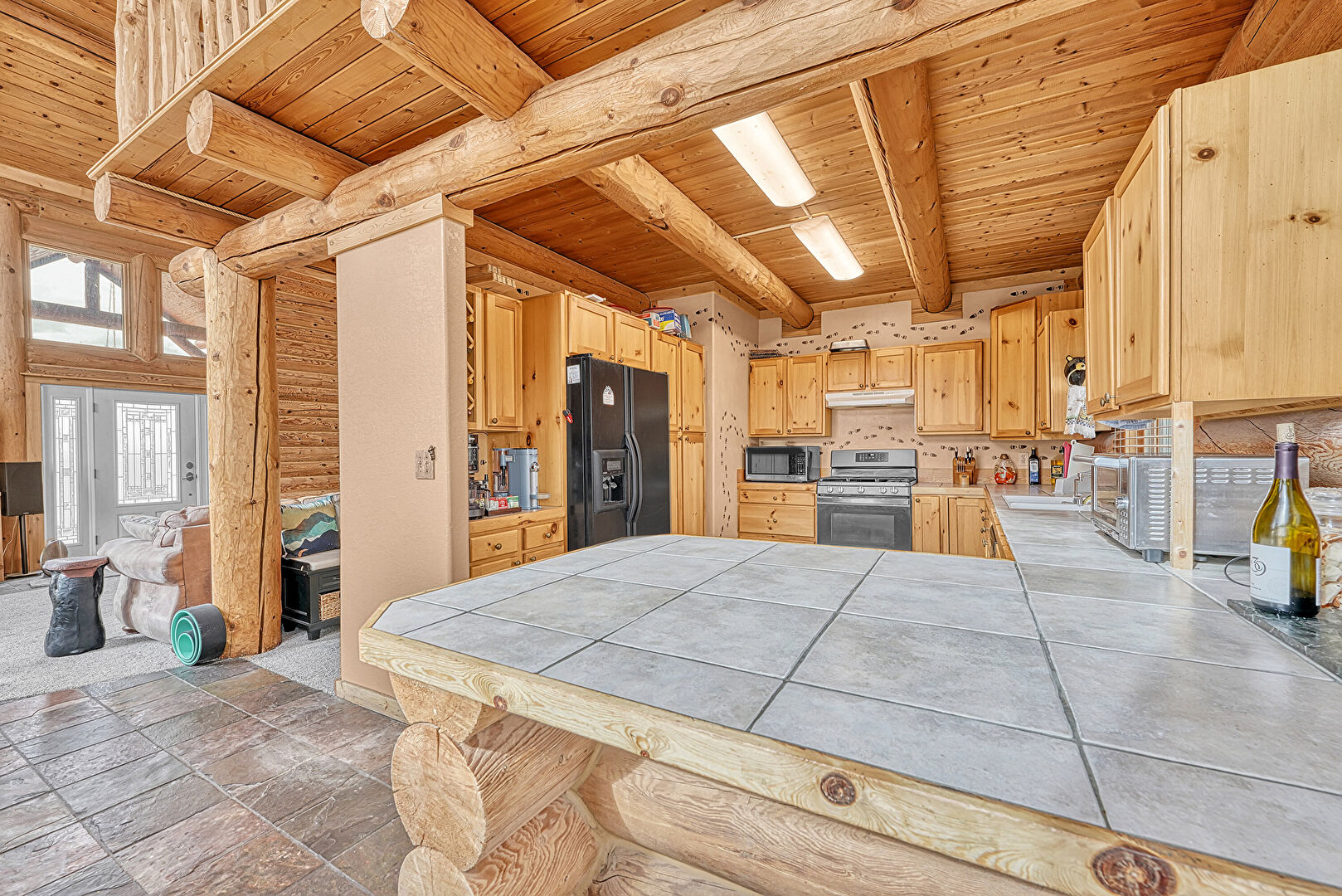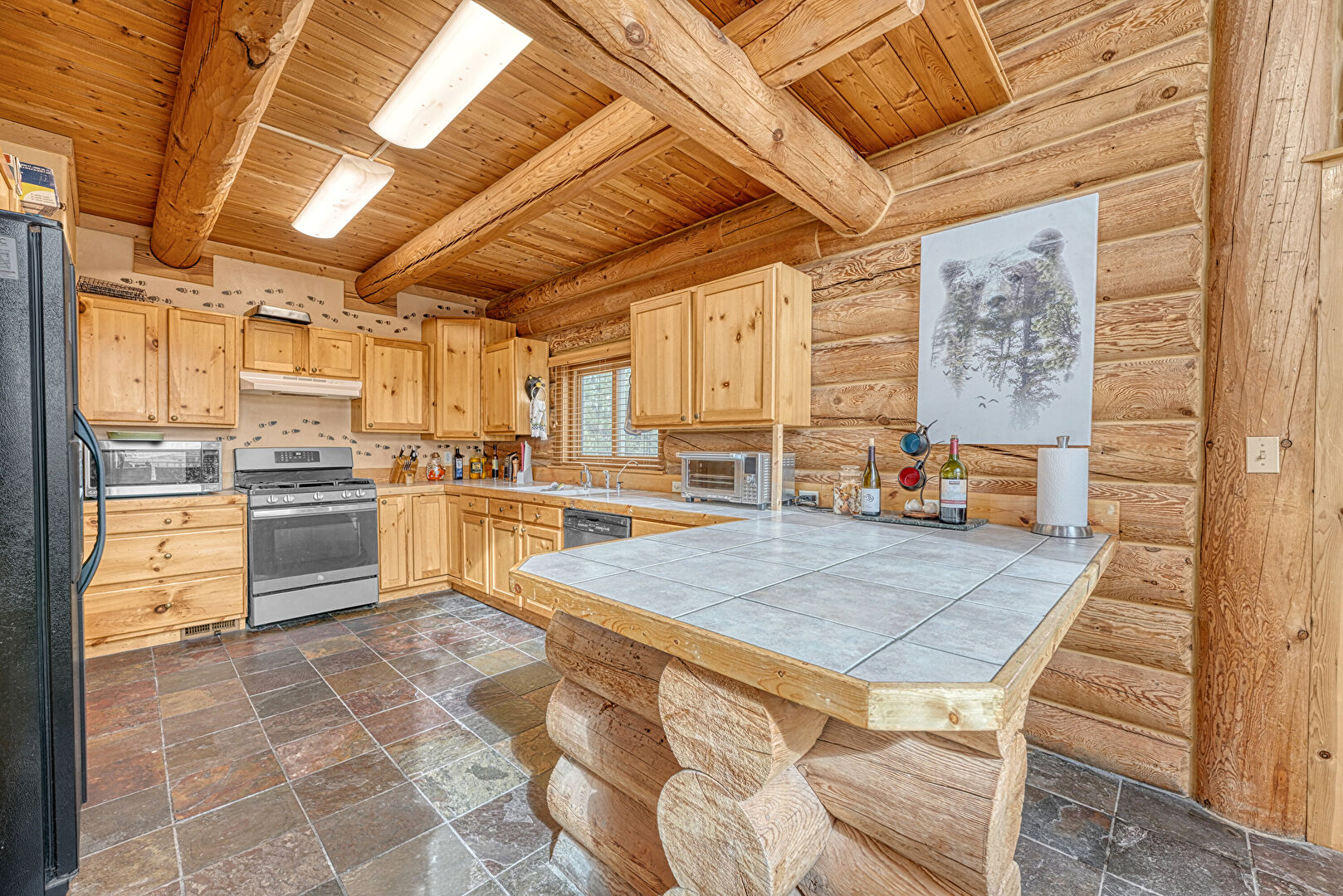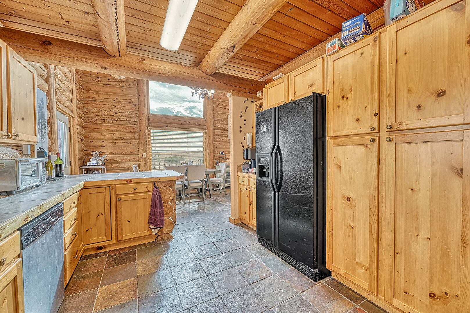 Beamed Ceiling, G Shaped Kitchen, Kitchen Peninsula, Log Wall, Natural Light, Shaker Cabinets, Stone Finish Floor, Tile Countertops, Toaster, Vent, Wood Ceiling, Kitchen Peninsula, Shaker Cabinets, Stone Finish Floor, Tile Countertops, Toaster, Wood Ceiling