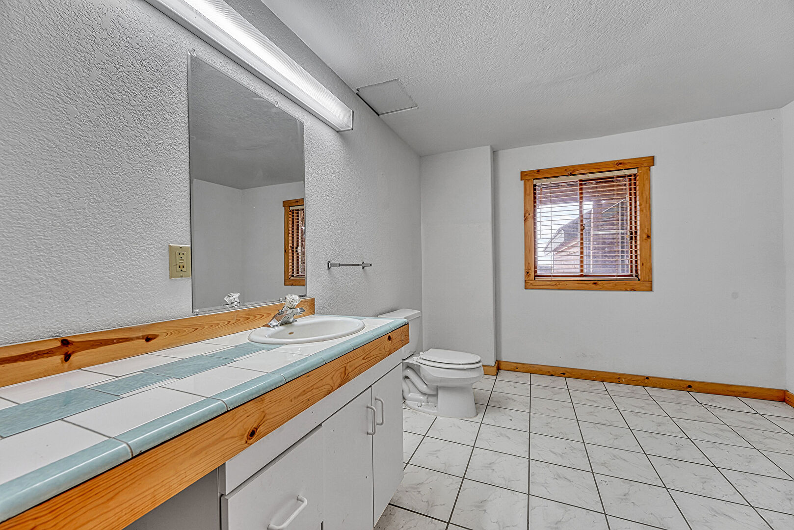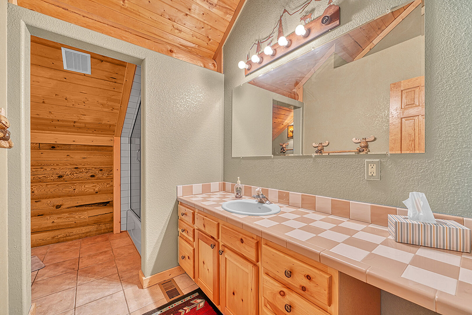 Baseboards Wall, Combined Bath Shower, Ensuite Bathroom, Full Bathroom, Natural Light, Textured Ceiling, Textured Wall, Tile Floor, Vanity, Vaulted Ceiling, Vent, Wood Ceiling, Half Bathroom, Textured Wall, Tile Floor, Vanity, Vent