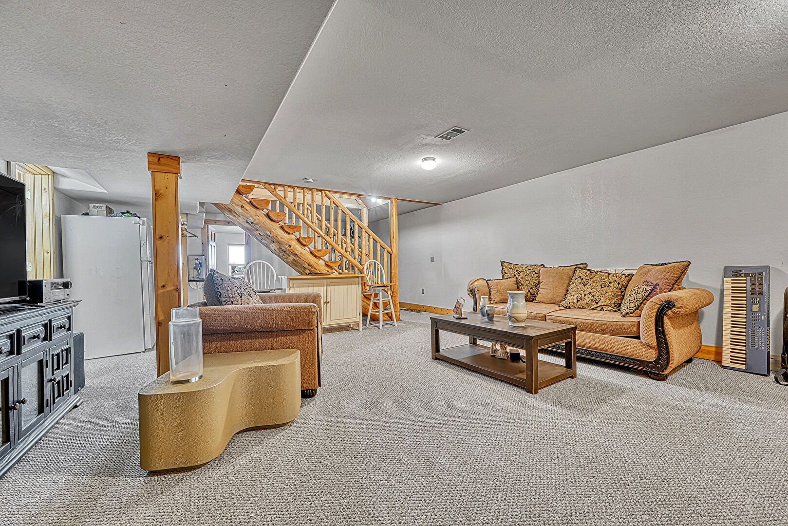 Baseboards Wall, Basement, Carpet, Decorative Columns, Drywall, Natural Light, Stairs, Textured Ceiling, Vent, Baseboards Wall, Stairs, Textured Ceiling