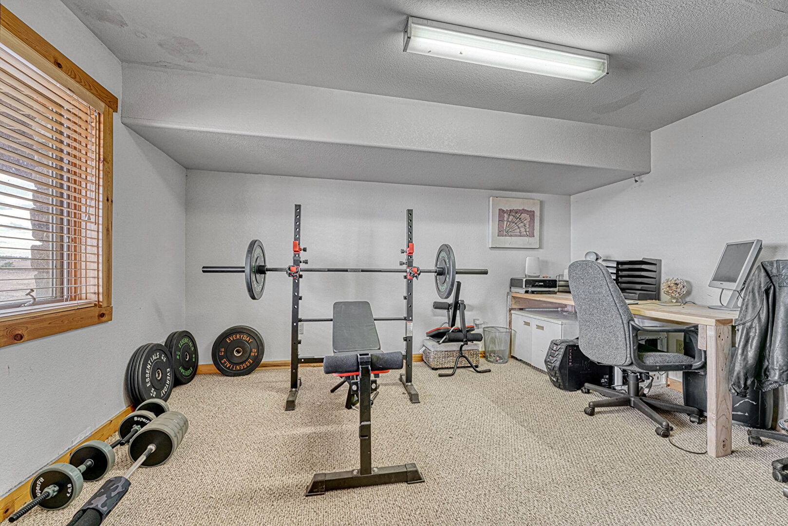 Baseboards Wall, Basement, Carpet, Drywall, Natural Light, Textured Ceiling, Office Area