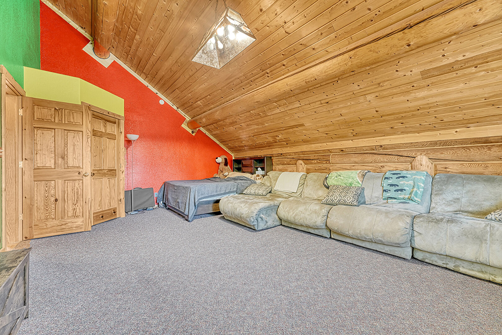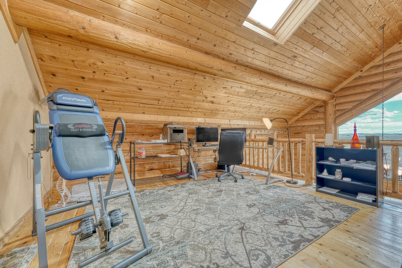 Baseboard Radiator, Baseboards Wall, Bonus Room, Carpet, Crown Molding, High Ceiling, Log Wall, Natural Light, Office Area, Skylight, Textured Ceiling, Textured Wall, Vaulted Ceiling, Vent, Wood Ceiling, Wood Finish Floor, Baseboards Wall, Carpet, High Ceiling, Natural Light, Textured Wall, Wood Wall