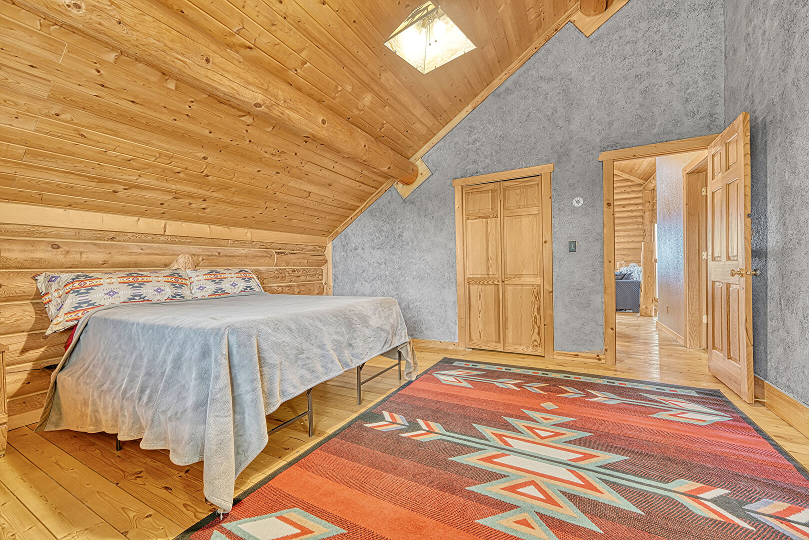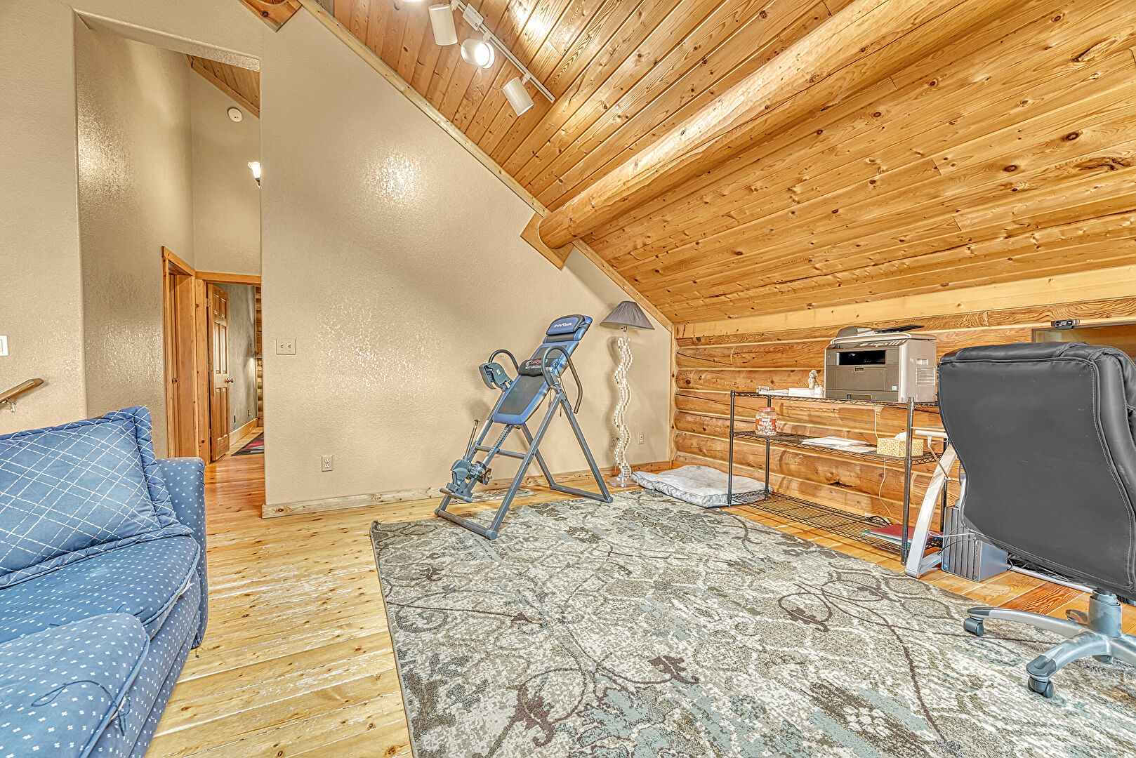 Baseboards Wall, Beamed Ceiling, Bonus Room, Cathedral Ceiling, Ceiling Fan, Drywall, High Ceiling, Log Wall, Natural Light, Office Area, Skylight, Vaulted Ceiling, Wood Ceiling, Wood Finish Floor, Space Heater, Track Lighting, Wood Ceiling