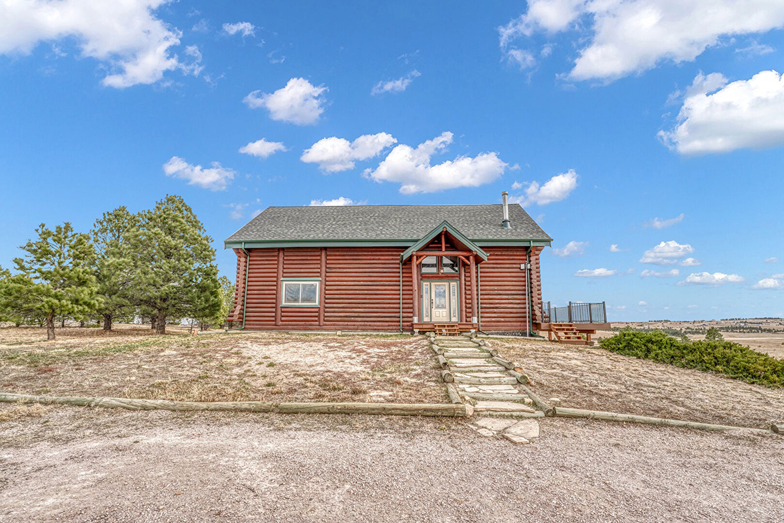 Concrete Foundation, Gutters, Horizontal Siding, Log Siding, Shingle Roof, Stoop, Downspout
