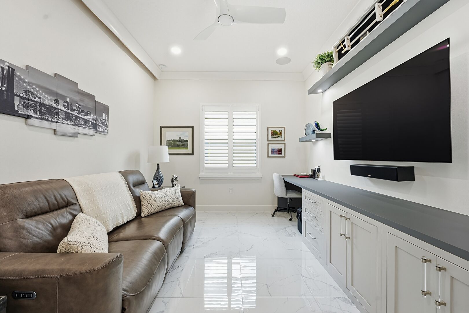 Baseboards Wall, Built In Desk, Ceiling Fan, Crown Molding, Drywall, Marble Finish Floor, Natural Light, Office Area, Recessed Lighting, Recessed Lighting, Vent