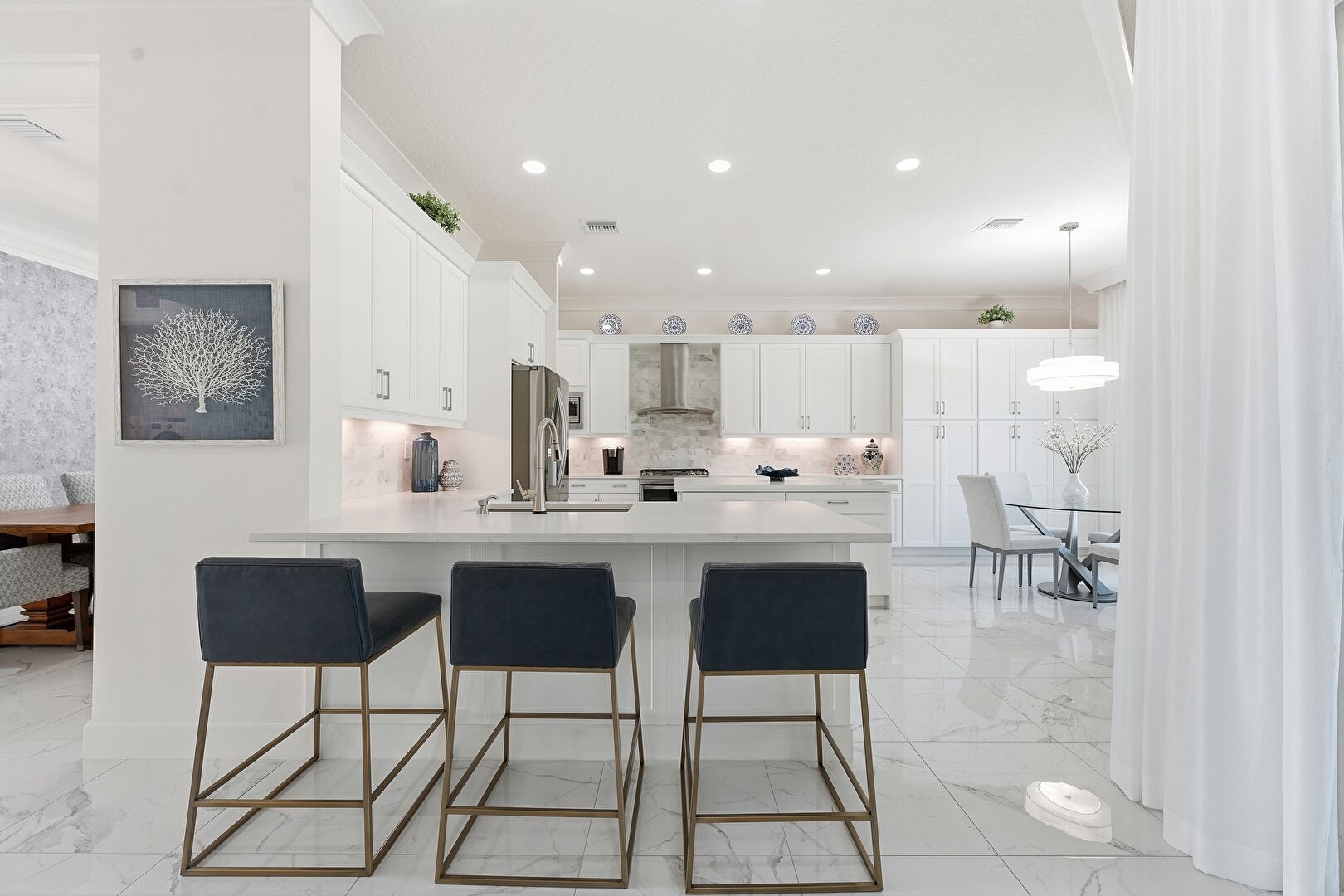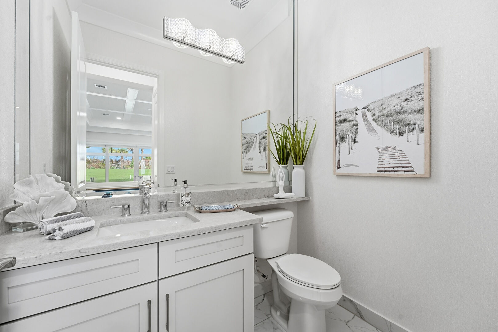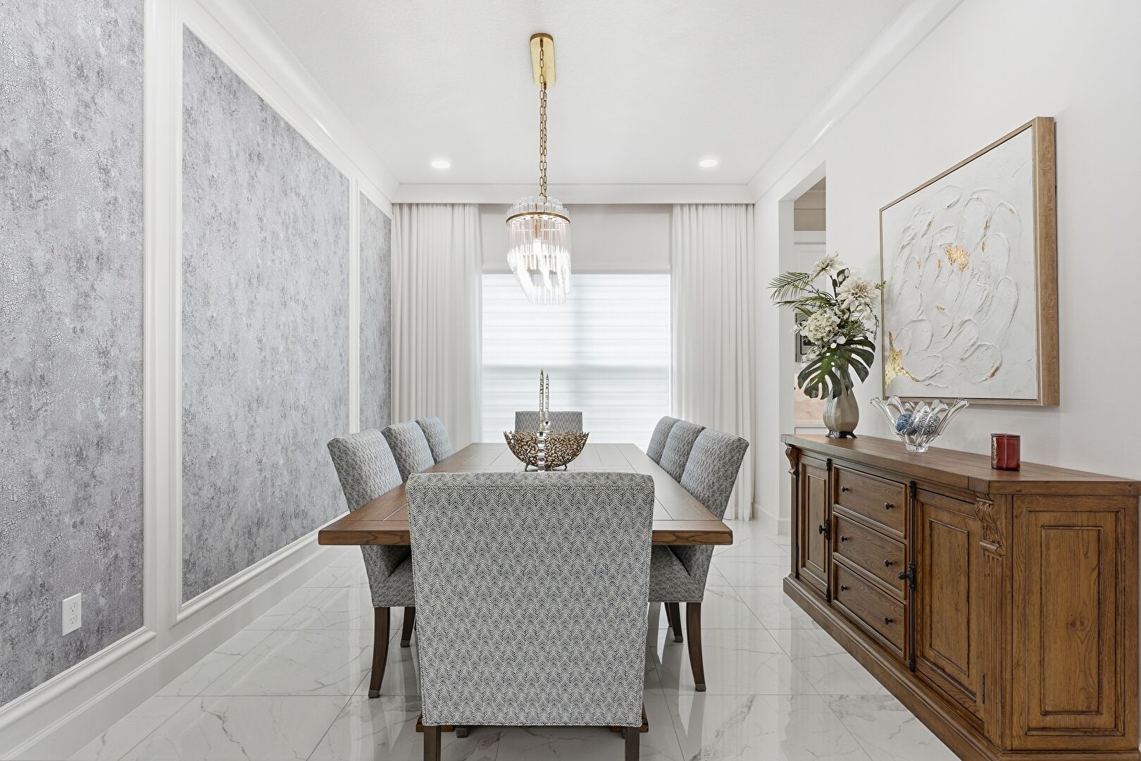 Baseboards Wall, Crown Molding, Marble Finish Floor, Natural Light, Notable Chandelier, Drywall, Recessed Lighting