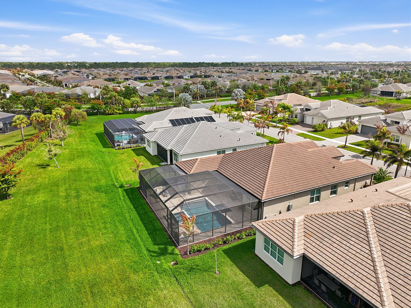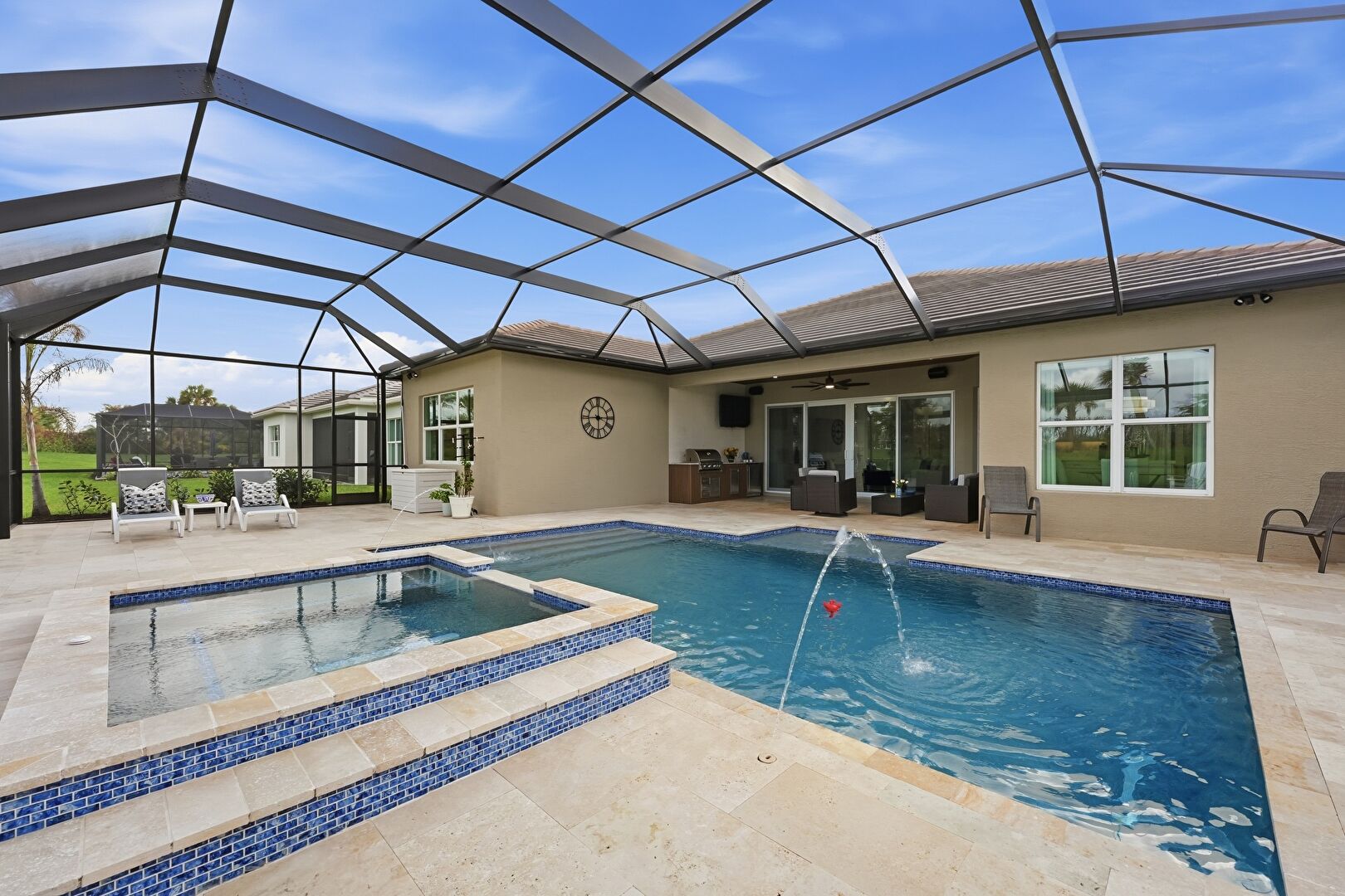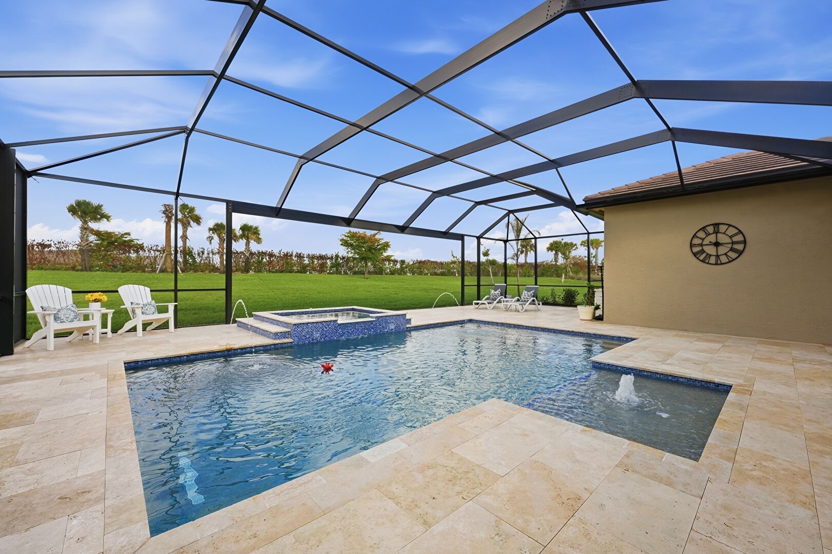 Central Ac, Fence, Handrail, Hot Tub, Lanai, Lawn, Outdoor Dining Area, Outdoor Living Space, Patio, Pool, Pool Hot Tub Combo, Pool Water Feature, Residential View, Sunroom, Handrail, Lanai, Split Ac Unit, Sunroom